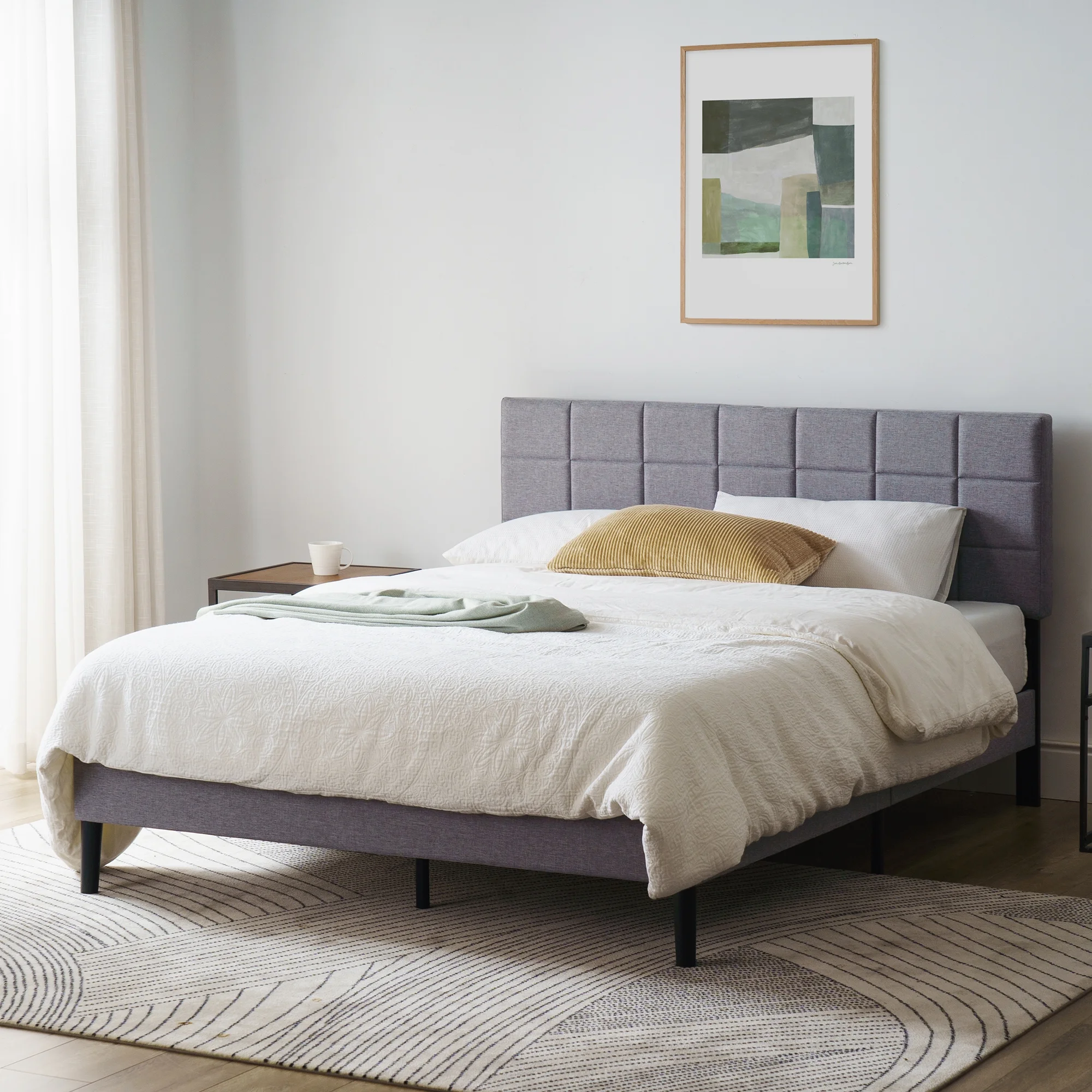 Mainstays Gray Upholstered Square Tufted Platform Bed, No Box Spring Needed, Queen