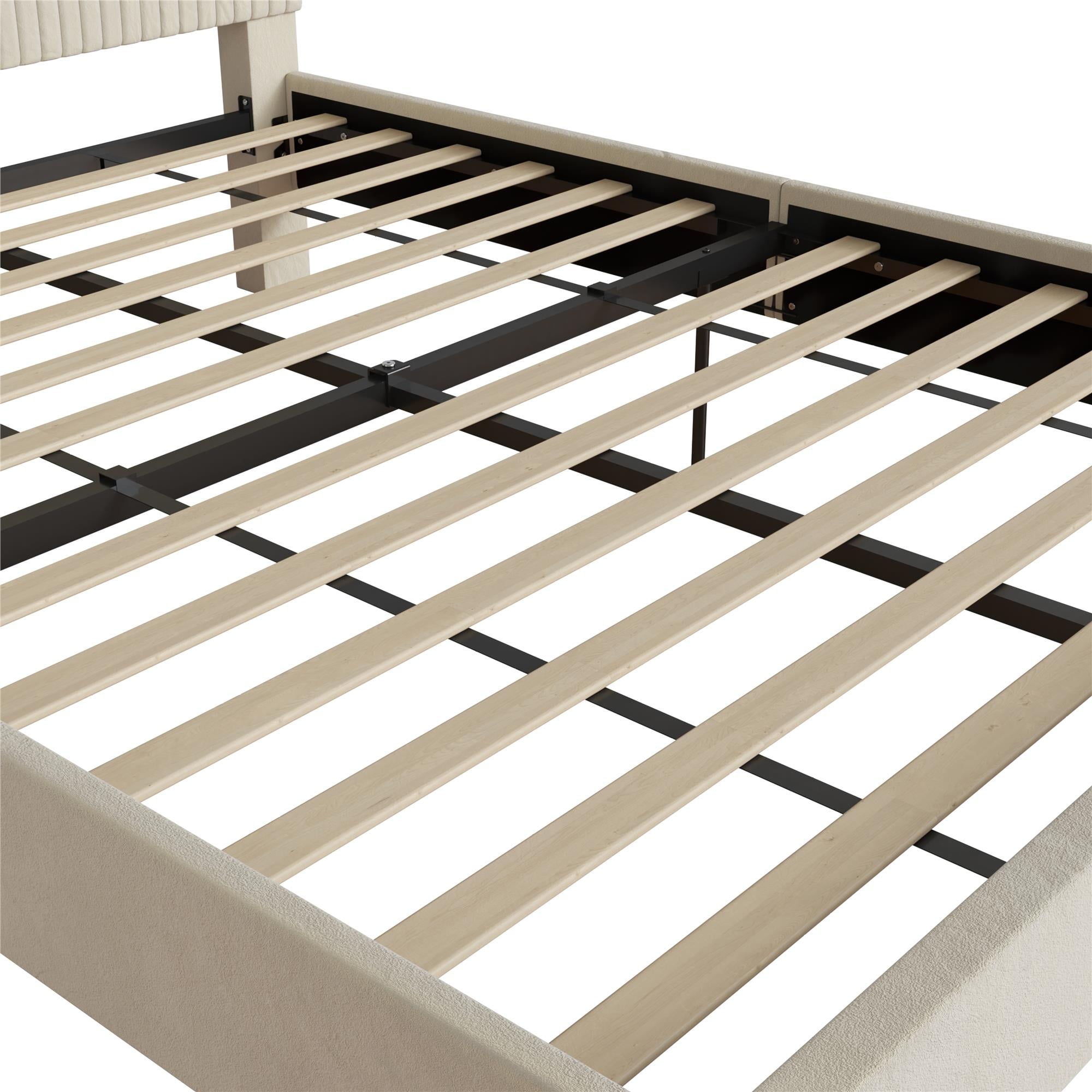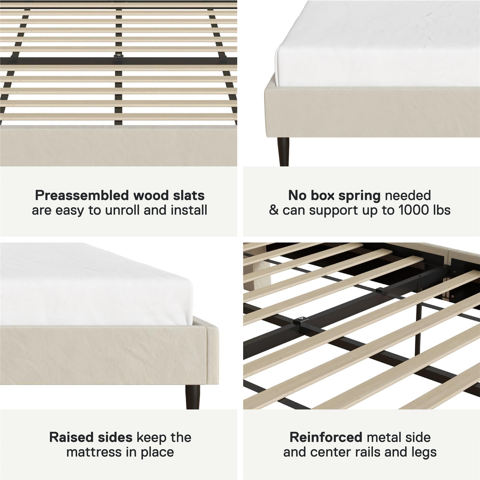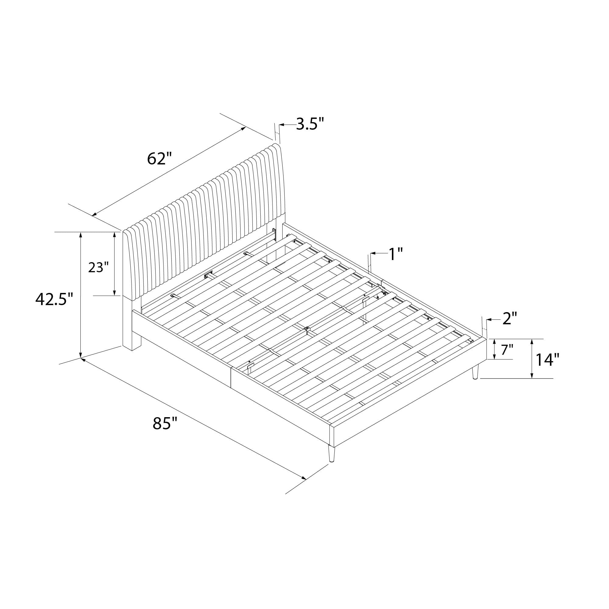 QUIET LUXURY REALIZED: Achieve modern bedroom or guestroom bliss with our contemporary upholstered platform bed frame, featuring a luxurious channel tufted headboard with fully upholstered back legs and satiny black, tapered front metal legs for chic form REACHING HEIGHTENED COMFORT: Indulge in the supple velvet fabric material covering, padded side and footboard panels, and cushioned headboard, creating a cocoon-like den of comfort with a platform bed frame that delivers on its promise of satisfying sleep SUPERIOR STYLE STRENGTH: Incorporating a solid metal frame, rails, and inside legs, the hardy bed frame, offered in queen and king size options, mightily supports up to 1000 lbs., accommodating all mattress types (8″ minimum depth) without box spring need USER-FRIENDLY DESIGN: Perfectly aligned parts, pre-rolled wooden slats with easy install hook-and-loop fasteners, and an included ratchet tool – all readily shipped in one box for your convenience – streamline the assembly process to promise smooth setup SOPHISTICATED BEDROOM SPACE: Queen size platform bed frame dimensions: 62″W x 85″D x 42.5″H. Net weight: 77 lbs. Benefit from a 1-year limited warranty against manufacturer defects. Queen size mattress sold separately. Spot clean with a lightly damp cloth