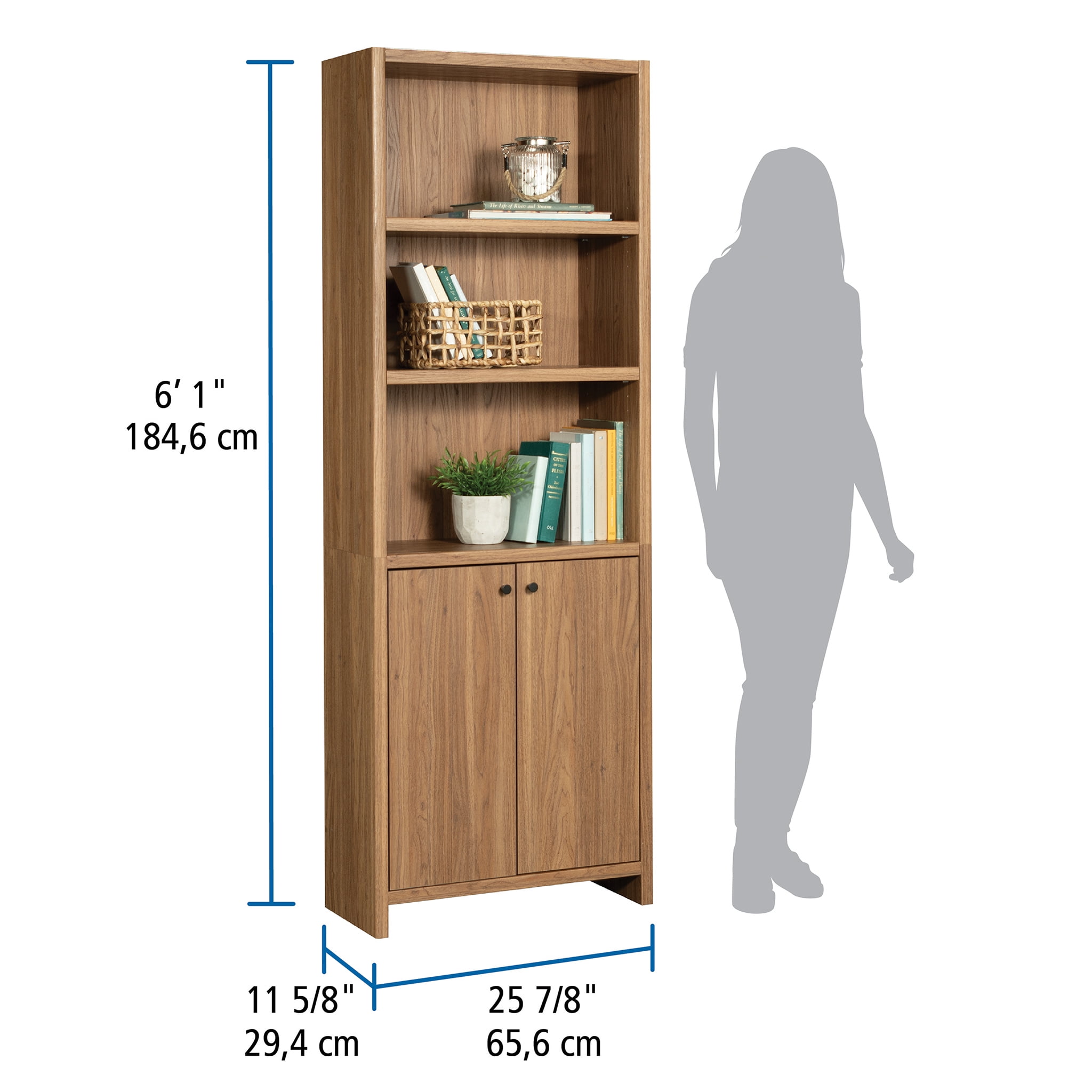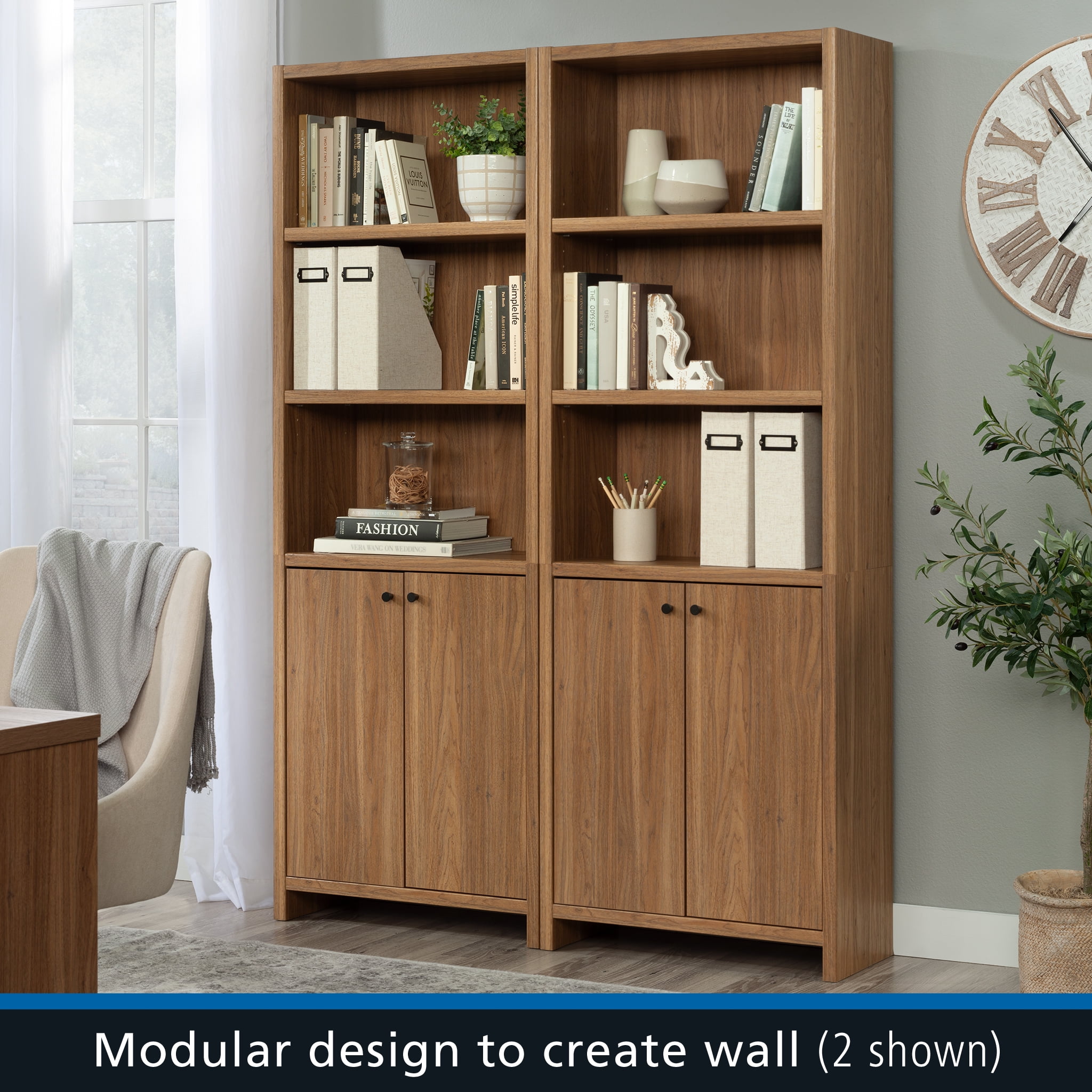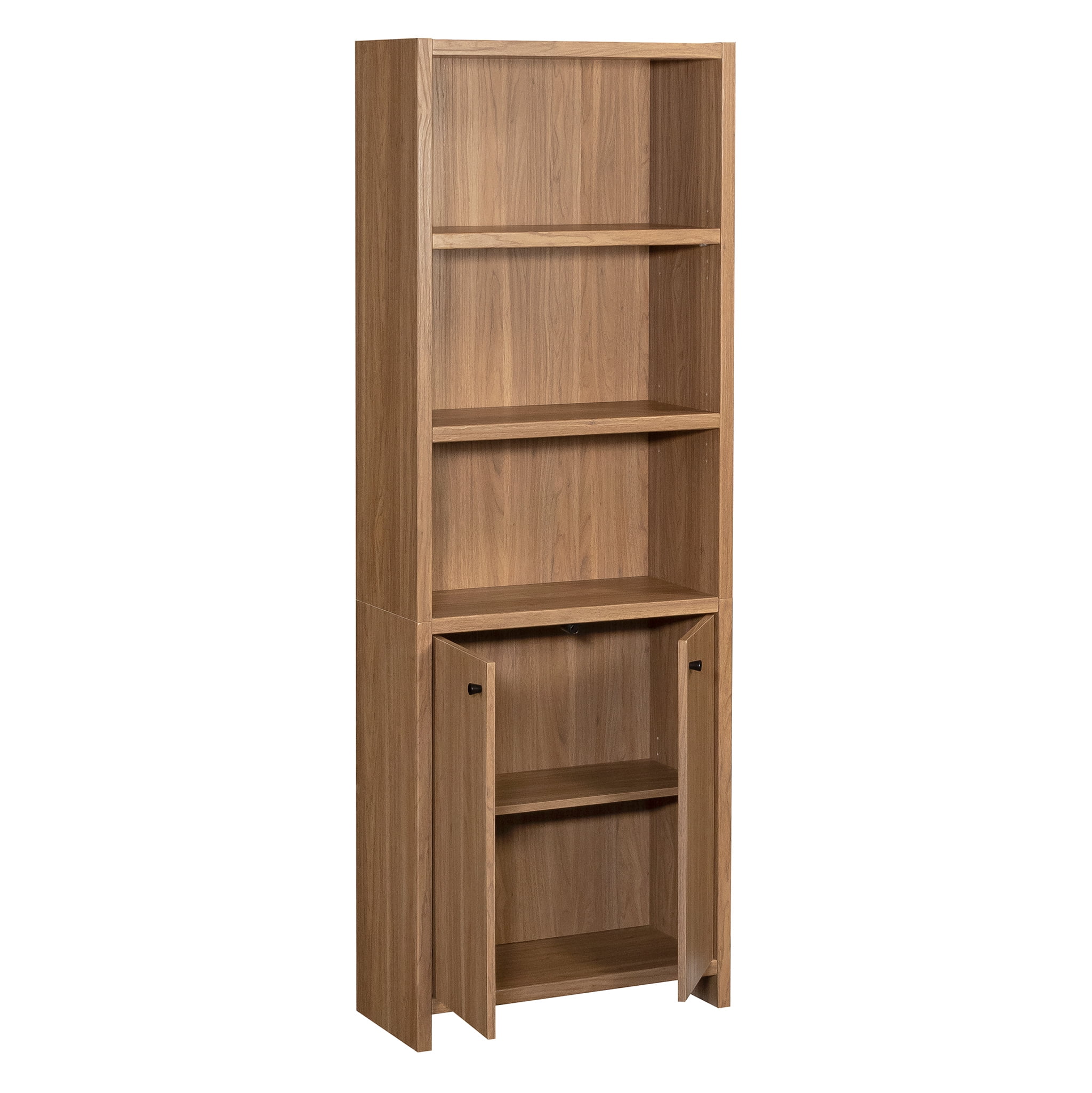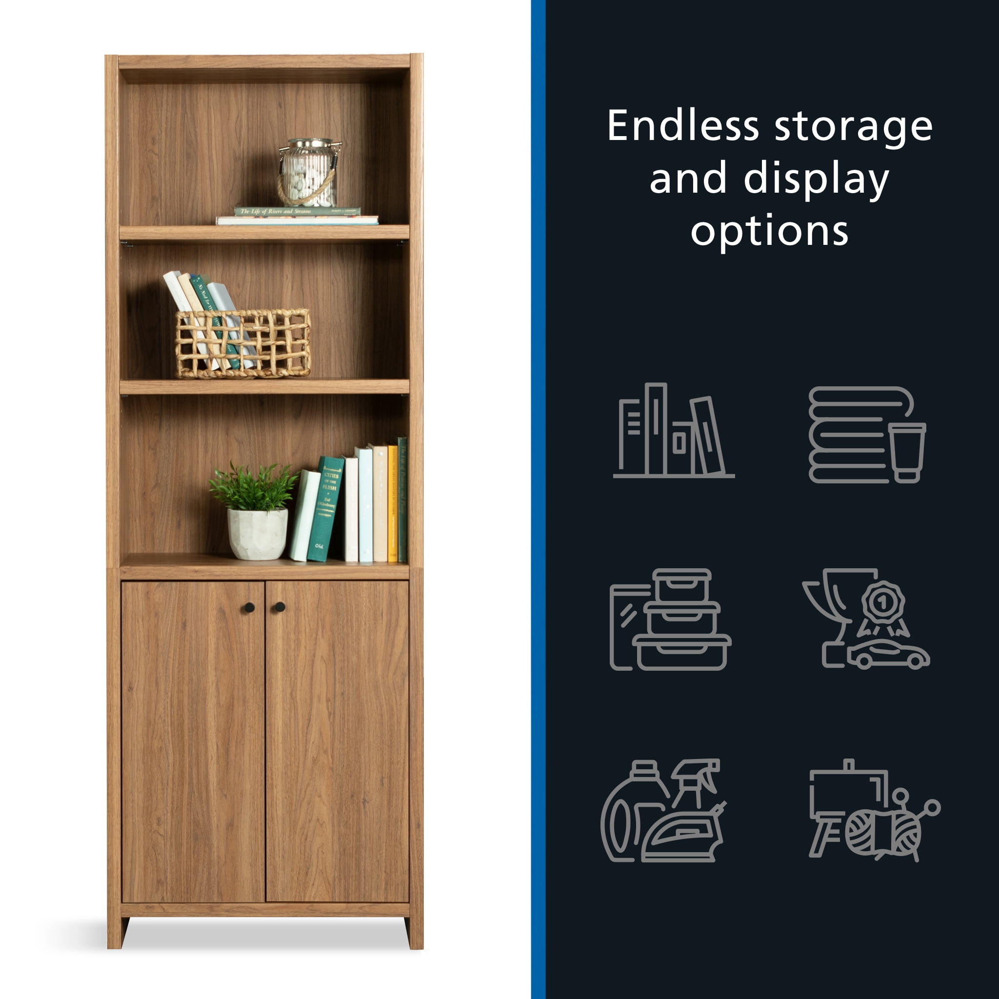 Maximize storage and elevate style with this bookcase with doors from the Mainstays Westley collection. This 5-shelf bookcase features spacious open shelving with three shelves, ideal for showcasing and organizing a variety of items such as books, home décor, organizing bins, and cherished family photos. Enhance flexibility with two adjustable shelves that can be easily moved to different heights, accommodating items of diverse shapes and sizes. Behind the doors of this engineered wood bookcase, discover a hidden storage area with another adjustable shelf for convenient organization of miscellaneous household items. Finished in an inviting Warm Walnut and embellished with attractive hardware, this 5-shelf bookshelf seamlessly combines functionality with aesthetics. Any living room will exude a sense of organized elegance in no time, with strong and lightweight 1-inch panel construction that ensures durability without compromising on style. Transform any space with this stylish display bookcase, offering storage solutions while enhancing personal style.