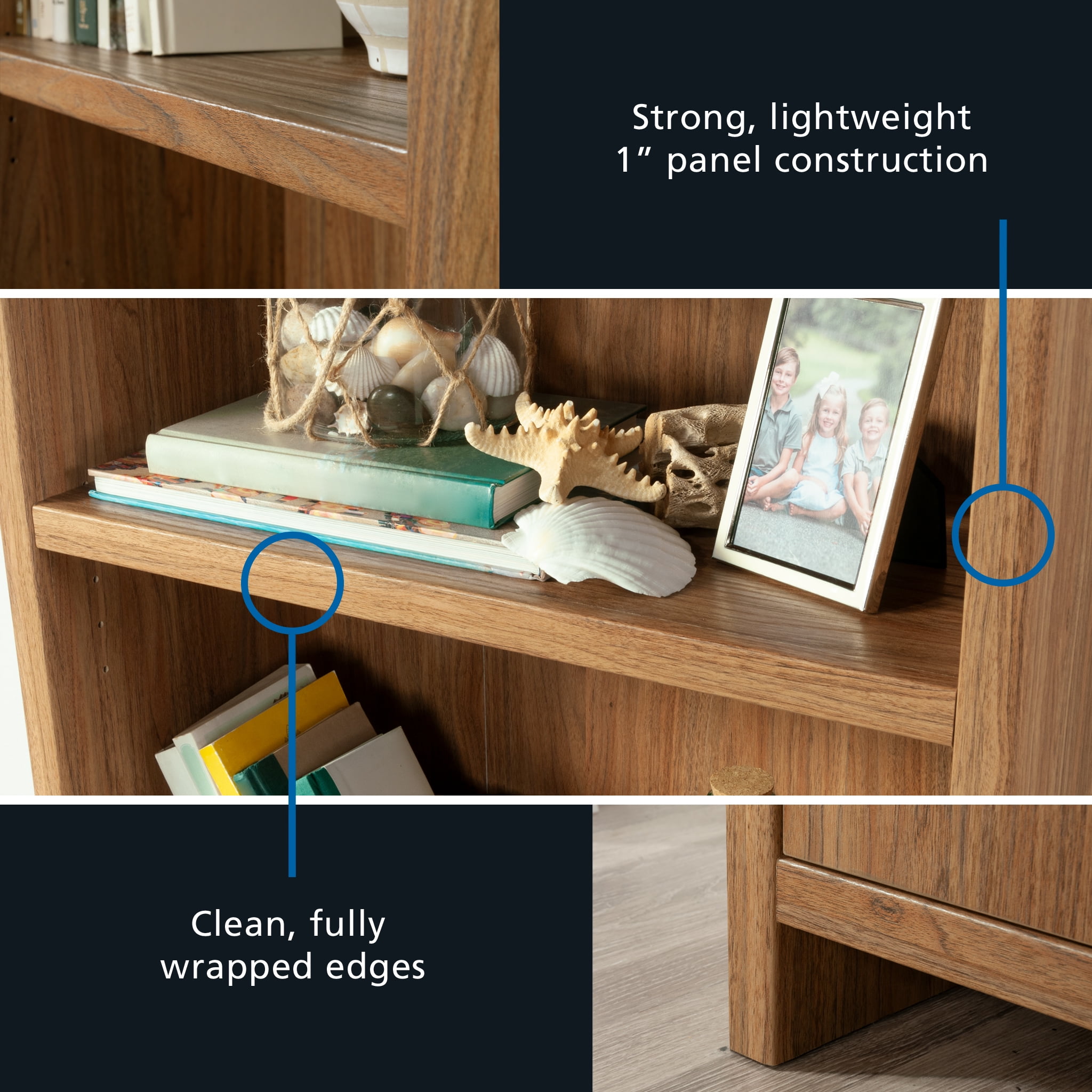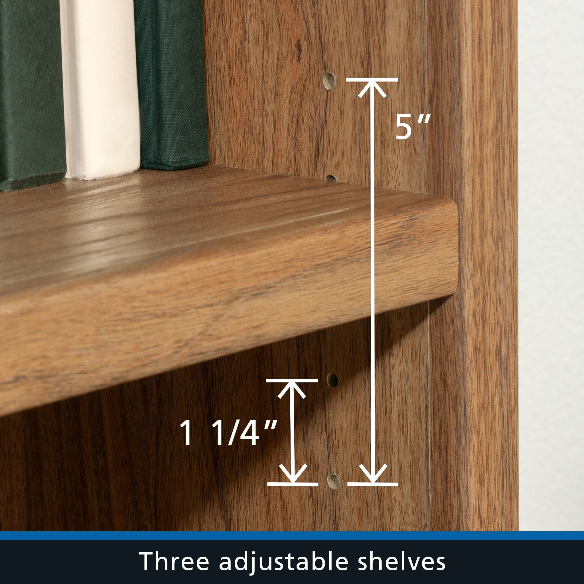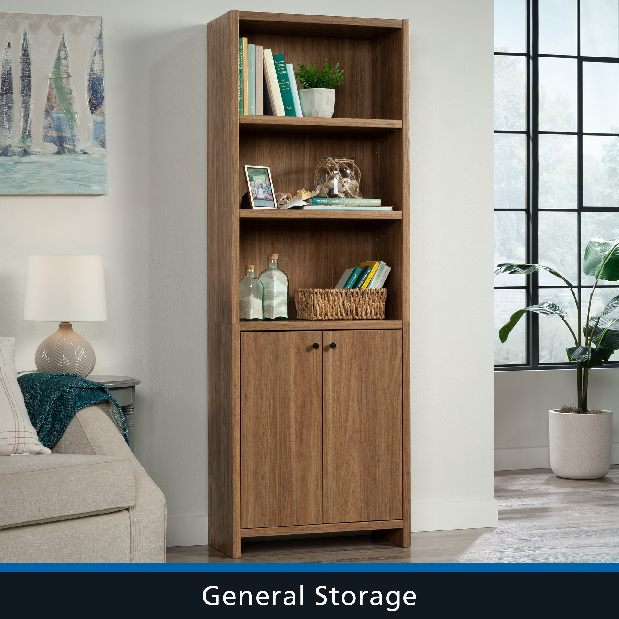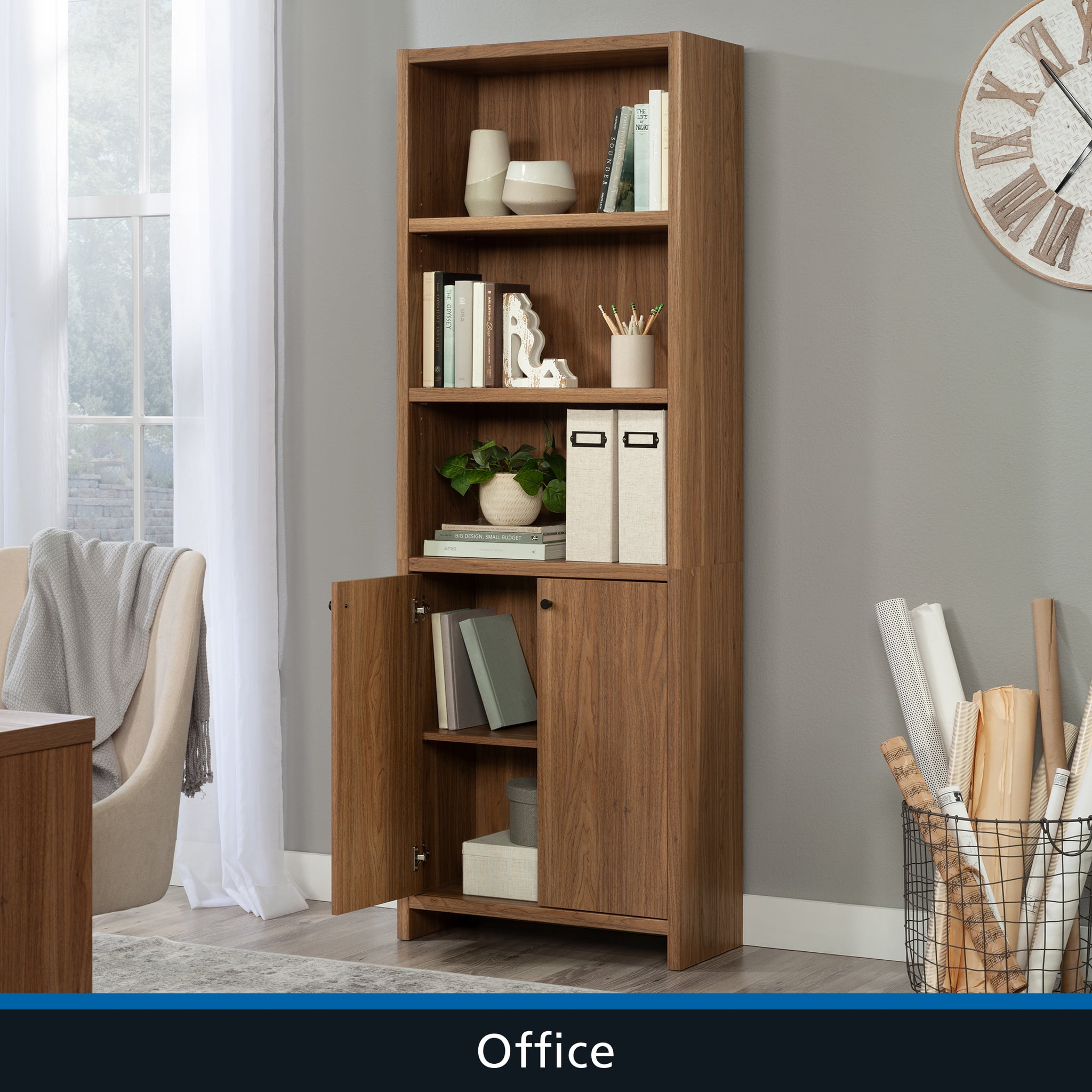Maximize storage and elevate style with this bookcase with doors from the Mainstays Westley collection. This 5-shelf bookcase features spacious open shelving with three shelves, ideal for showcasing and organizing a variety of items such as books, home décor, organizing bins, and cherished family photos. Enhance flexibility with two adjustable shelves that can be easily moved to different heights, accommodating items of diverse shapes and sizes. Behind the doors of this engineered wood bookcase, discover a hidden storage area with another adjustable shelf for convenient organization of miscellaneous household items. Finished in an inviting Warm Walnut and embellished with attractive hardware, this 5-shelf bookshelf seamlessly combines functionality with aesthetics. Any living room will exude a sense of organized elegance in no time, with strong and lightweight 1-inch panel construction that ensures durability without compromising on style. Transform any space with this stylish display bookcase, offering storage solutions while enhancing personal style.