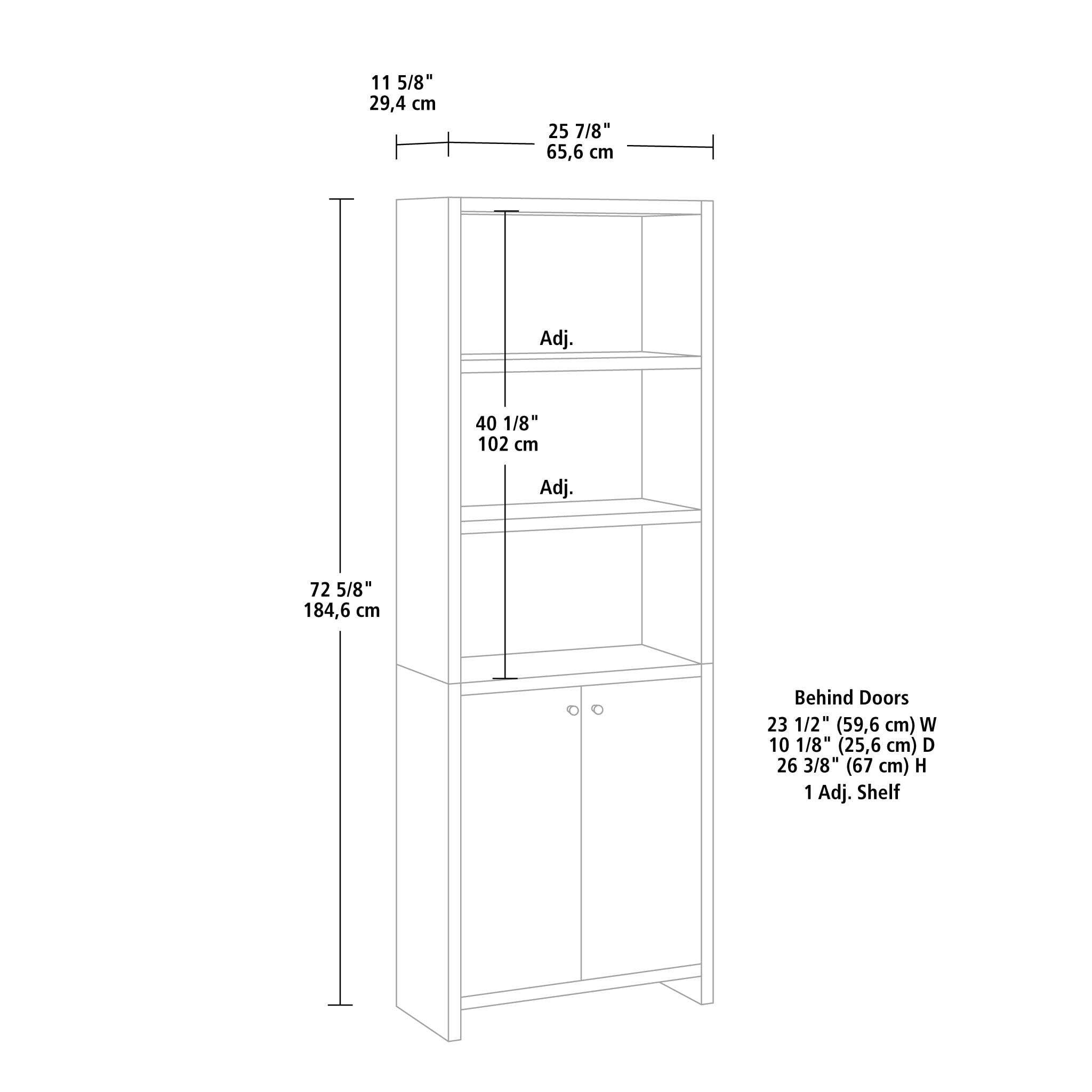 Assembled Dimensions: 25.83″ L X 11.58″ W X 72.68″ H Strong and lightweight 1” panel construction ensures durability without compromising style Hidden storage behind doors to conceal clutter Three adjustable shelves for flexible storage options Warm Walnut finish Model #: 437357 For additional questions or any issues, please contact the manufacturer at 1-800-523-3987. Be sure to check out the Mainstays Westley collection for more great items!