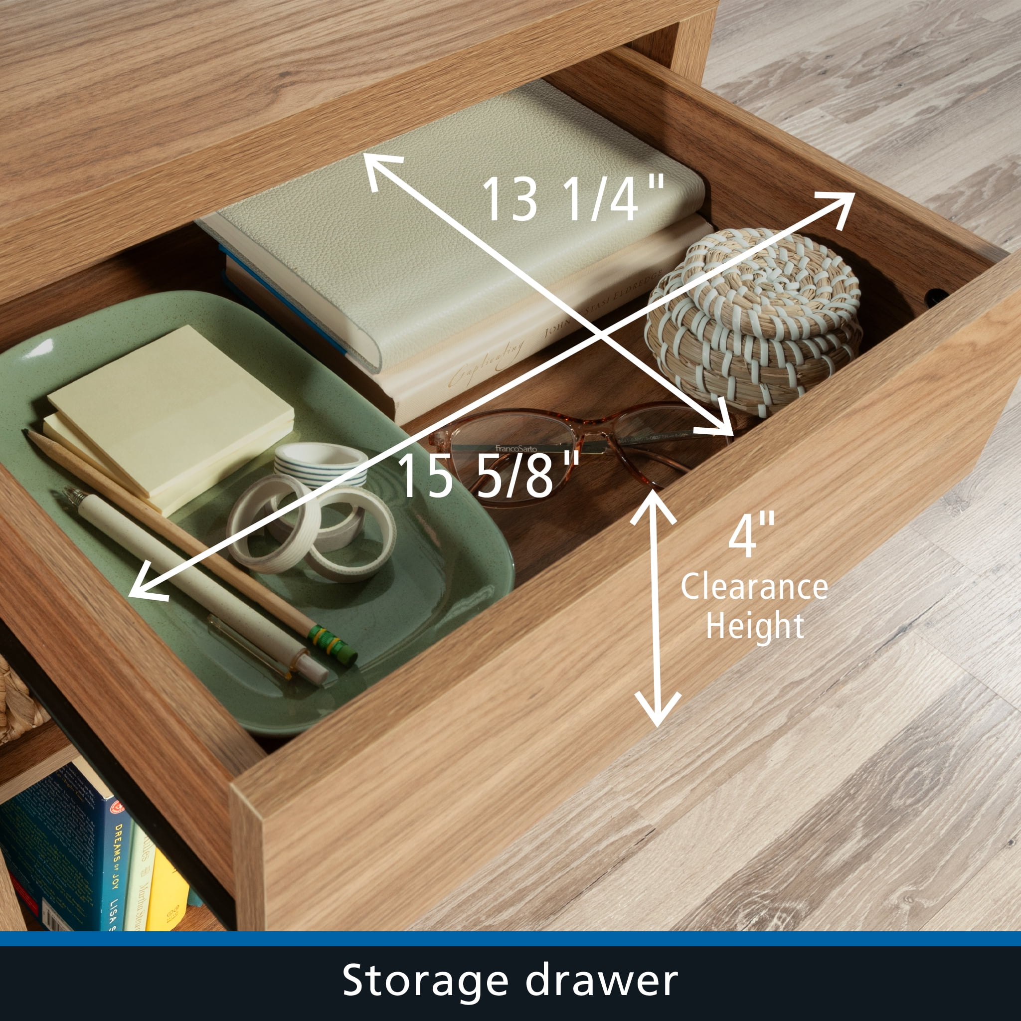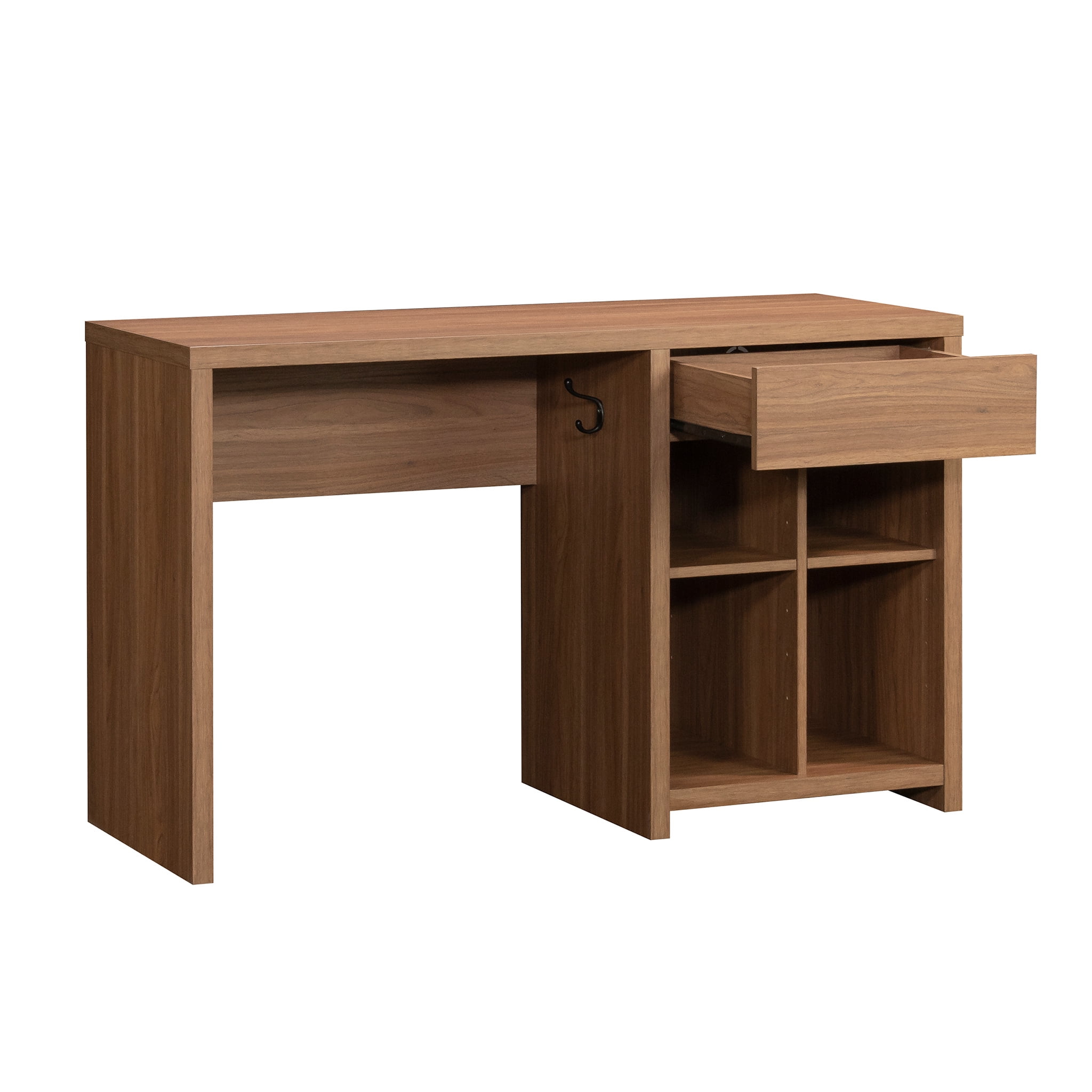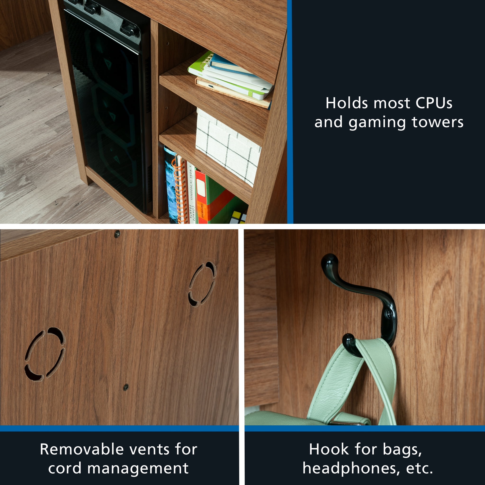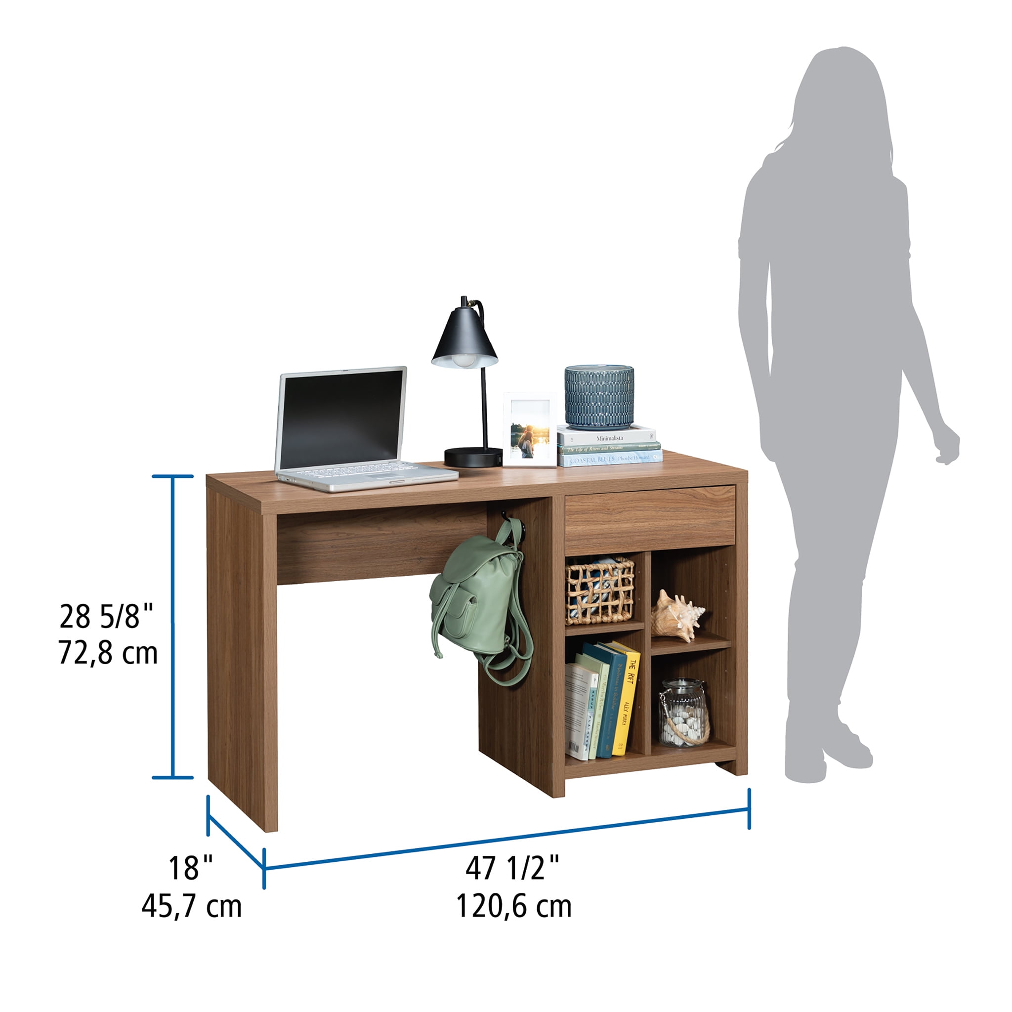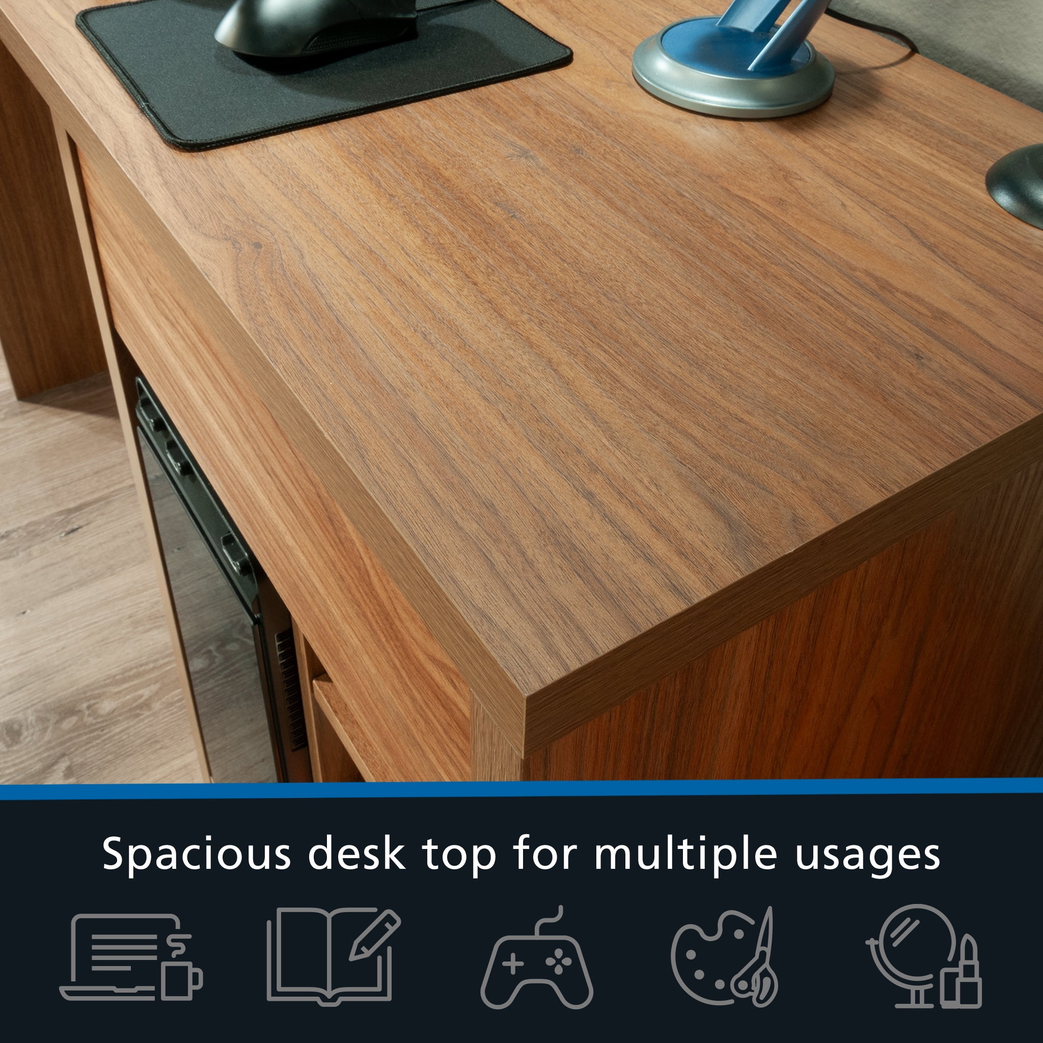 Bring a touch of transitional design and convenience to any home with the Mainstays Westley collection computer desk, perfect for creating the ideal workspace. This contemporary computer desk offers open storage with two adjustable shelves for flexibility. One of the small shelves can be removed to accommodate a tall CPU tower for gaming activities. This home office desk has a spacious top surface that provides ample room for desk essentials like a laptop, lamp, and desktop printer. Whether used as a gaming desk or not, this storage computer desk features a hook on the inside panel, ideal for hanging headphones. A top drawer with metal runners and safety stops for easy access to smaller supplies offers extra storage space where it’s needed most. With a cable management system in the back panel to reduce cord clutter, this modern computer desk is both functional and stylish. Finished in stylish Warm Walnut, it embodies a transitional style that seamlessly blends traditional design with contemporary flair, elevating any space from adequate to amazing.