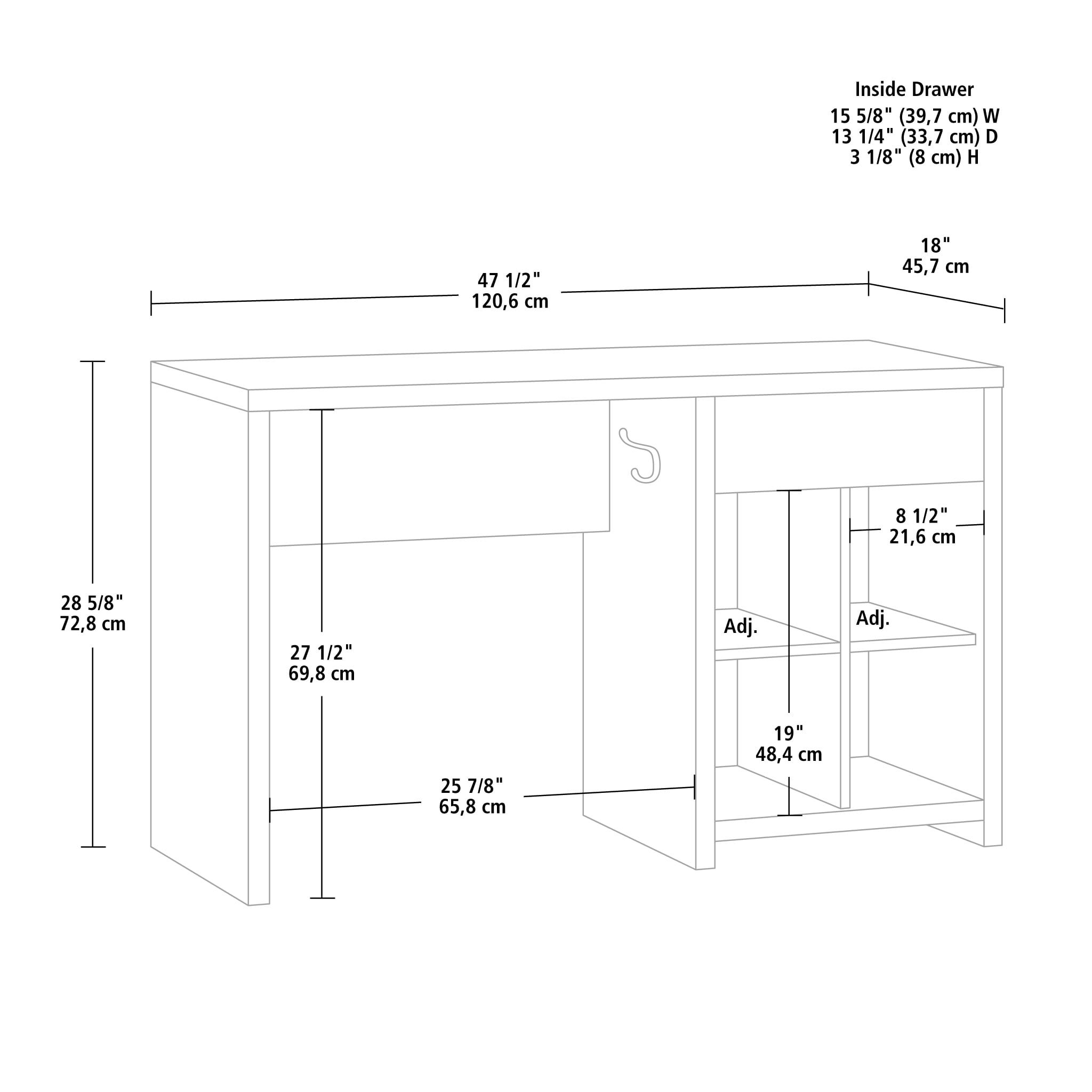 Assembled Dimensions: 47.24″ L X 17.99″ W X 28.66″ H Drawer features metal runners and safety stops Open storage features two adjustable shelves Small shelf can be removed to create space for CPU tower to accommodate gaming Hook on inside panel for storing headphones Cable management in back panel Warm Walnut finish Model #: 442023 Box Dimensions: 52.99″ L x 20.75″ W x 7.24″ H For additional questions or any issues, please contact the manufacturer at 1-800-523-3987. Be sure to check out the Mainstays collection for more great items!