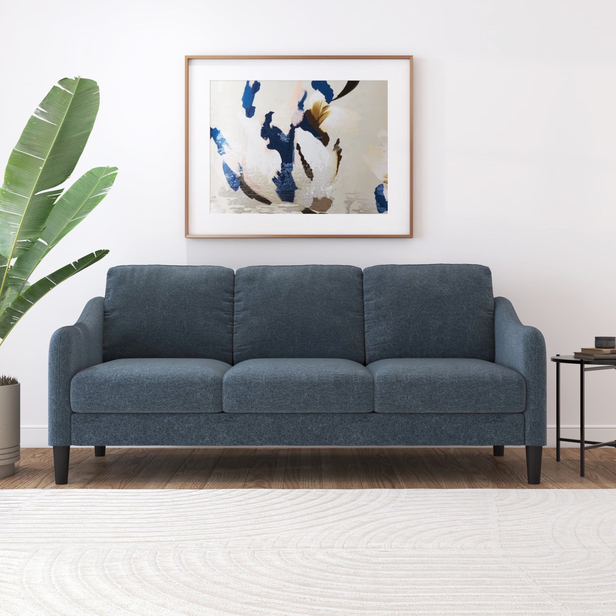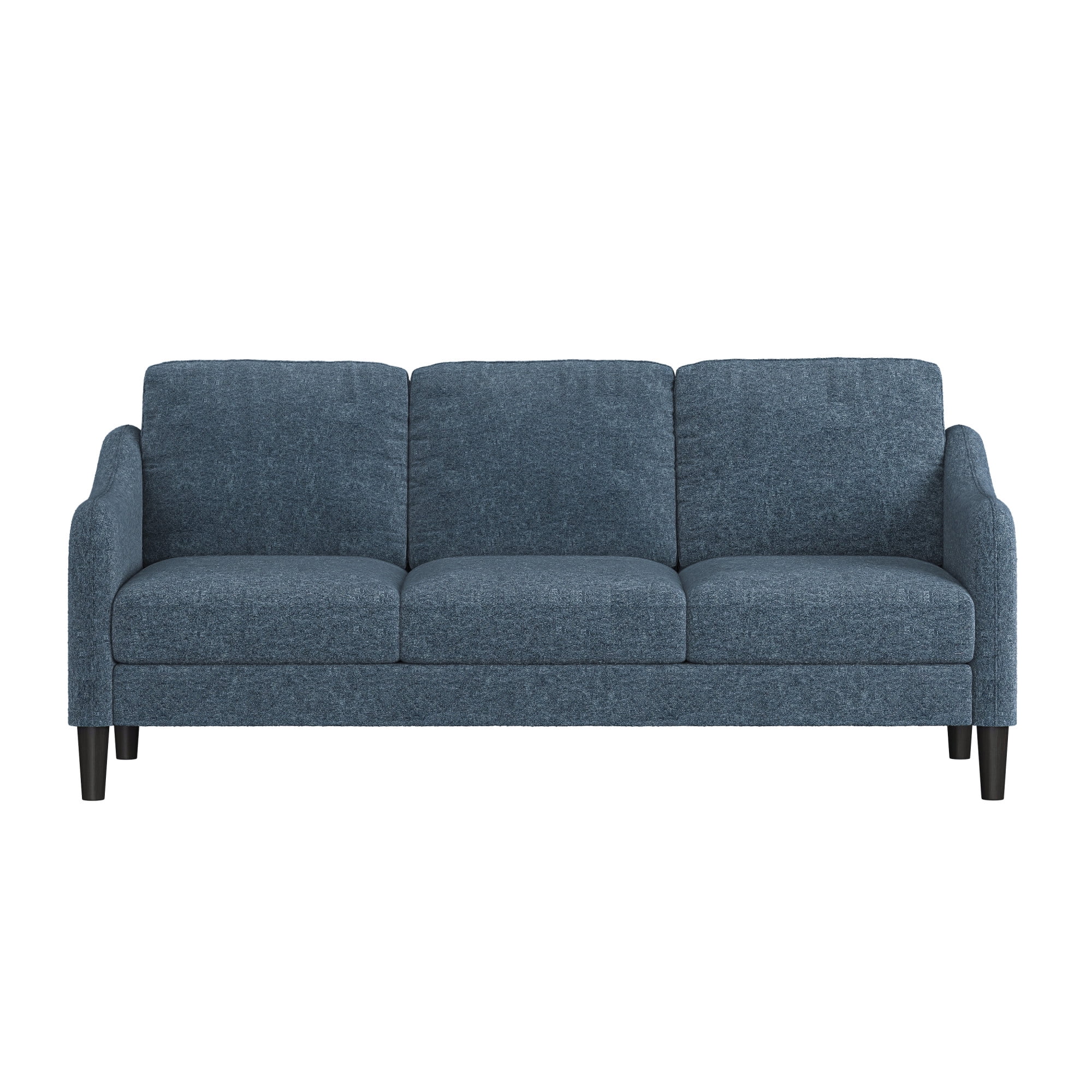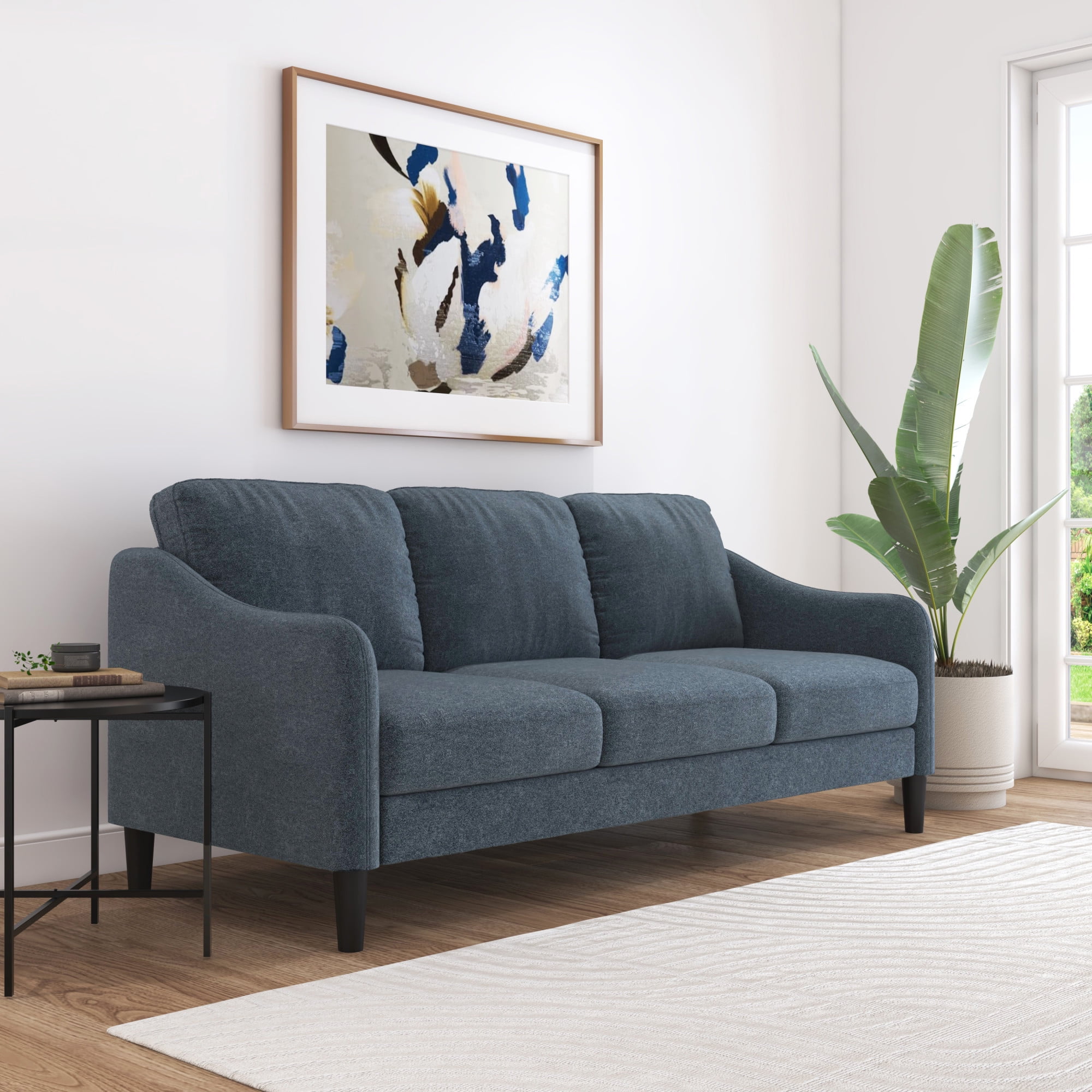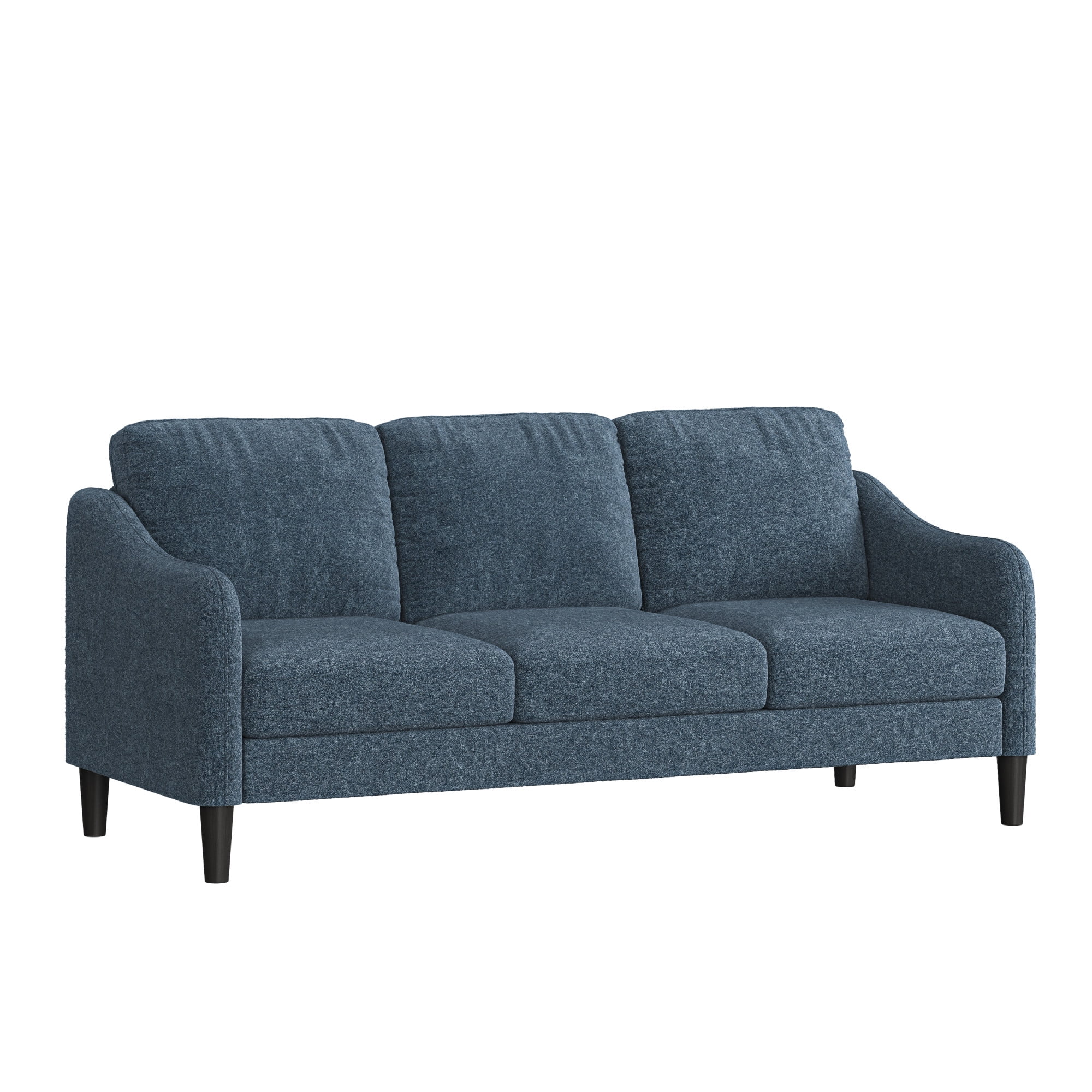 This low profile sofa gives you a reason to relax, making it the perfect modern addition to any small or medium living space. The trendy slope arms of the sofa, sturdy tapered legs and welting details provide the clean, contemporary look that will continually accommodate your evolving style. This blue adult indoor couch is perfect for those looking to ground their space with a timeless feel, and its three-cushion design makes for a great place to gather with loved ones, take a nap, or settle in for a movie night. The sturdy wood construction and soft, durable fabric cushions make this upholstered piece a classic, sustainable addition to any household. Assembly required.