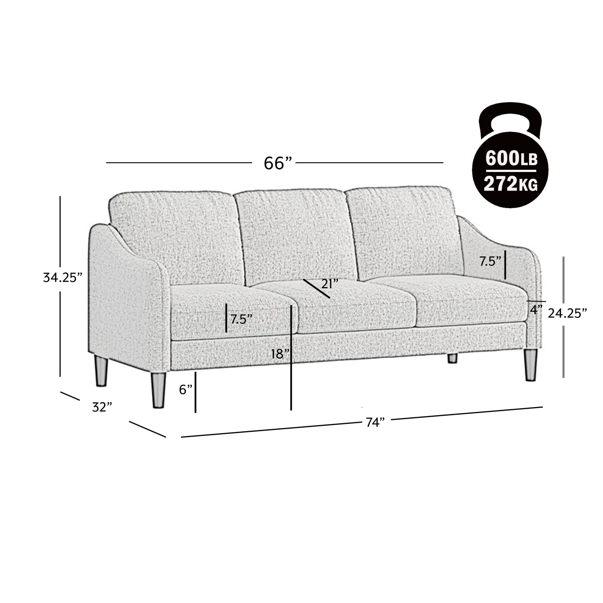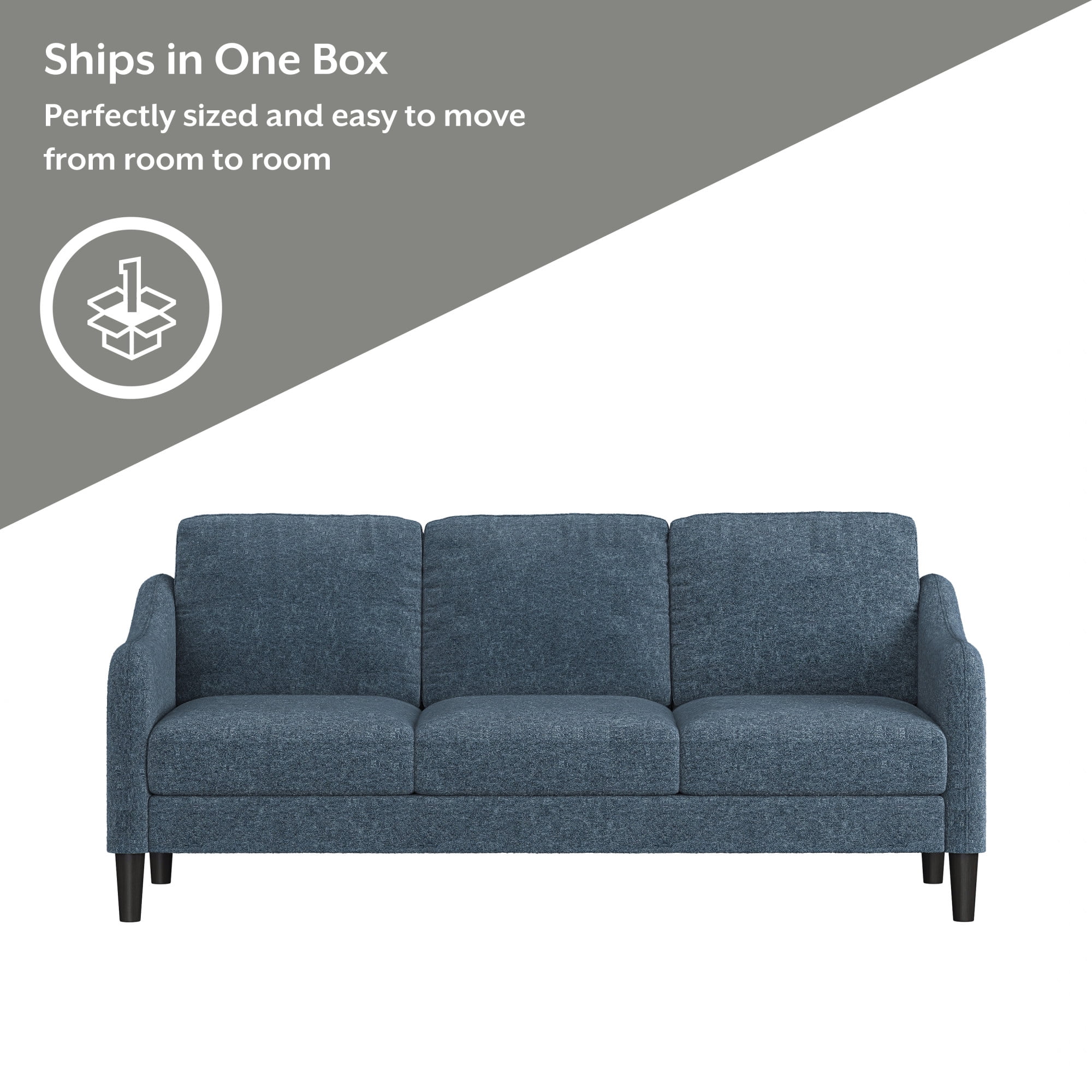 Contemporary, modern 3-seater swooped arm indoor sofa Upholstered in soft textured blue 100% polyester fabric Plastic legs finished in black support stability and durability Overall Dimensions: 34.25H x 74W x 32D Assembly required Ships one adult couch per one box A versatile design that’s constructed to last Spot clean with a damp cloth or sponge Recommended Maximum Weight Capacity: 600lbs For residential usage only