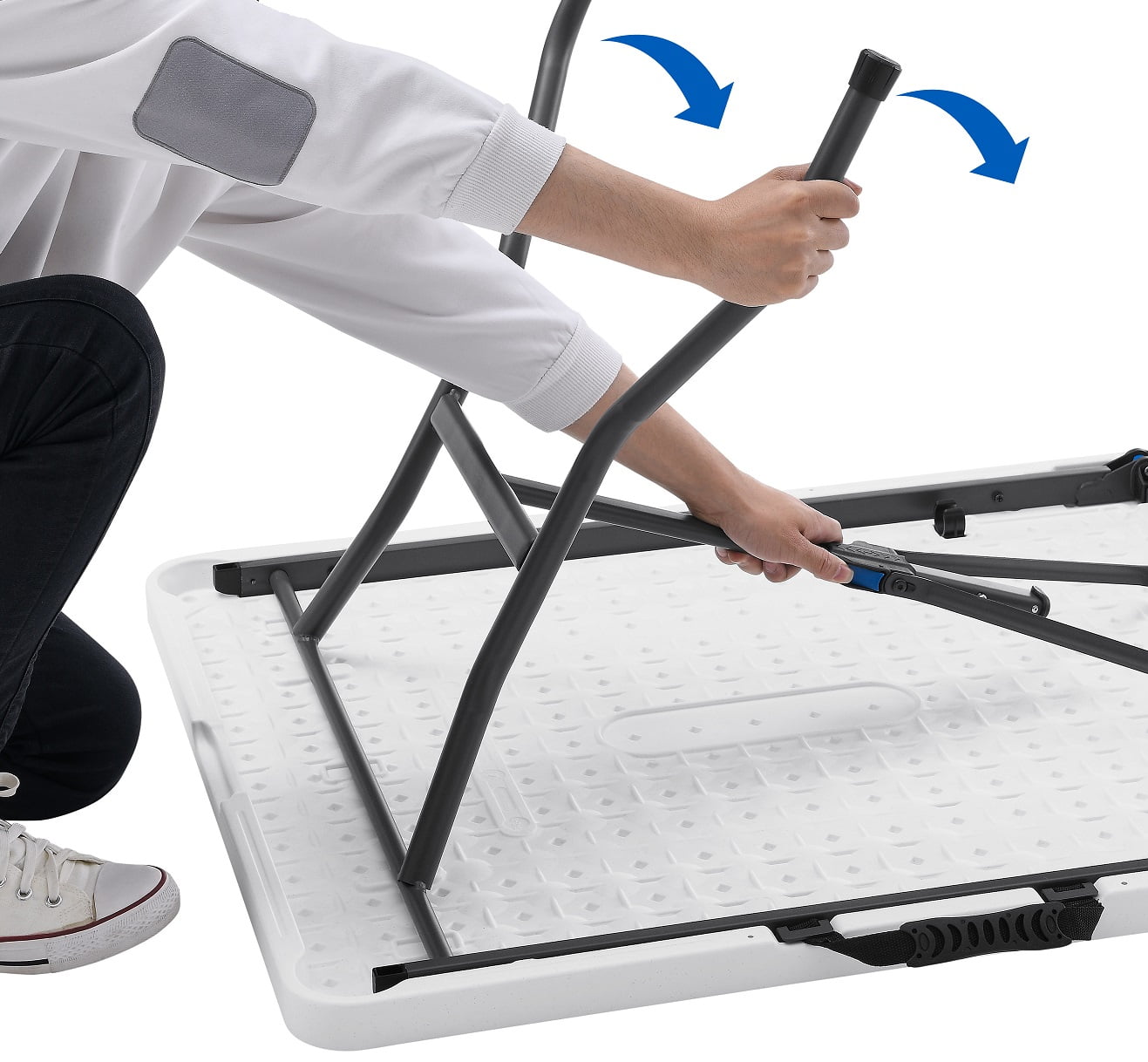 This lightweight 6-foot folding table from Mainstays, sets up in seconds for extra room at parties or picnics. Our pinch free button allows for easy collapsing of legs and has a locking and unlocking system for folding, plus the carry handle makes it perfect for taking it on-the-go. The scratch- and stain-resistant resin surface ensures lasting durability and easy clean up, while the rust resistant powder coated steel frame offers a strong and stable structure. The Mainstays 6-foot fold-in-half table in white granite is perfect for all your needs and occasions, great for everyday use both indoors and outdoors.