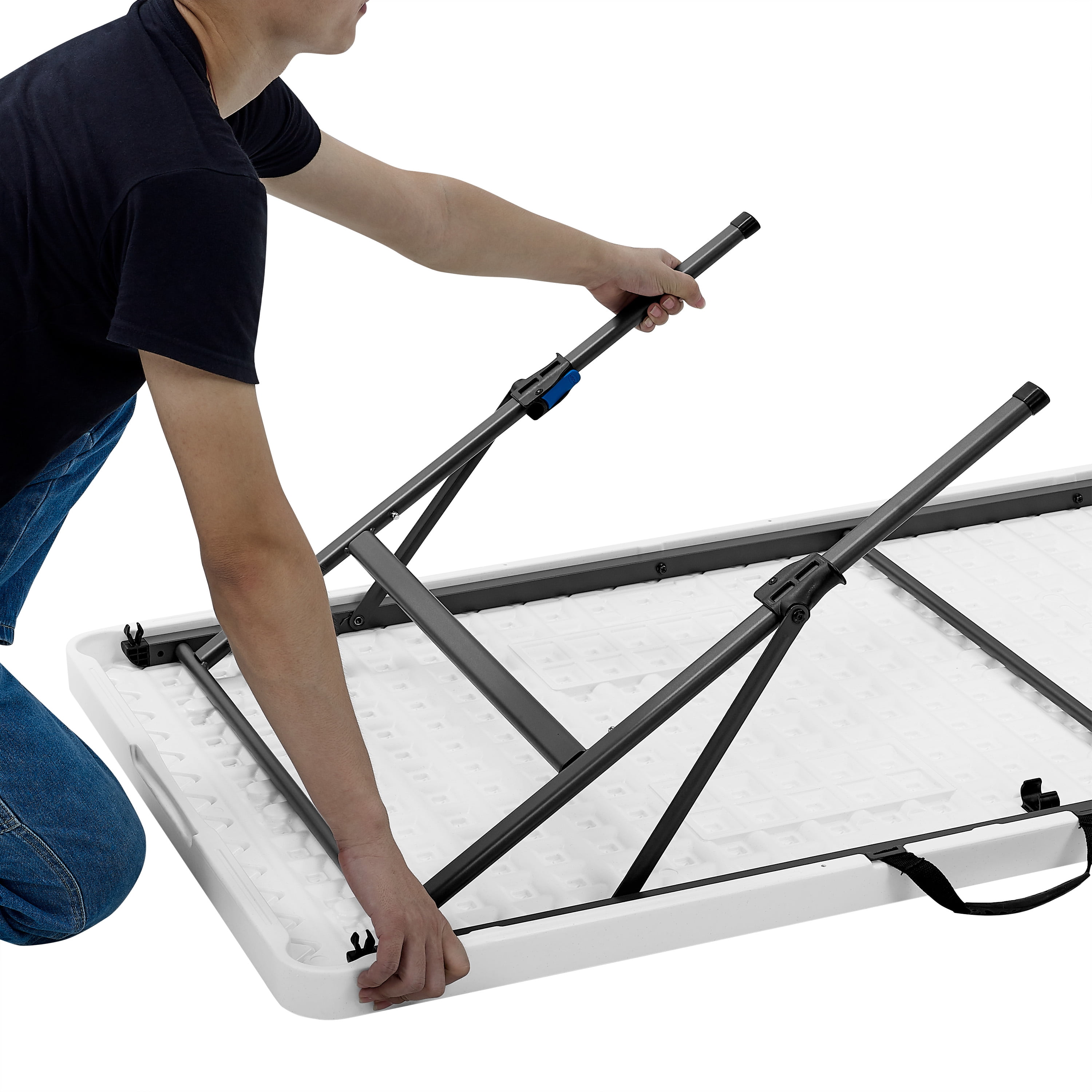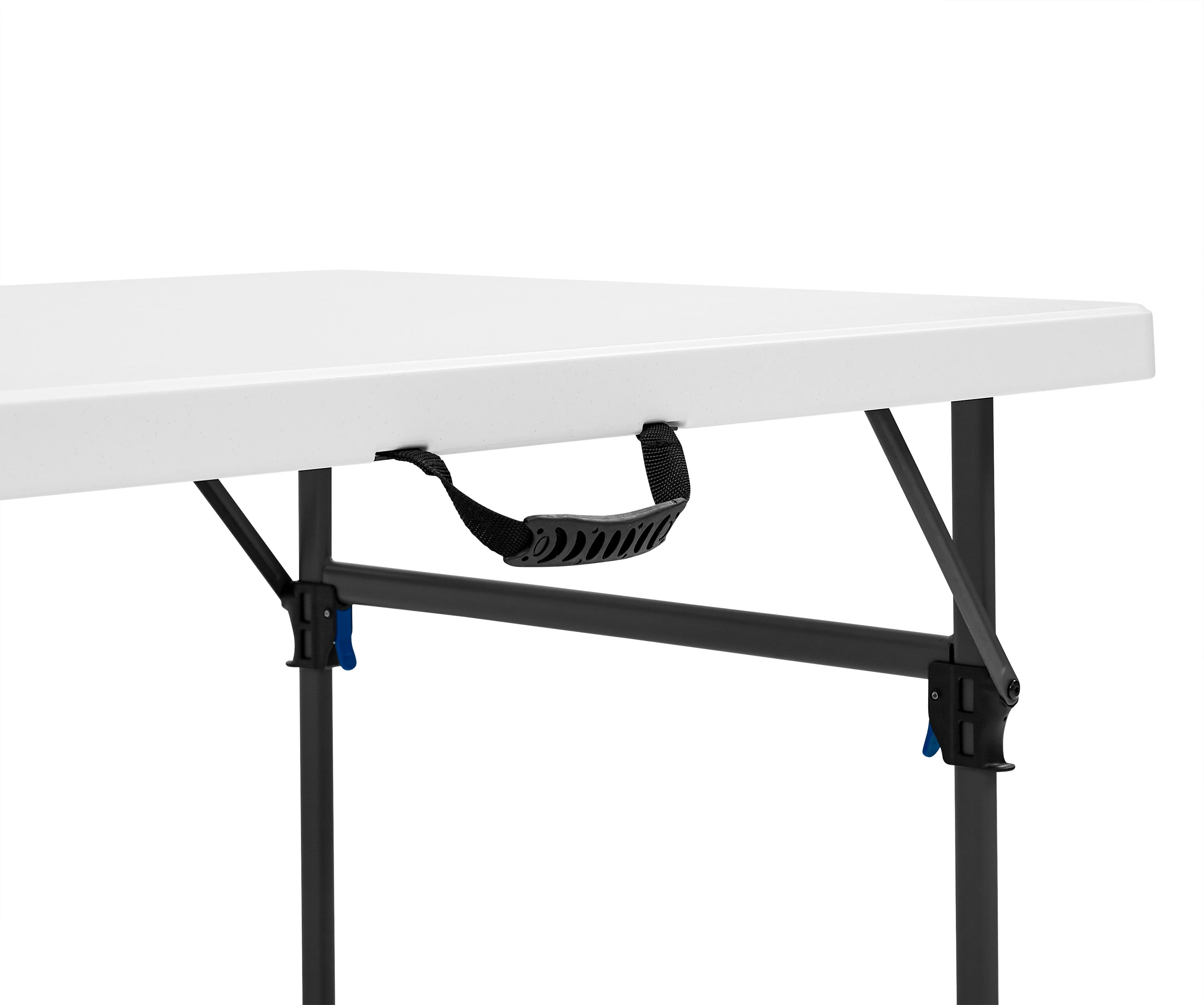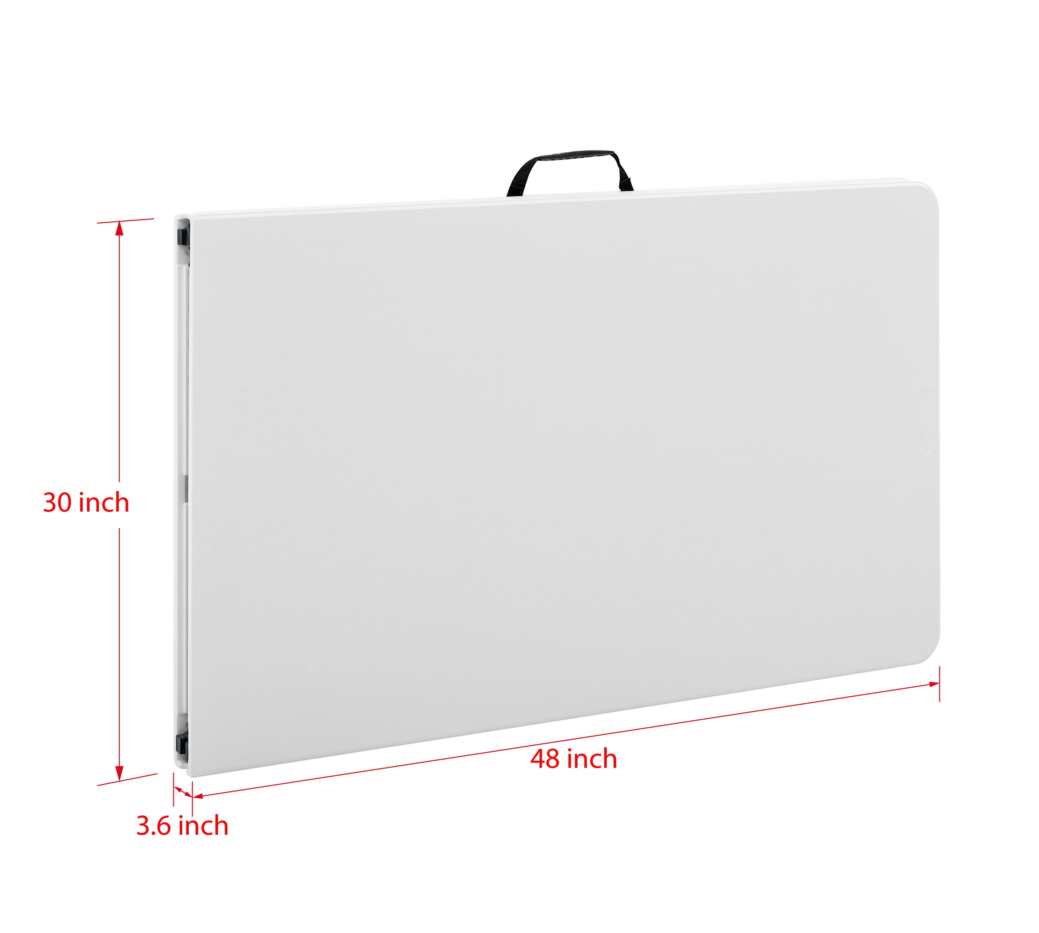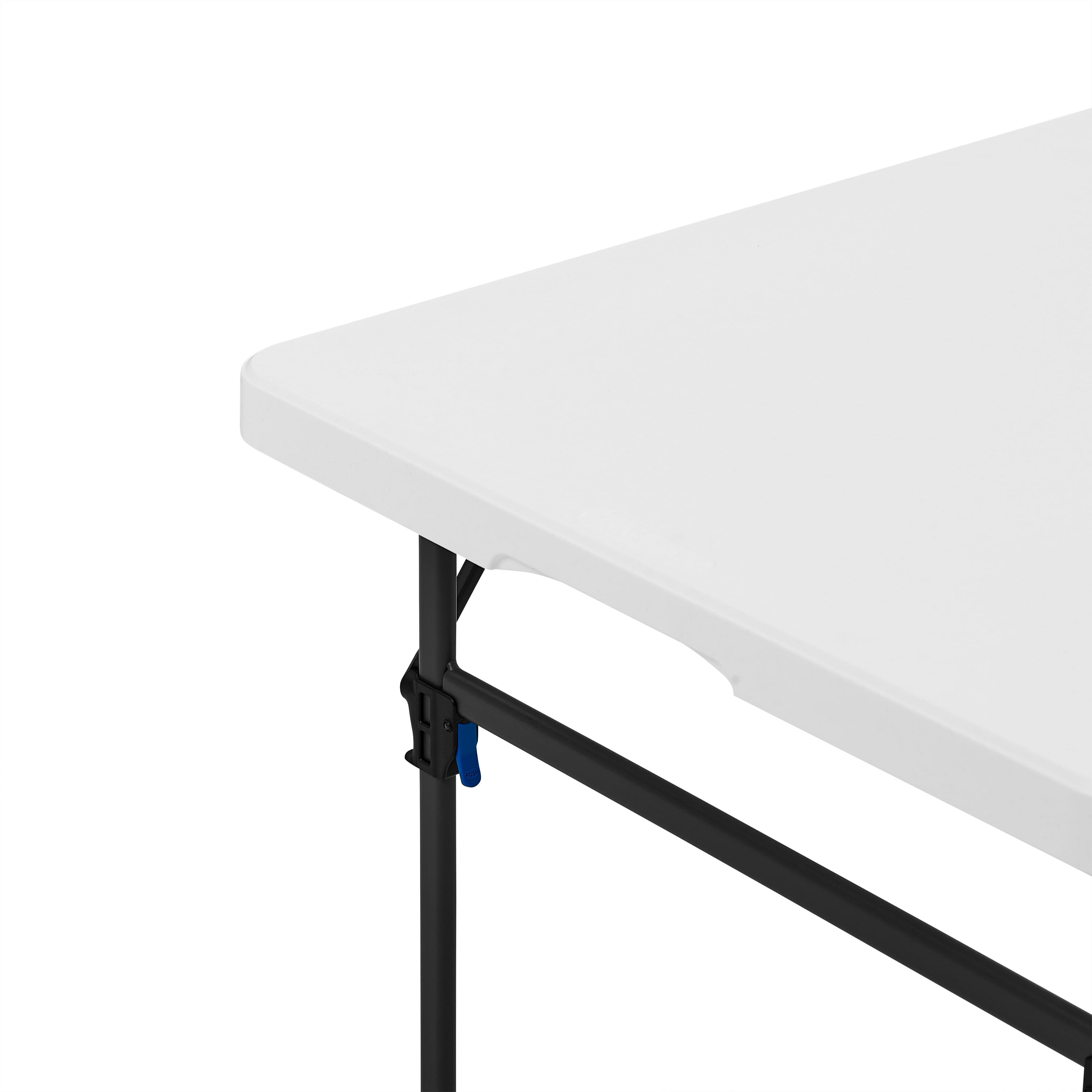Mainstays 8 Foot Fold-in-Half Resin Table, White Assembled Dimensions: 96″ x 30″ x 29″ Comfortably seats 8 adults Extra middle leg and support sidebars for an additional stable structure Easily folds in half for convenient storage or transport Constructed of UV-Protected high-density polyethylene plastic and black powder-coated steel Includes built-in carry handle, for easy transportation Built for indoor and outdoor use Durable Caps on legs to prevent floor damage No assembly is needed, can be open and folded in a few seconds Folded dimension: 48.03″ L x 30.00″ W x 3.62″ H Weight: 41.18 lbs. Weight Capacity: 500 lbs. Perfect for your home, office, or outdoor activities