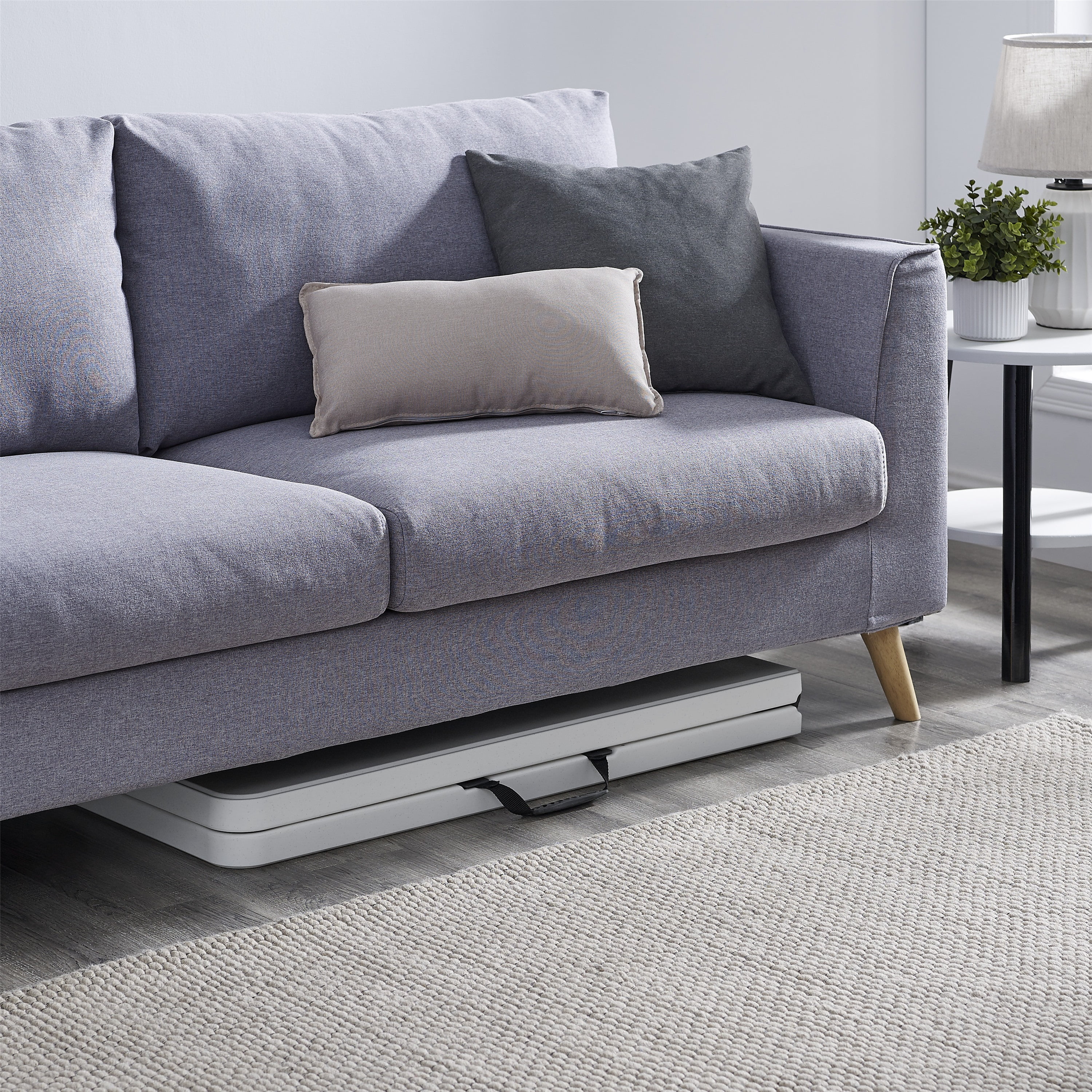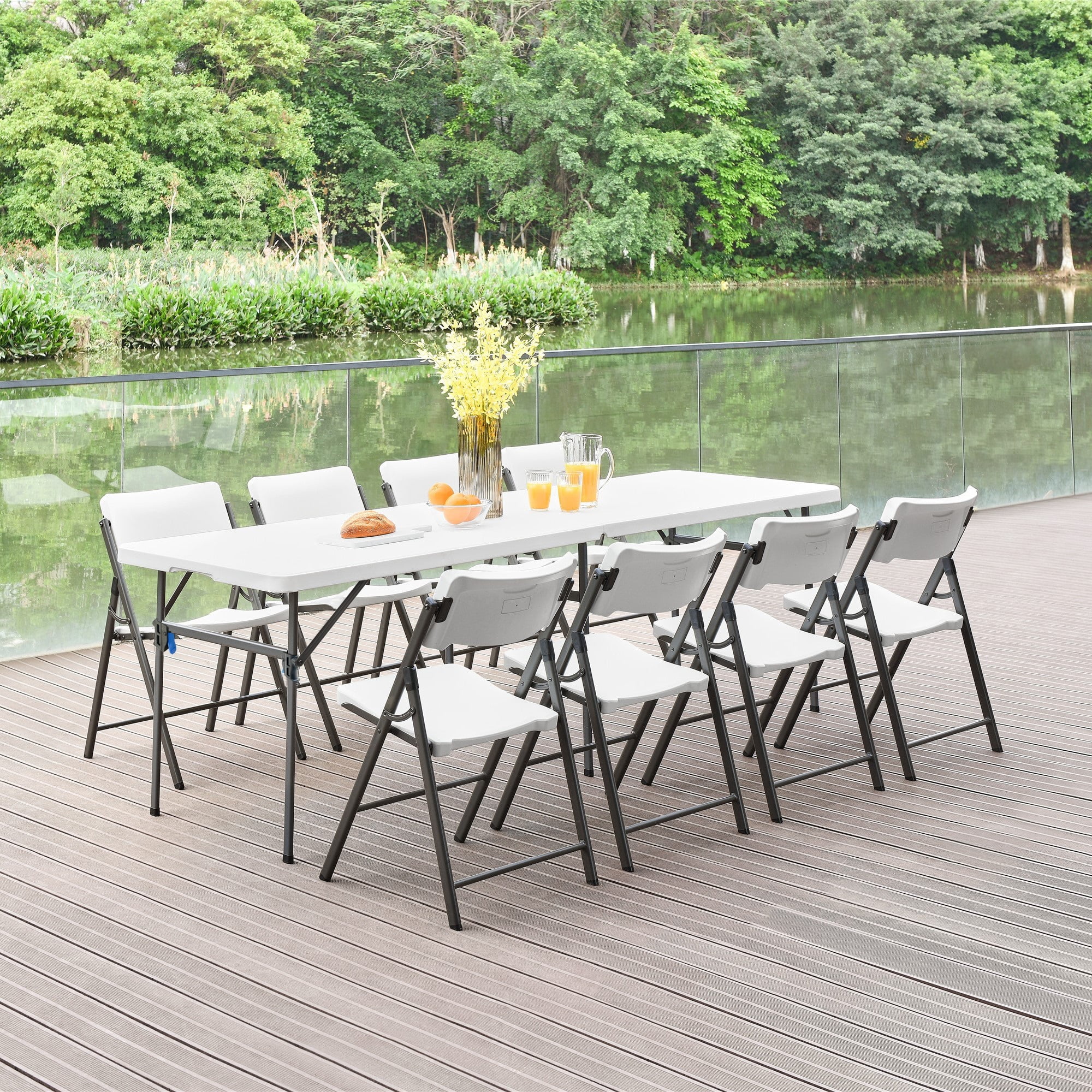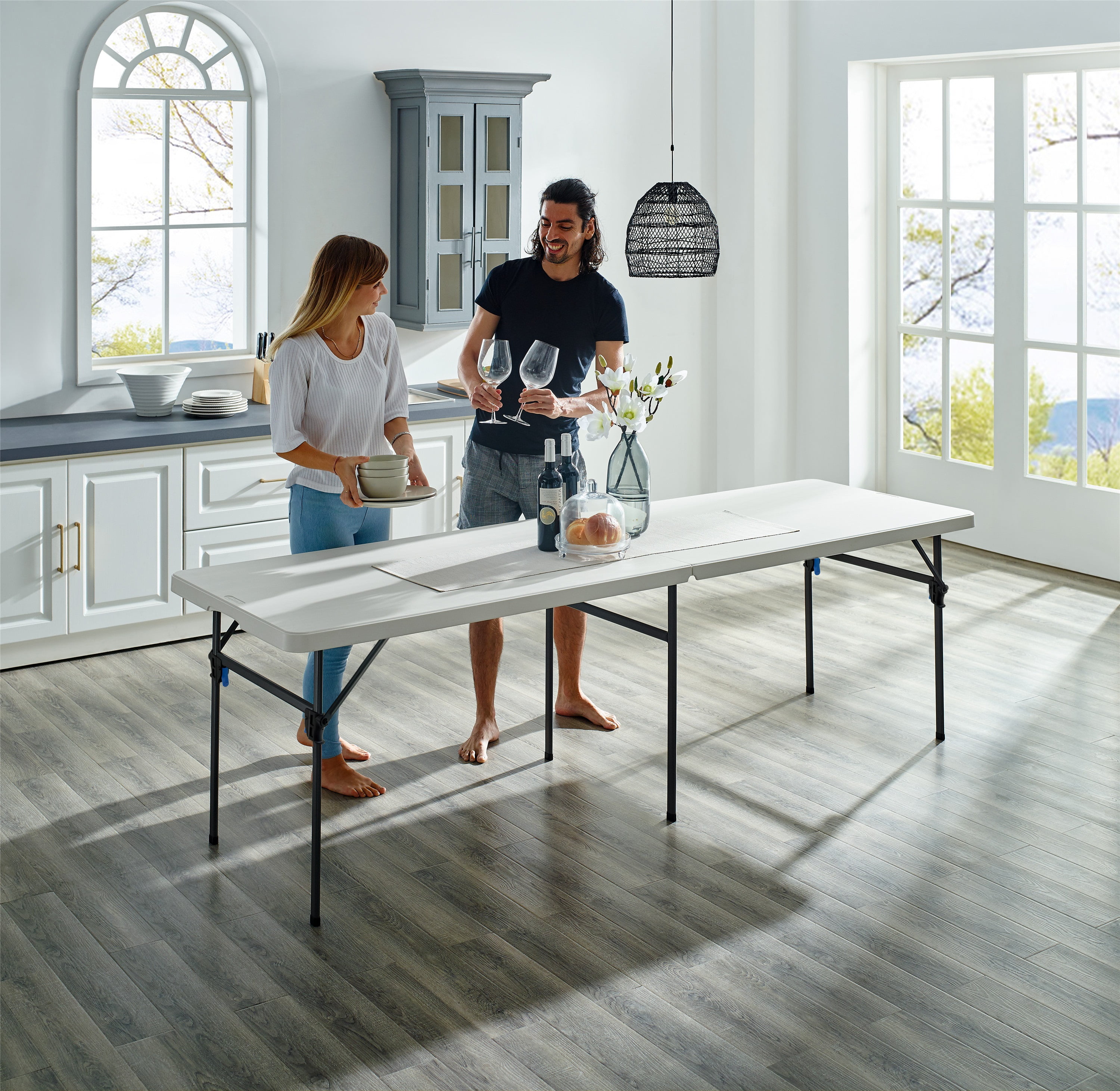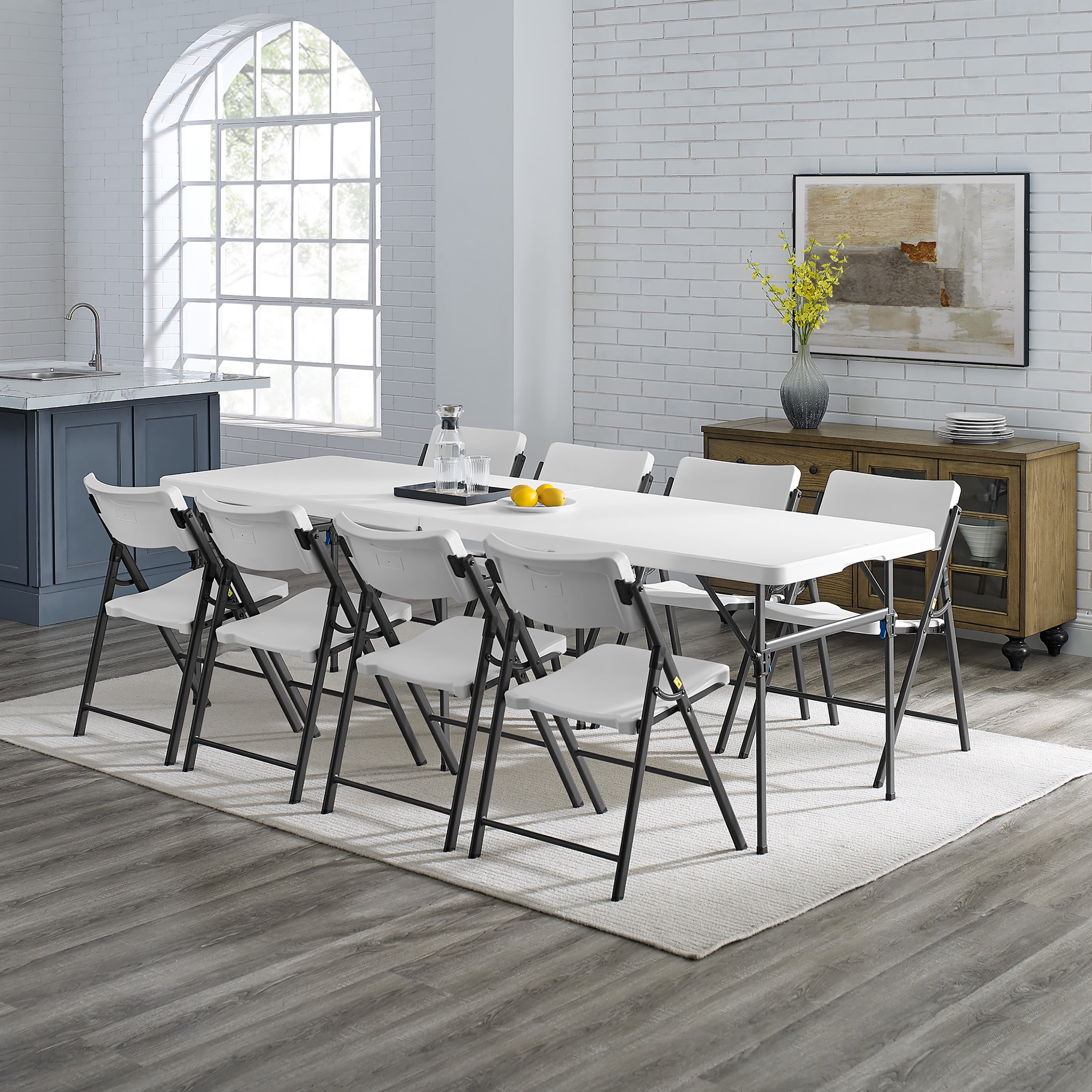 Mainstays 8 Foot Fold-in-Half Resin Table, White Assembled Dimensions: 96″ x 30″ x 29″ Comfortably seats 8 adults Extra middle leg and support sidebars for an additional stable structure Easily folds in half for convenient storage or transport Constructed of UV-Protected high-density polyethylene plastic and black powder-coated steel Includes built-in carry handle, for easy transportation Built for indoor and outdoor use Durable Caps on legs to prevent floor damage No assembly is needed, can be open and folded in a few seconds Folded dimension: 48.03″ L x 30.00″ W x 3.62″ H Weight: 41.18 lbs. Weight Capacity: 500 lbs. Perfect for your home, office, or outdoor activities