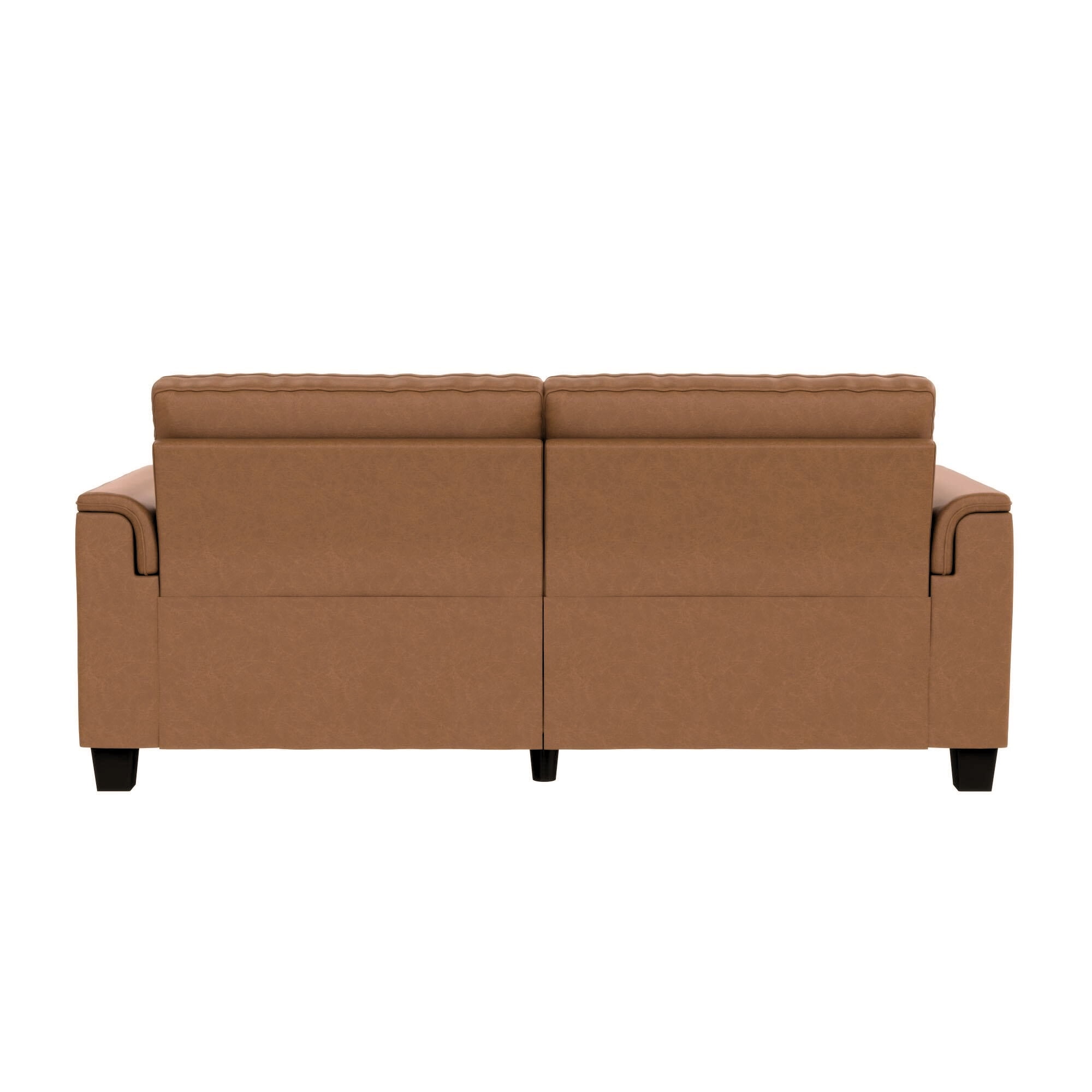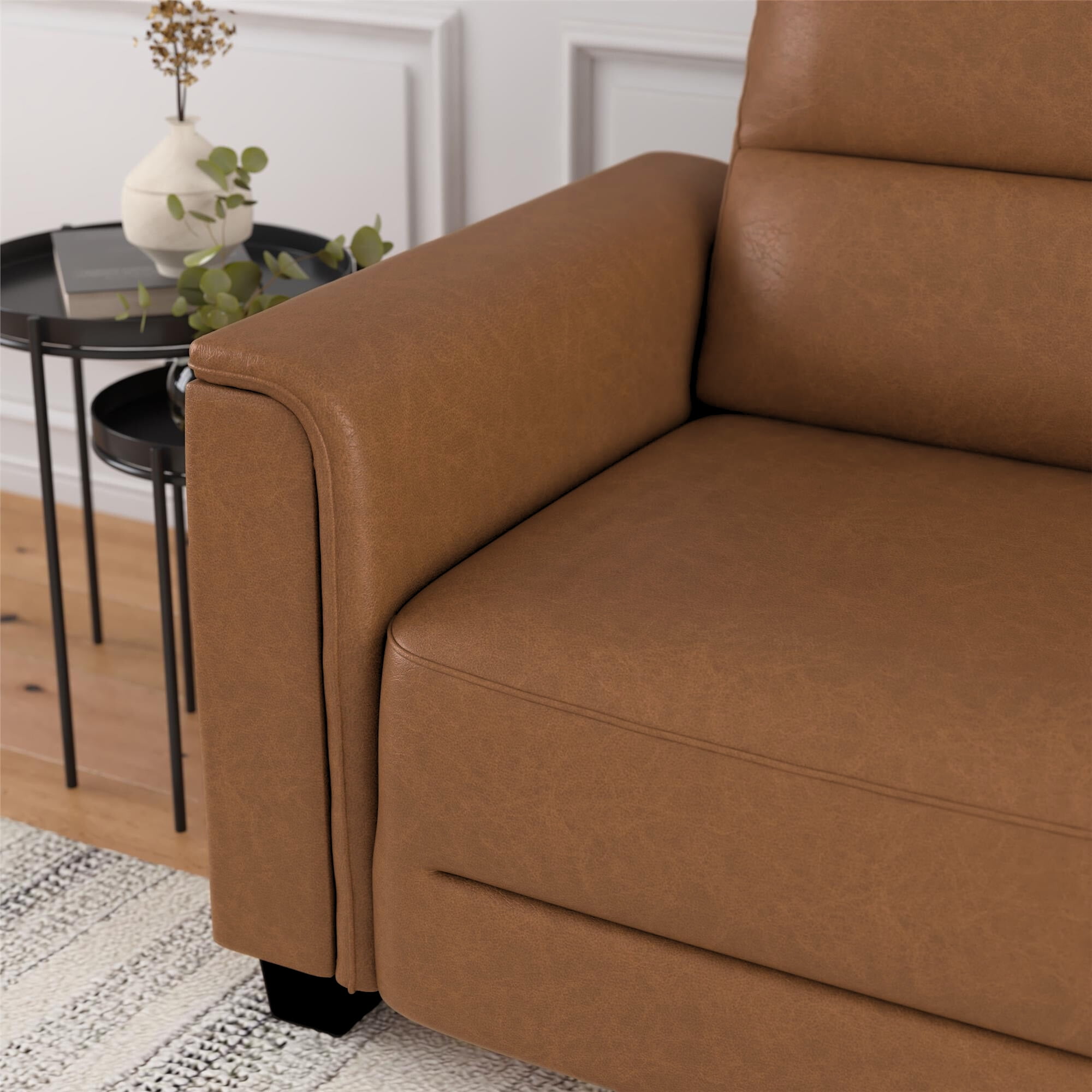 Invite compact sophistication into your home with the Mainstays Williamson Upholstered Sofa, promising to enhance your den or family room with its small couch profile and modern aesthetics. Its rectangular shape and faux leather fabric finish make it a contemporary and comfortable choice. With the capacity to seat up to three people, it is the perfect 75.5″ sofa for living room entertaining and downtime. The couch’s attached seat and back cushions are filled with high-resiliency foam for consistent support, and its pocketed coil seating guarantees firm comfort, reducing sagging over time. Its robust and refined design features pillowed, curved armrests and clean, straight-line back tufting for an edgy touch. The sofa’s construction is durable, with a plywood frame, sinuous steel suspension, and six sturdy legs–four of which have a sleek, black woodgrain look. Despite its solid construction, no tools are required for assembly, and the apartment sofa can be set up in under 30 minutes.