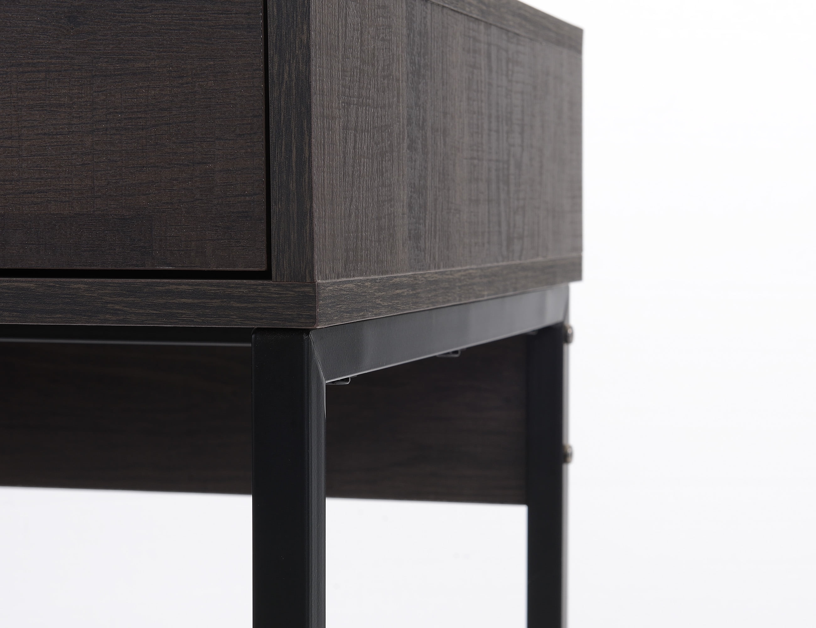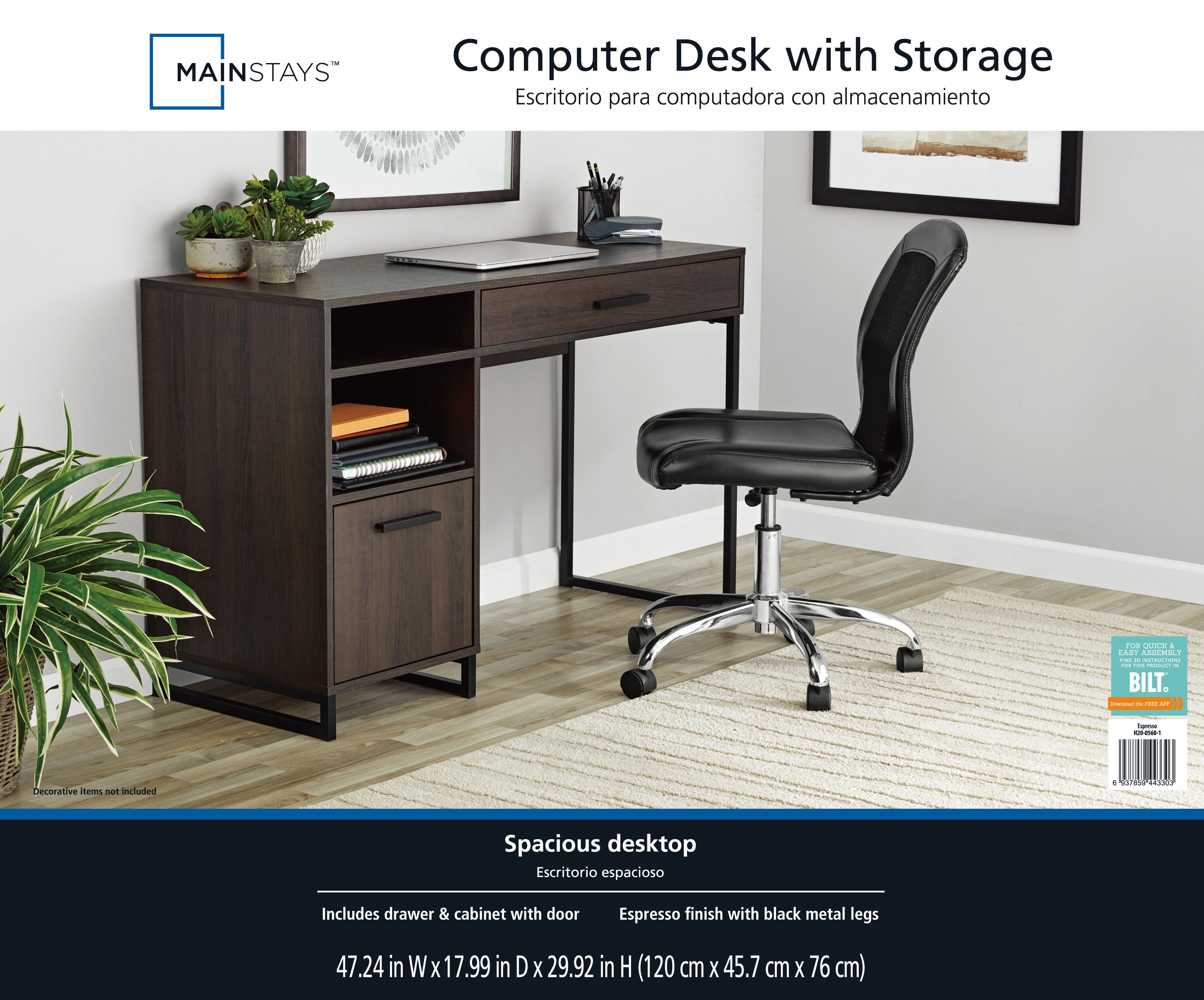 Mainstays Wood & Metal Writing Desk with 1 Drawer &1 Door for Teens/Adult, 29.92 in, Espresso Finish A stylish contemporary desk in a reclaimed espresso finish accented by matte black metal legs. Constructed of engineered wood and metal legs to create a durable and stylish accent for almost any room. Ideal for use with laptops and small desktops. A clear and well-organized installation guide is helpful even if you are new to installing a desk. Perfect for use in dens, living rooms, family rooms, entertainment rooms, eat-in kitchens, home offices, guest rooms, and more. Black powder-coated frame. Assembly Dimensions: 47.24″Lx17.99″Wx29.92″H