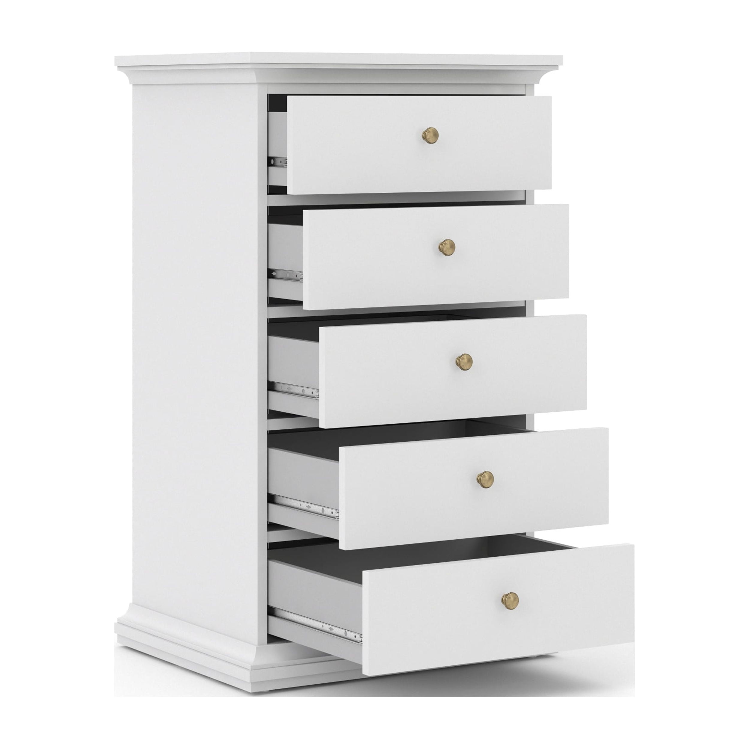 Contemporary design that provides a modern and cohesive ambience Top and bottom molding Round metal knobs Five drawers provide ample storage Use in the entryway, office or living room Made from engineered wood Made in Denmark Scandinavian look and design Includes assembly manual and all necessary hardware and fasteners Components are pre-drilled and pre-cut ready for easy assembly Product is shipped in 2 boxes
