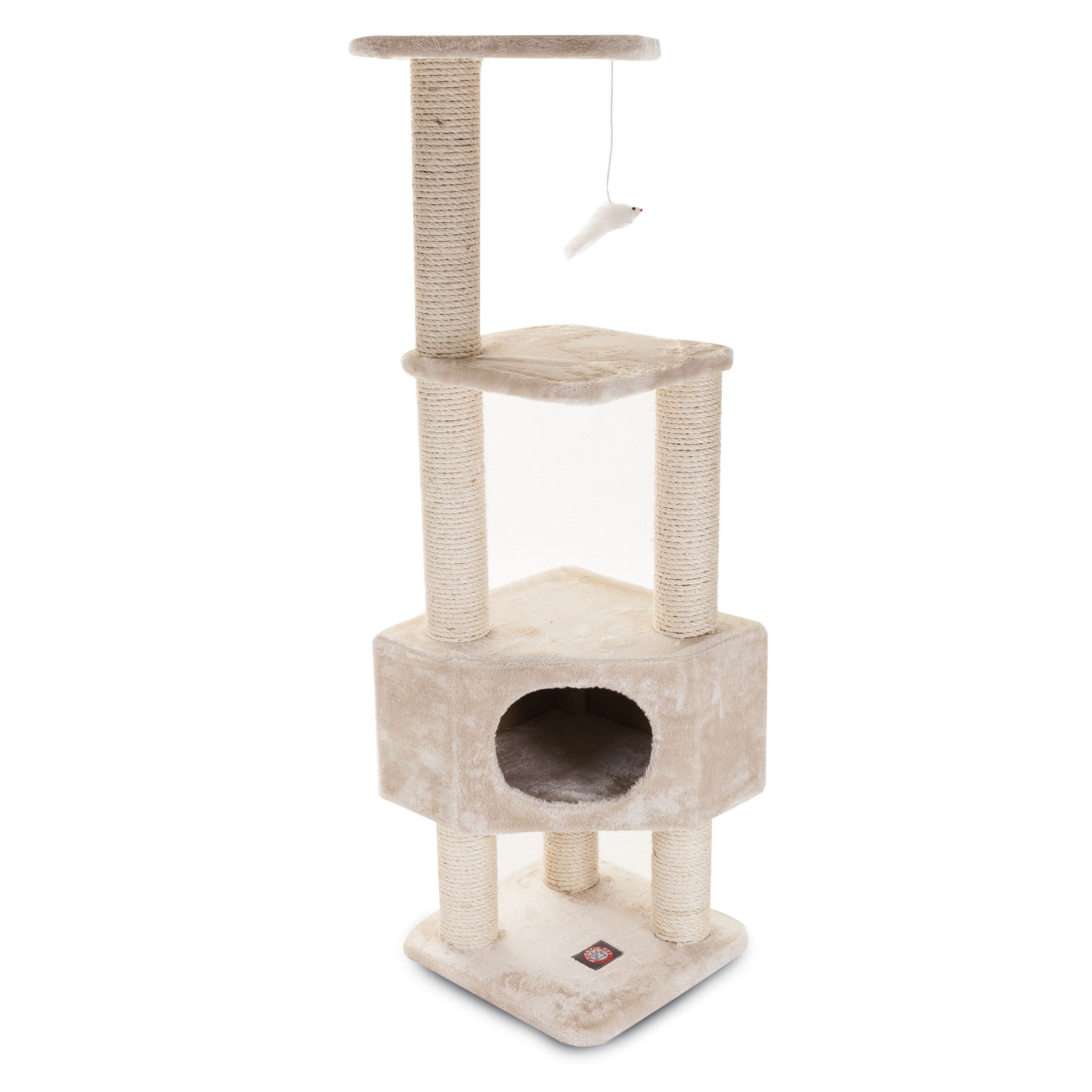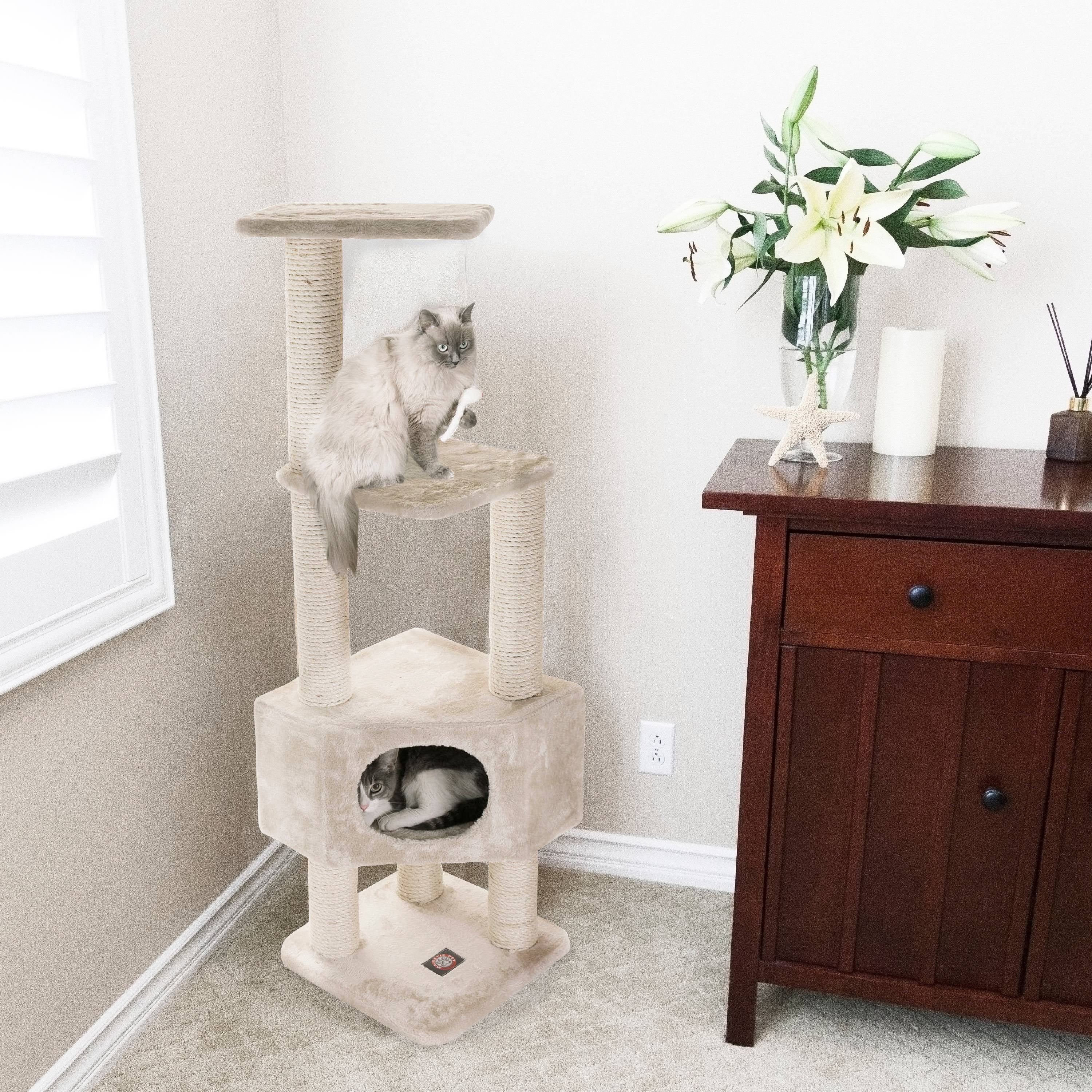 Sisal wrapped post Lounging platforms Easy assembly Tools included with 52″ cat tree Available colors: Honey-Fur and Swiss Cream-Sherpa