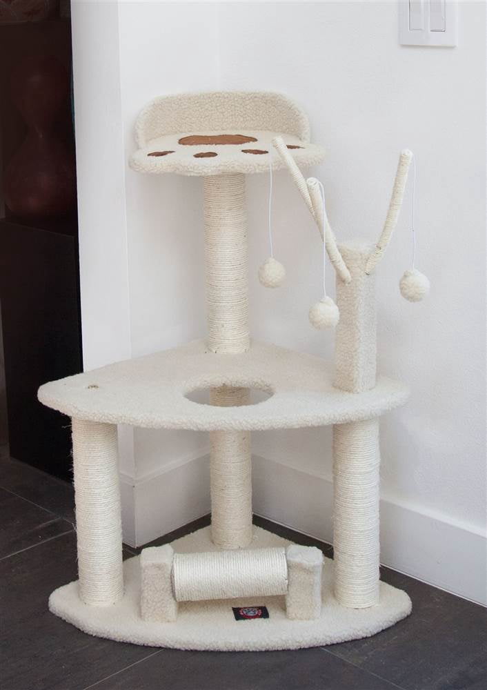 Durable Sisal rope scratching areas all over Keeps your cat active and entertained Attractive faux-sheepskin upholstery, in white Assembles with ease with the included tools Dimensions: 27L x 20W x 36H inches