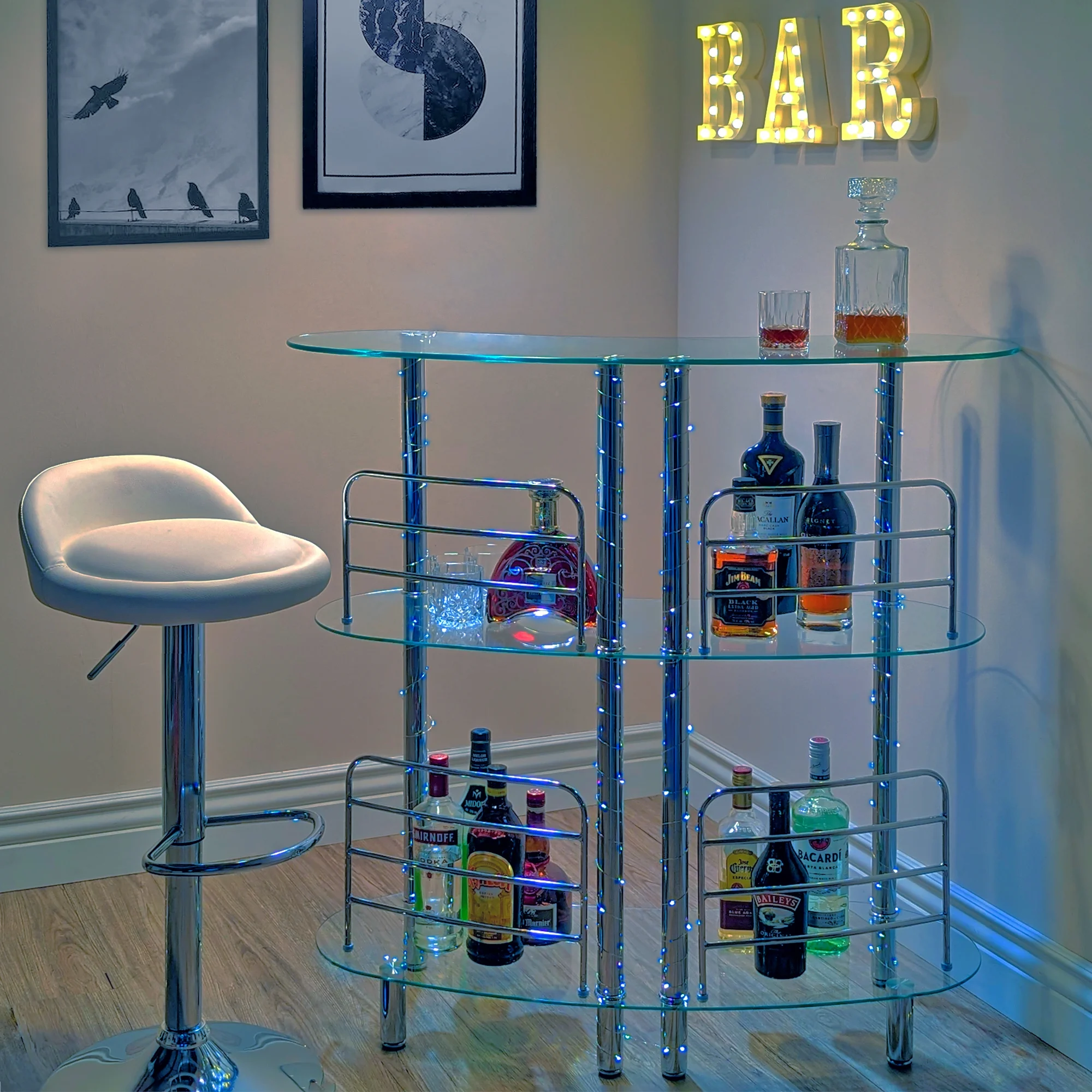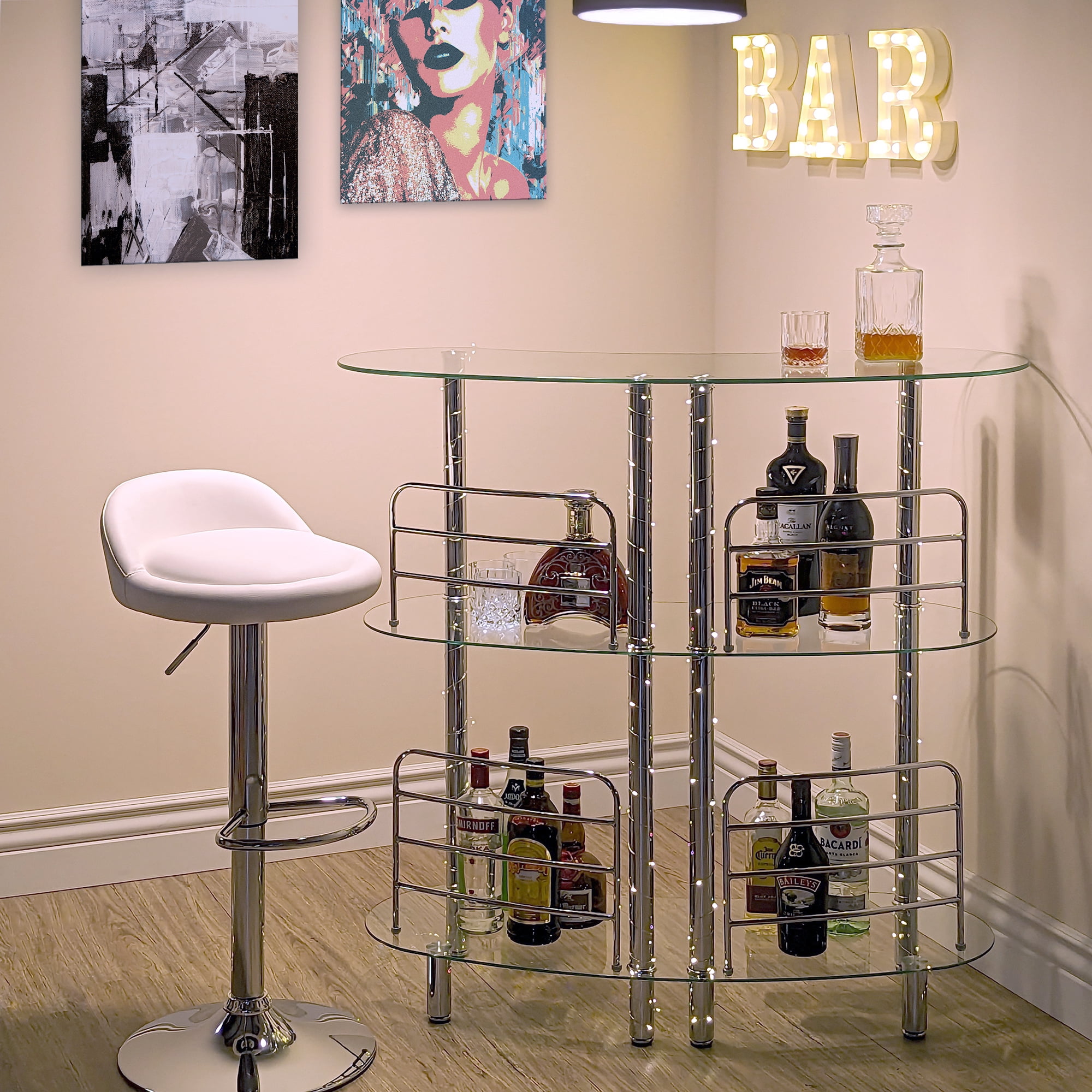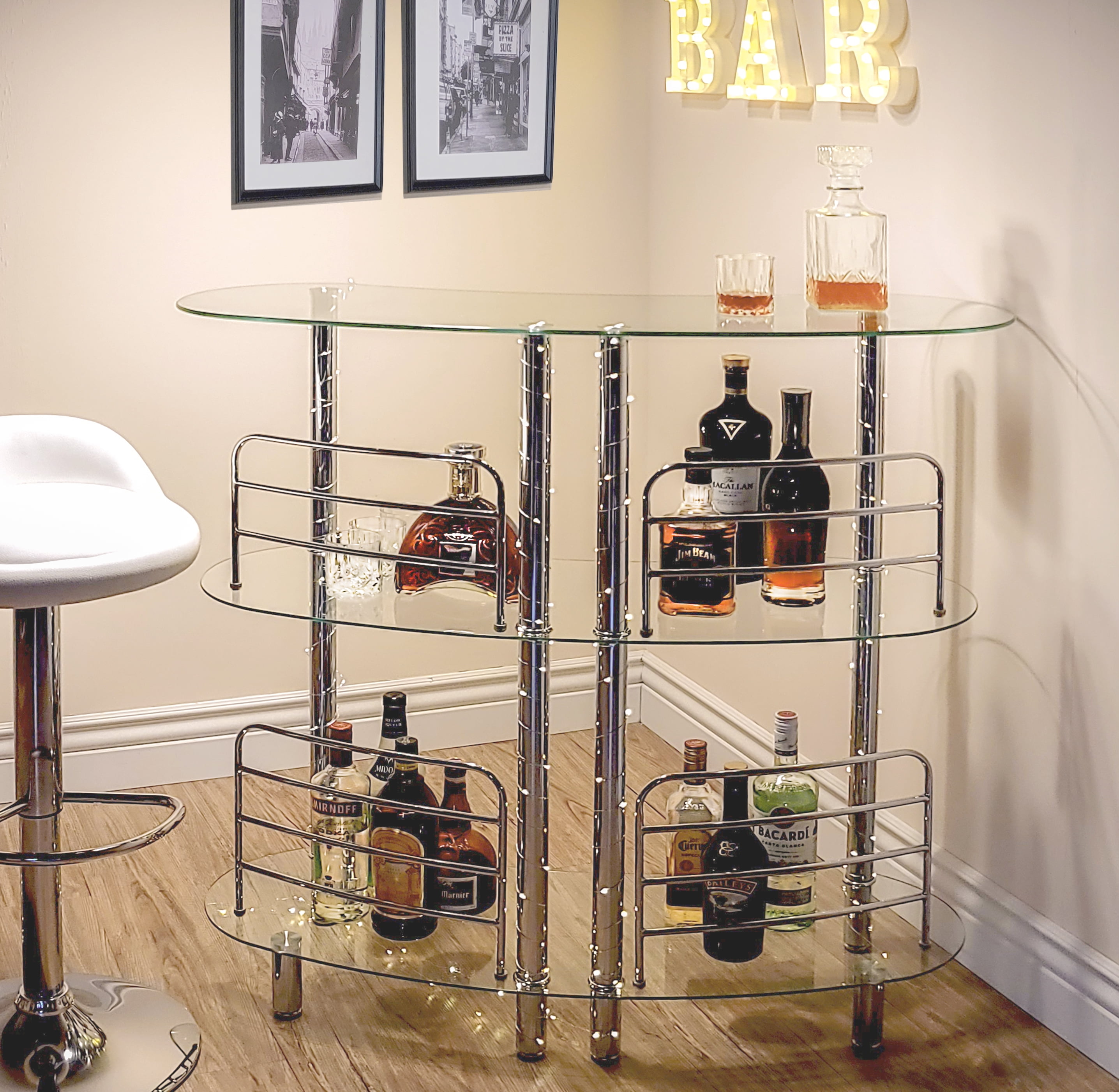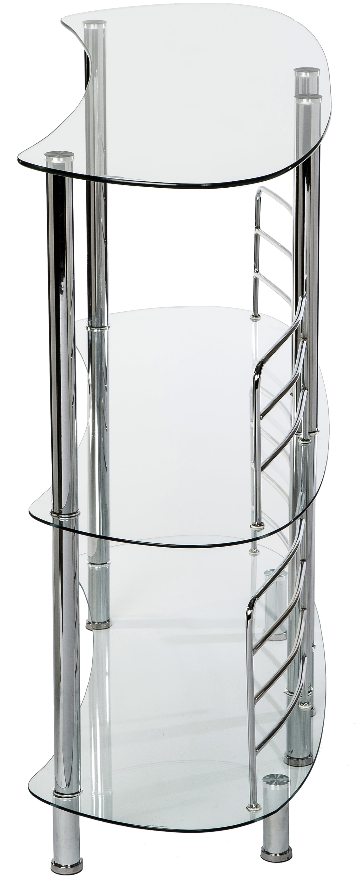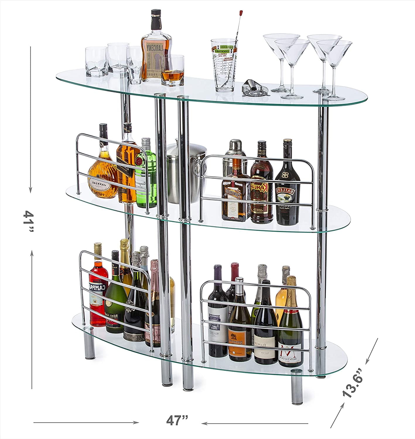 Contemporary Chrome Plated Design – Combine elegance and functionality with our modern home liquor bar Catalina table. The perfect accompaniment to your home bar setup, this chrome-plated steel bar creates a captivating space to serve drinks and adds a chic twist to your living room. Generous Storage – With two glass shelves, allocate wine glasses, bottles, mixers, and accessories with ease. The bottom row has a height clearance of 20″ for tall bottles, while the mid-shelf can store standard sized bottles. Perfect for parties, gatherings, or even a simple drink after a long day. Stability and Durability – Our bar has a perfectly balanced structure with six supporting legs, four front legs, and two back legs to withstand the weight of heavy bottles and prevent any tipping or movement. The tempered glass shelves make them more durable and resilient to scratches than ordinary glass shelves. Premium Quality – A standout feature is the 4 front chrome-plated guard rails that keep your bottles safely in one place while sorting through your collection. The serving side of the bar does not have guard rails for easy access and selection while mixing and serving drinks. Easy Assembly – Check the installation video or contact us for a video link for easy and quick assembly. Overall Measurements: 47″ L x 13.6″ D x 41″ H. Additional Features Material: Tempered Glass , Metal Dimensions: 47″ L x 13.6″ D x 41″ H Storage: 3 Shelves Theme: Modern , Contemporary Shape: Crescent , Round Finish: Tempered , Chrome Mounting: Freestanding , Floor Color: Clear , Silver Included: Bar Table , Hardware, Instructions, Assembly Video If Needed Additional Features: Guard Rails , Adjustable Floor Levers Bar Type: Home Bar, Mini Bar , Liquor Cabinet , Bar Table , Bar Stand , Serving Bar