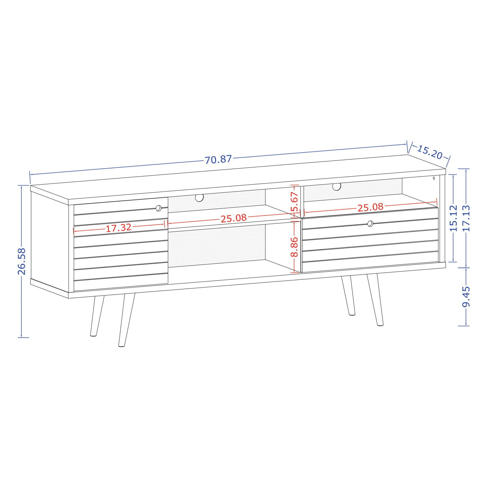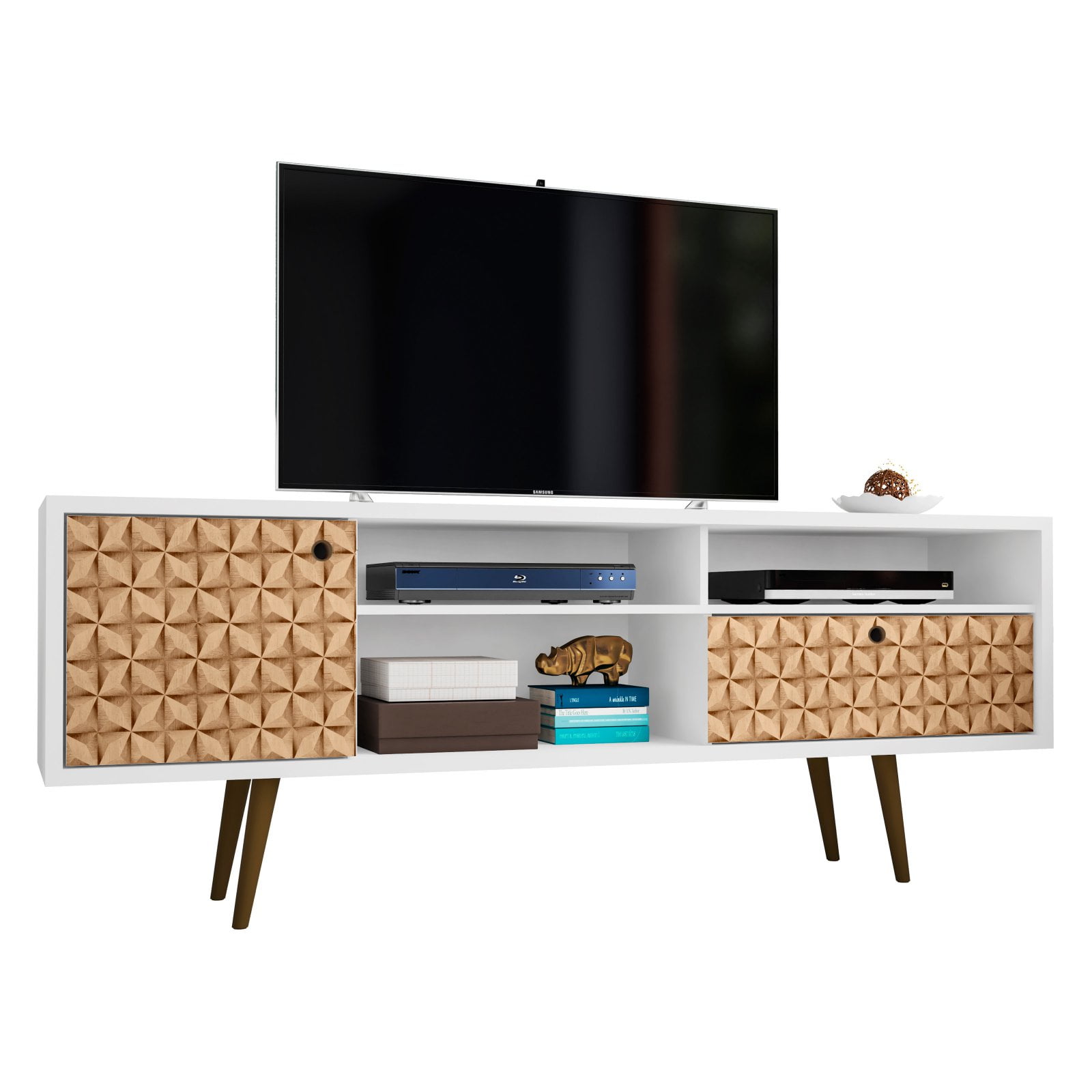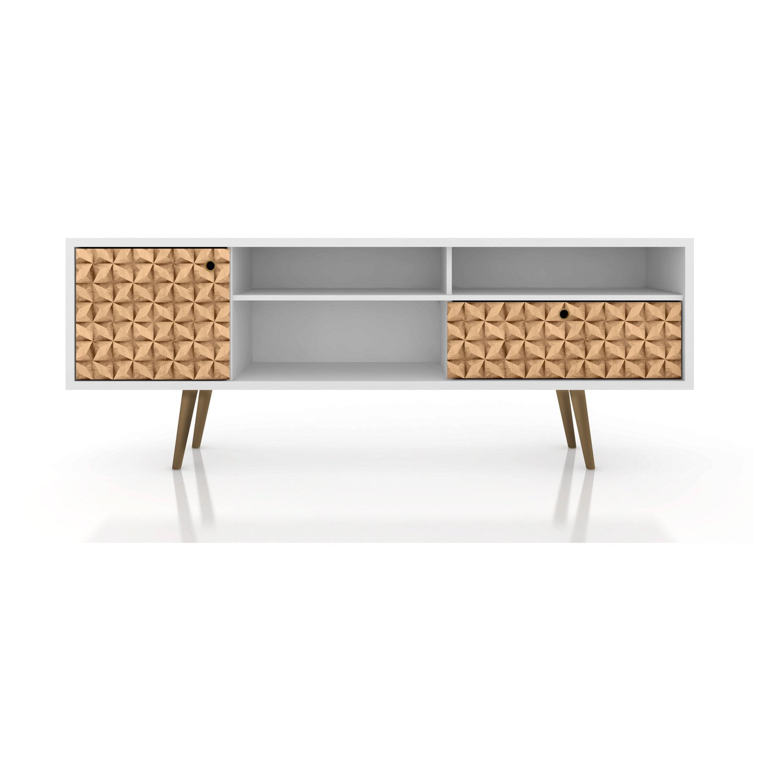 Includes all hardware Three open shelves, one concealed large cubby, one full extension drawer and two media holes for wire management 3D brown print Recommended for up to 50 in. – 65 in. TV Fashionable splayed legs Warranty: 90 days limited Made from MDP and MDF Assembly required 70.86 in. W x 15.19 in. D x 26.57 in. H (99.91 lbs.) Liberty 70.86 Mid-Century Modern TV Stand is mid-century modern at its best. Quality craftsmanship and careful detailing create the ultimate blend of style, functionality, and brilliant design. A sophisticated entertainment center, the piece features open shelving, as well as two hidden compartments perfect for stashing DVDs, board games, electronics, and media accessories. Free standing and easily moved, this stand will mix well with any decor and its artful grooves will create a statement in a