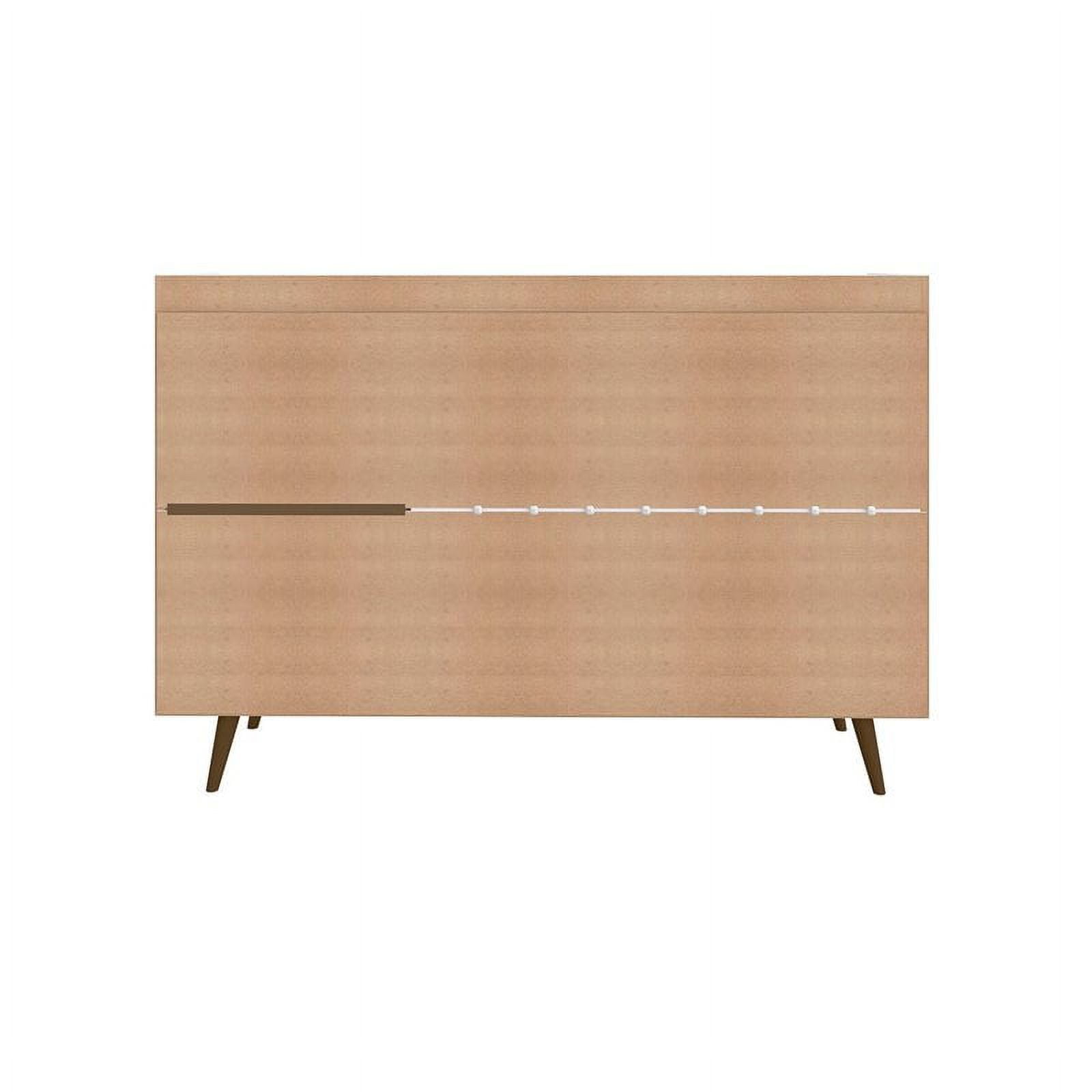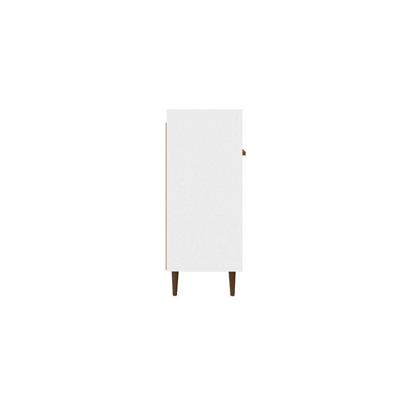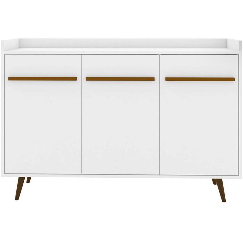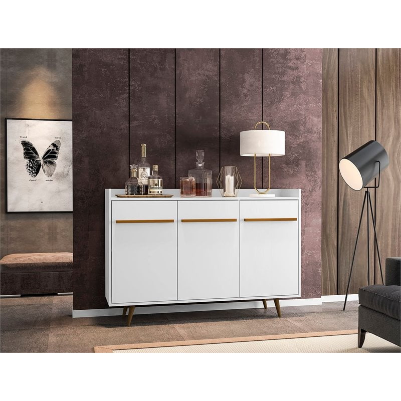 A lesson in design and entertaining, the Bradley buffet sideboard takes your dining or living space to the next level turning you into the hostess with the chicest style. Create the dinner party you’ve always wanted, with easy functional storage and concealed areas perfect for tucking away dishes, linens, and stemware. Durable splayed legs and expert craftsmanship offer a classic Mid-Century aesthetic and keep this piece feeling trendy and timeless all at once. Transform it by creating a bar area up top, or use it to display candlesticks, fresh flowers, refreshments, or framed family photos. Features: Material: Wood Finish: White, rustic brown Upon assembly Recommended for up to a 50″ TV stand. Includes 2 cabinets Features unique dip style top board adding sophistication and beauty. 90° open door style including soft close features. Home assembly required. All hardware included. Specifications: Product Dimensions: 38.58″H x 53.54″W x 14.53″D Product Weight: 79.81 lbs Number of Shelves: (Concealed) 4