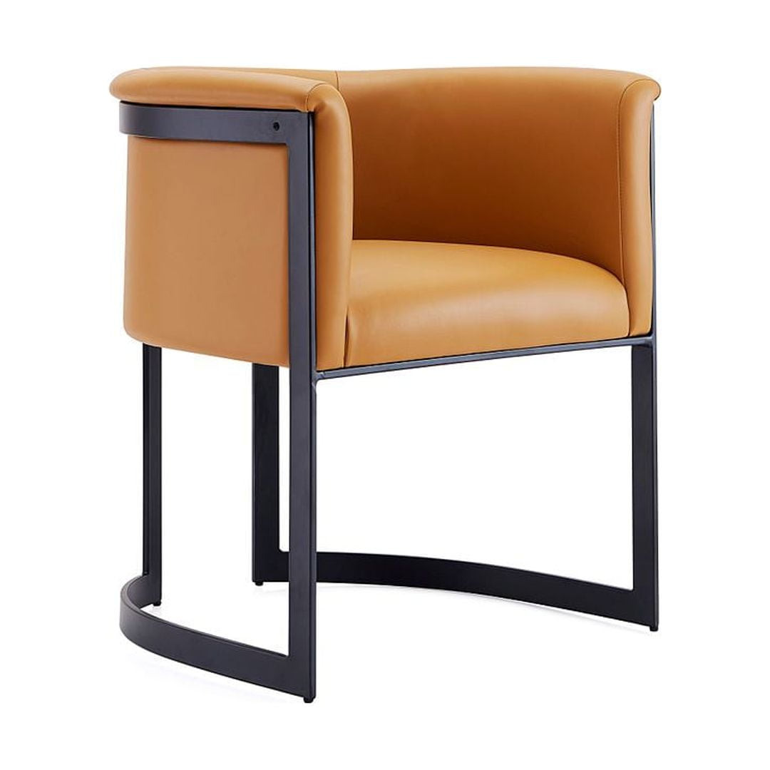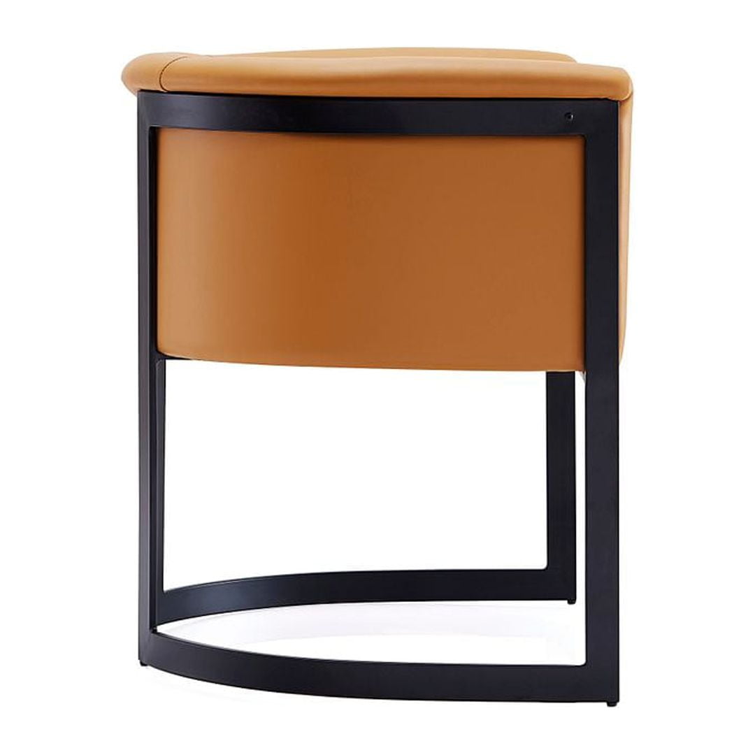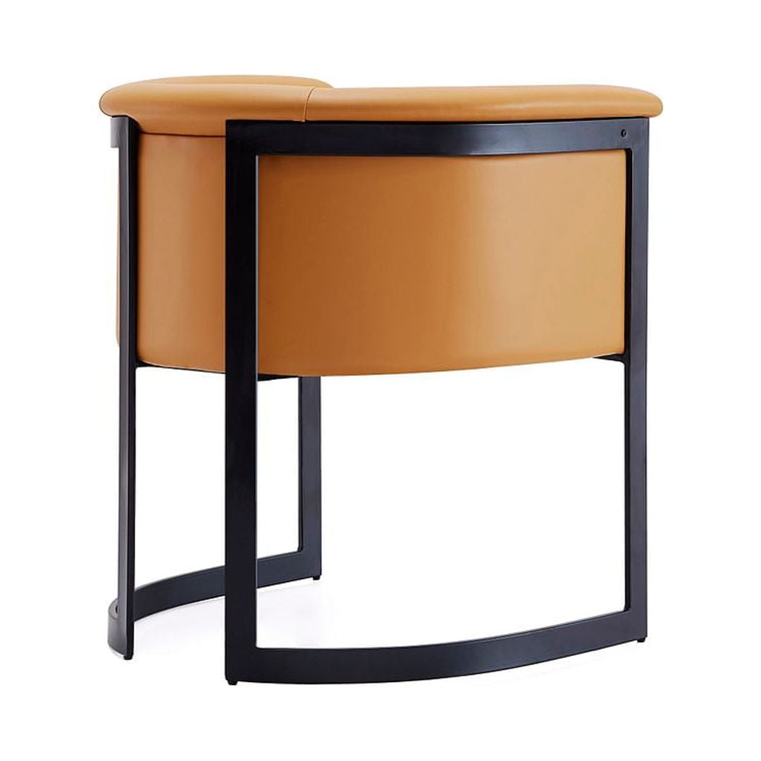 Made for entertaining, the Corso barrel style dining chair blends comfort and chic modern design. Whether it is a family dinner or a friendly event, your guests will feel right at home once they take a seat. With rich faux leather fully covering the plush seat, sides, and back, the Corso provides an inviting experience and a timeless appeal. The unique geometric frame contours the entire seat, creating a confidently durable space to kick back and relax. Features: Material: Faux leather, foam, metal Finish: Tan, black Geometric parallel Unique legs frame the item from top to bottom. Delivered to you fully assembled! no assembly required! Specifications: Product Dimensions: 27.81″H x 26.38″W x 24.49″D Product Weight: 29.32 lbs Seat Height: 18.51″ Seat Depth: 20.01″