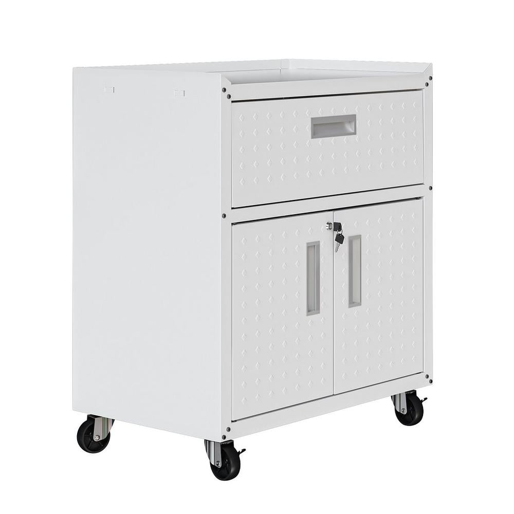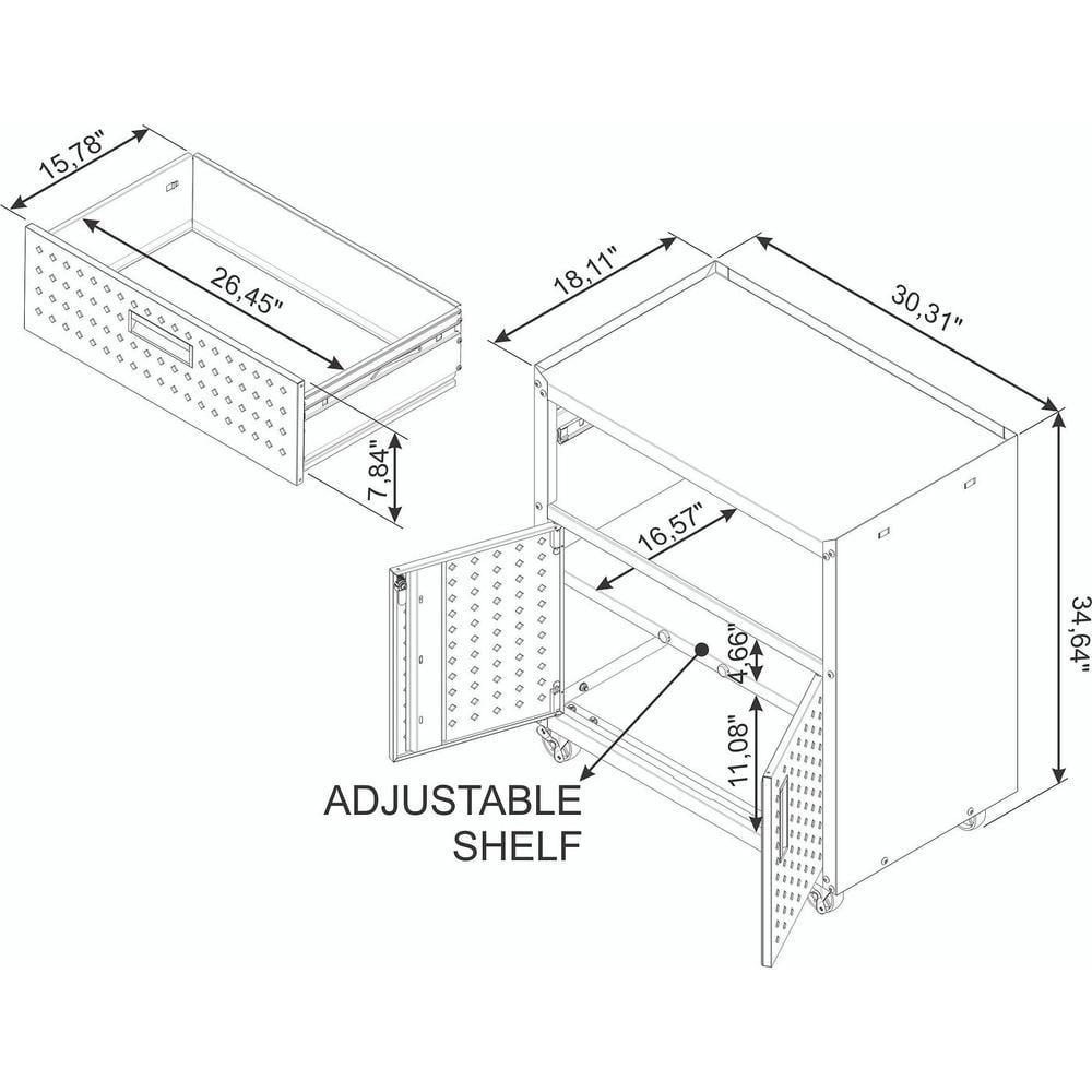 Mobile Diamond Shape Texture Metal 31.5″ Storage Cabinet for Garage Use. Upon assembly, Garage Cabinet Dimensions Measure: 30.3 in. Length, 31.5 in. Height, 18.2 in. Depth. Includes 2 Doors, 1 Adjustable Shelf and 1 Full Extension Drawer. Features Unique Door Lock and Key. Recessed Metal Handle Space Saving Design – Fits Under the Manhattan Comfort Fortress Garage Work Table. Includes Swivel Casters for Easy Mobility and a Metal Latch to Lock Wheels Home Assembly Required. All Hardware Included.