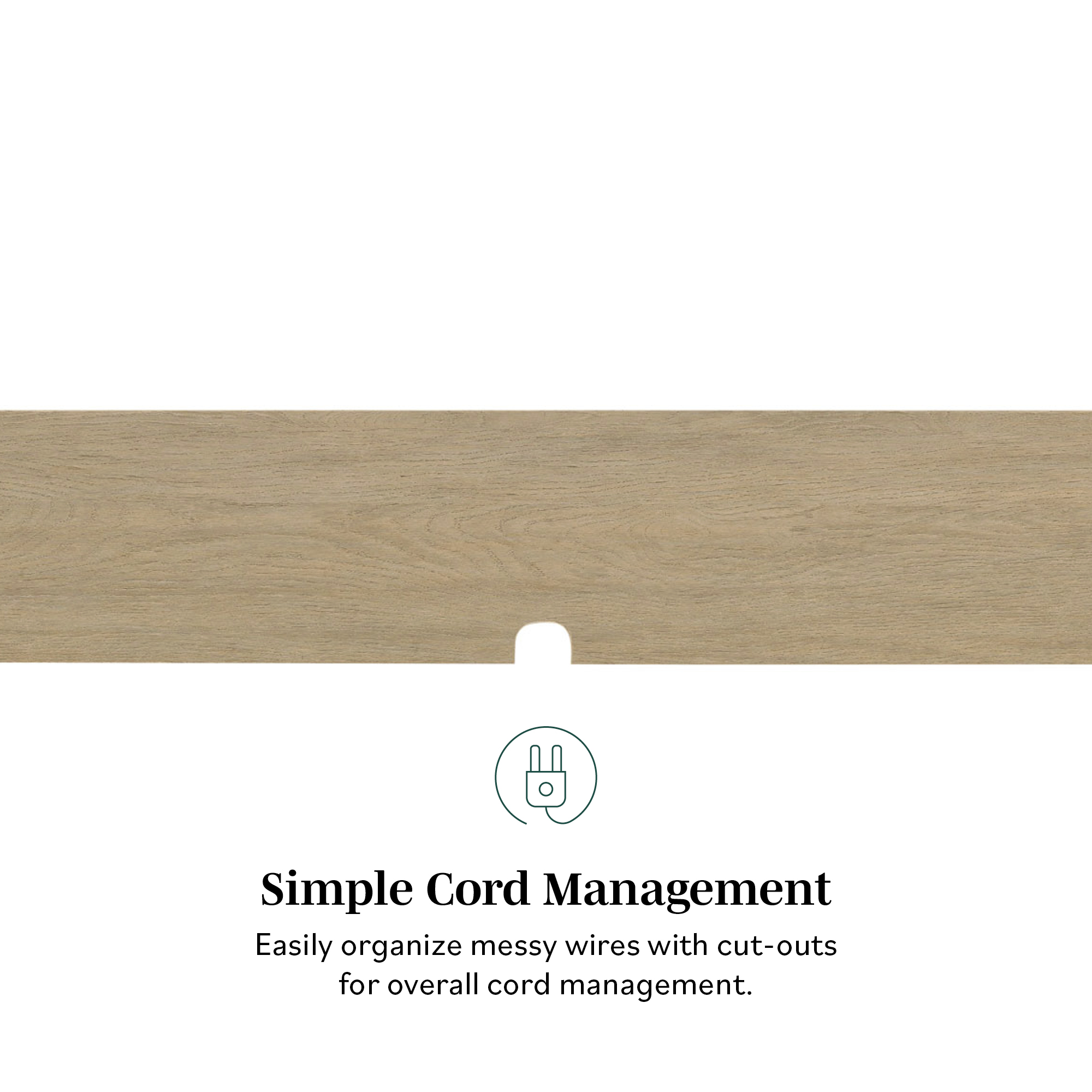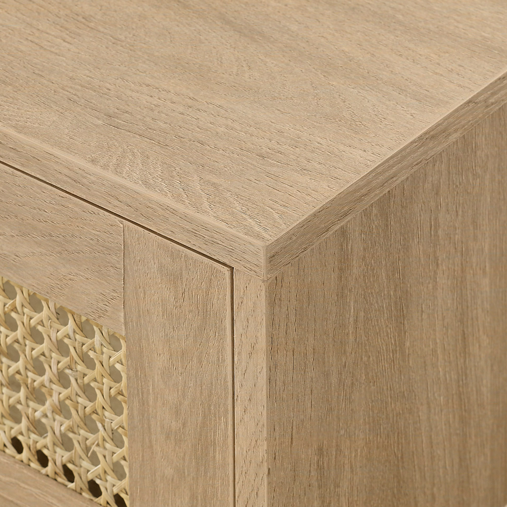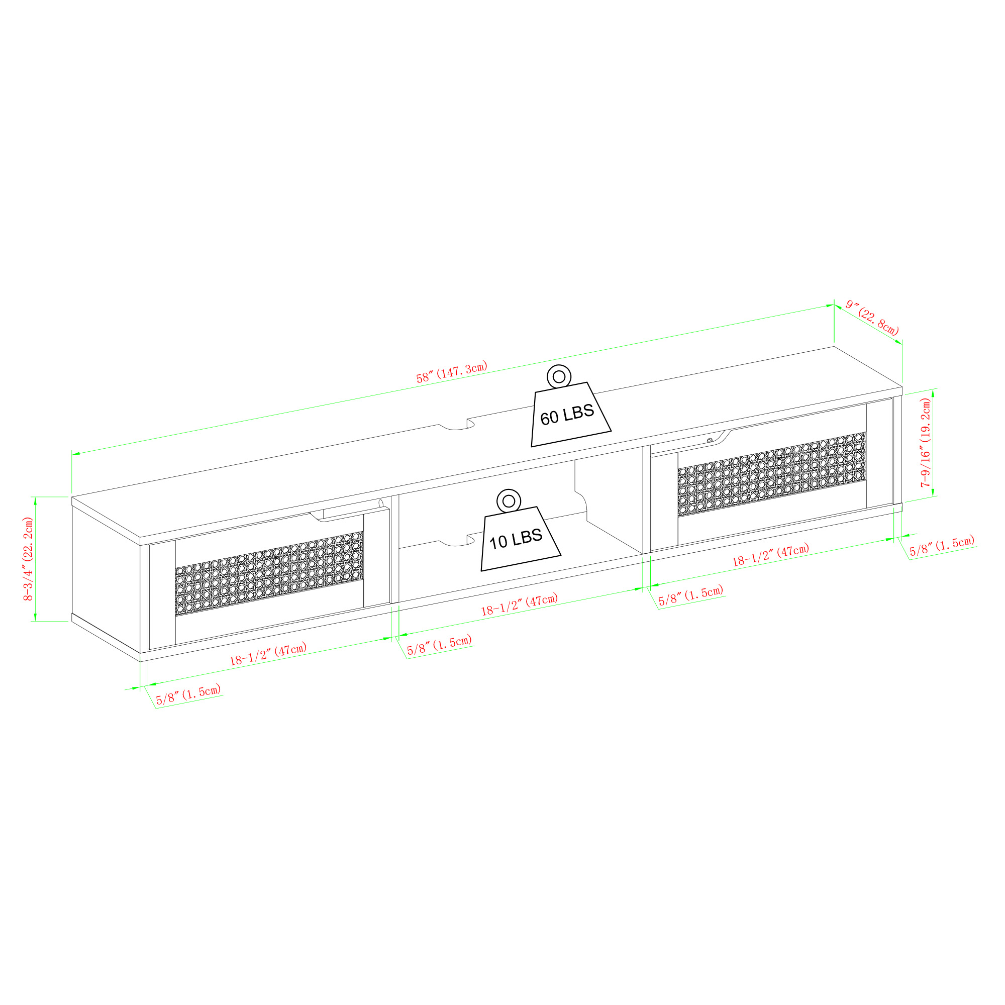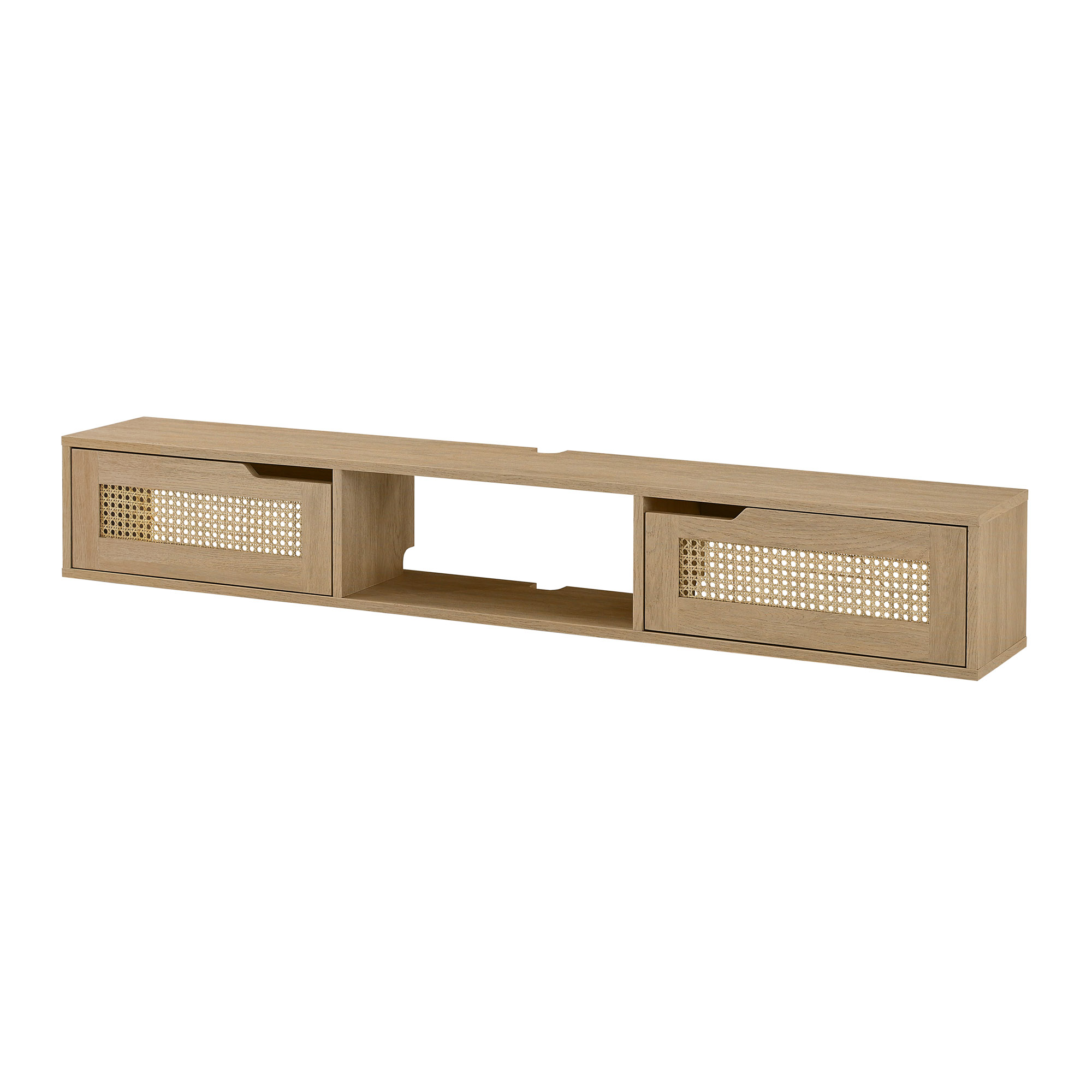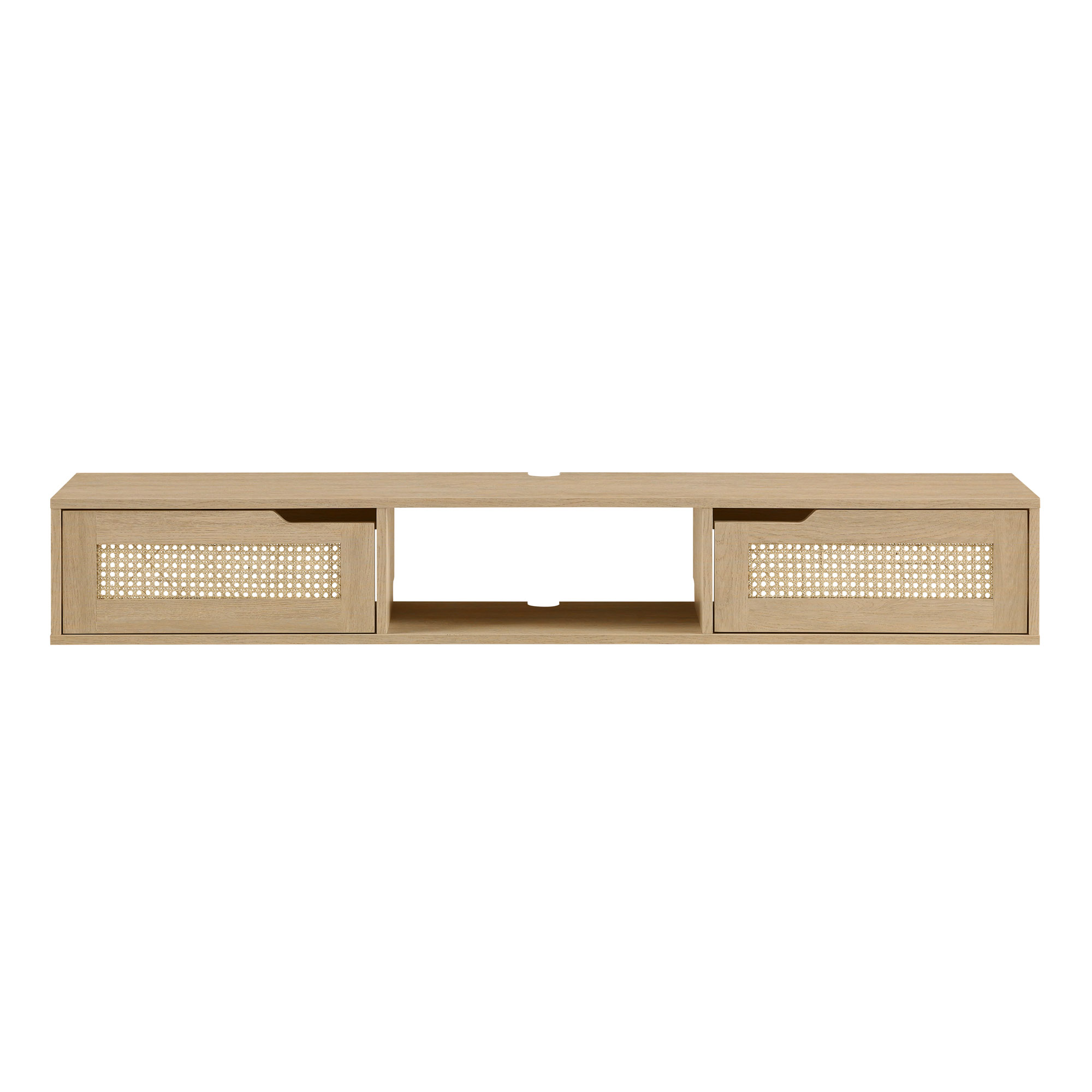 Modern style Coastal oak finish 2 closed storage compartments for an organized display 1 open cubby offers a spot for décor Cord management ports keep tech organized Made from warp-resistant MDF, durable laminate, and faux rattan Ships ready-to-assemble with step-by-step instructions Assembled dimensions: 9” H x 58” L x 9” W Packaged dimensions: 5” H x 63” L x 13” W