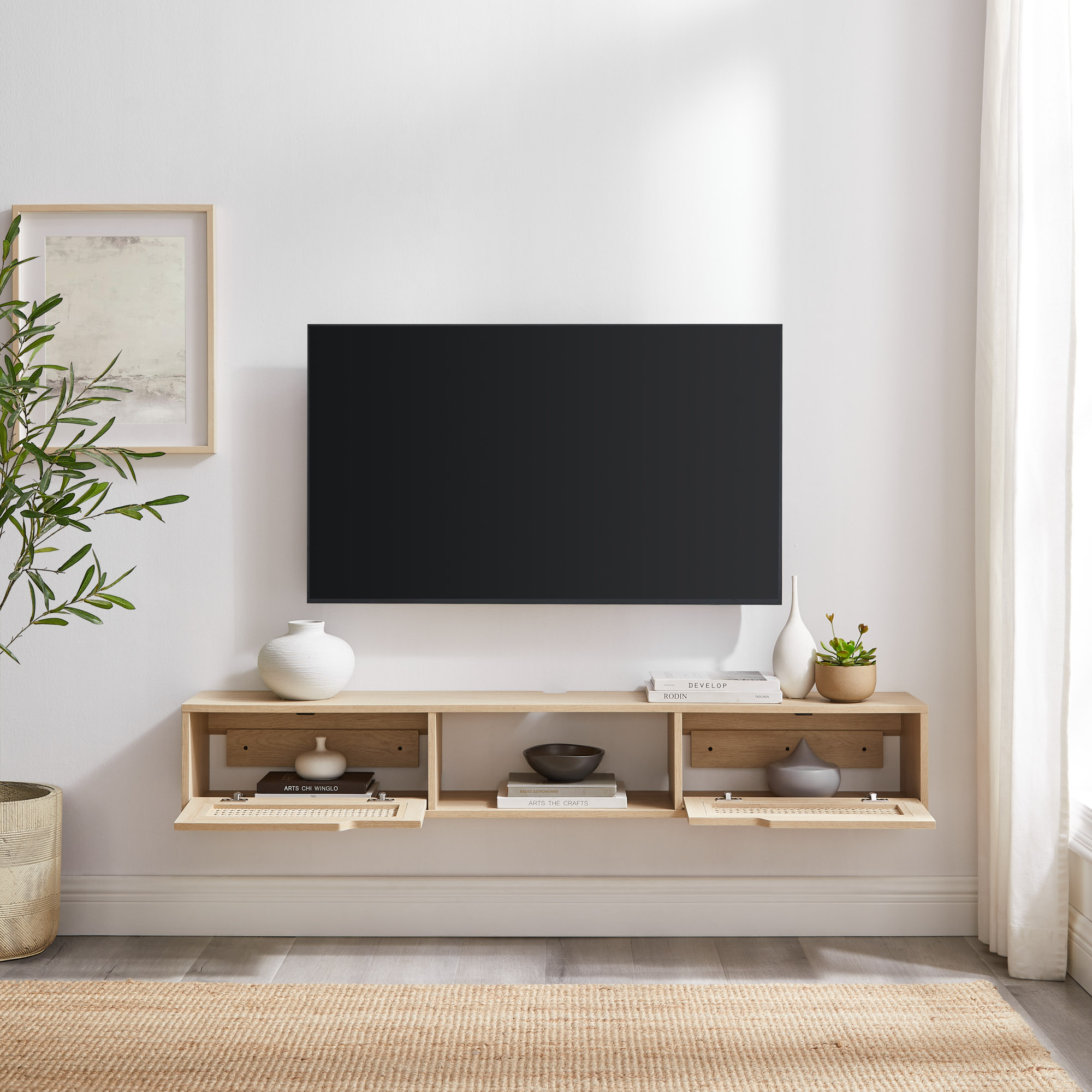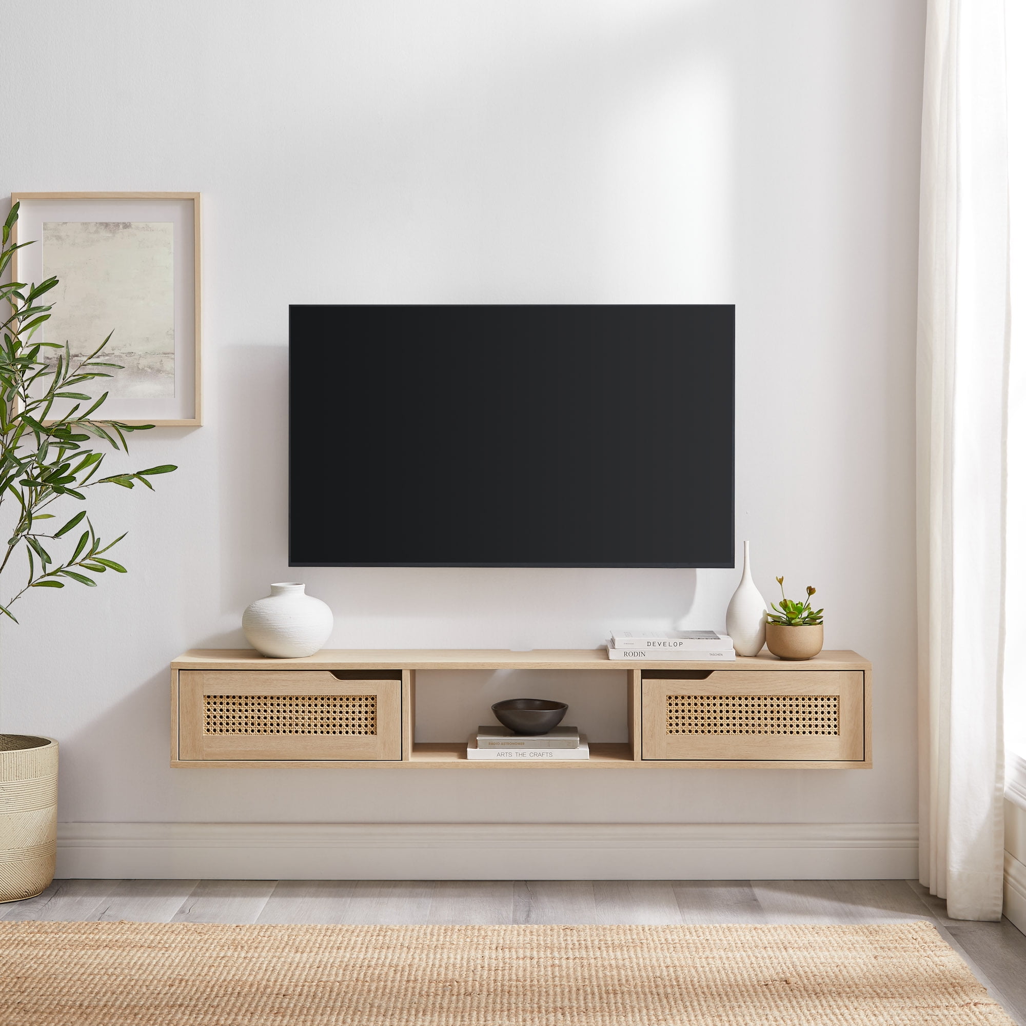 Manor Park 58″ Modern Floating Rattan-Door TV Stand for TVs up to 65”, Coastal Oak