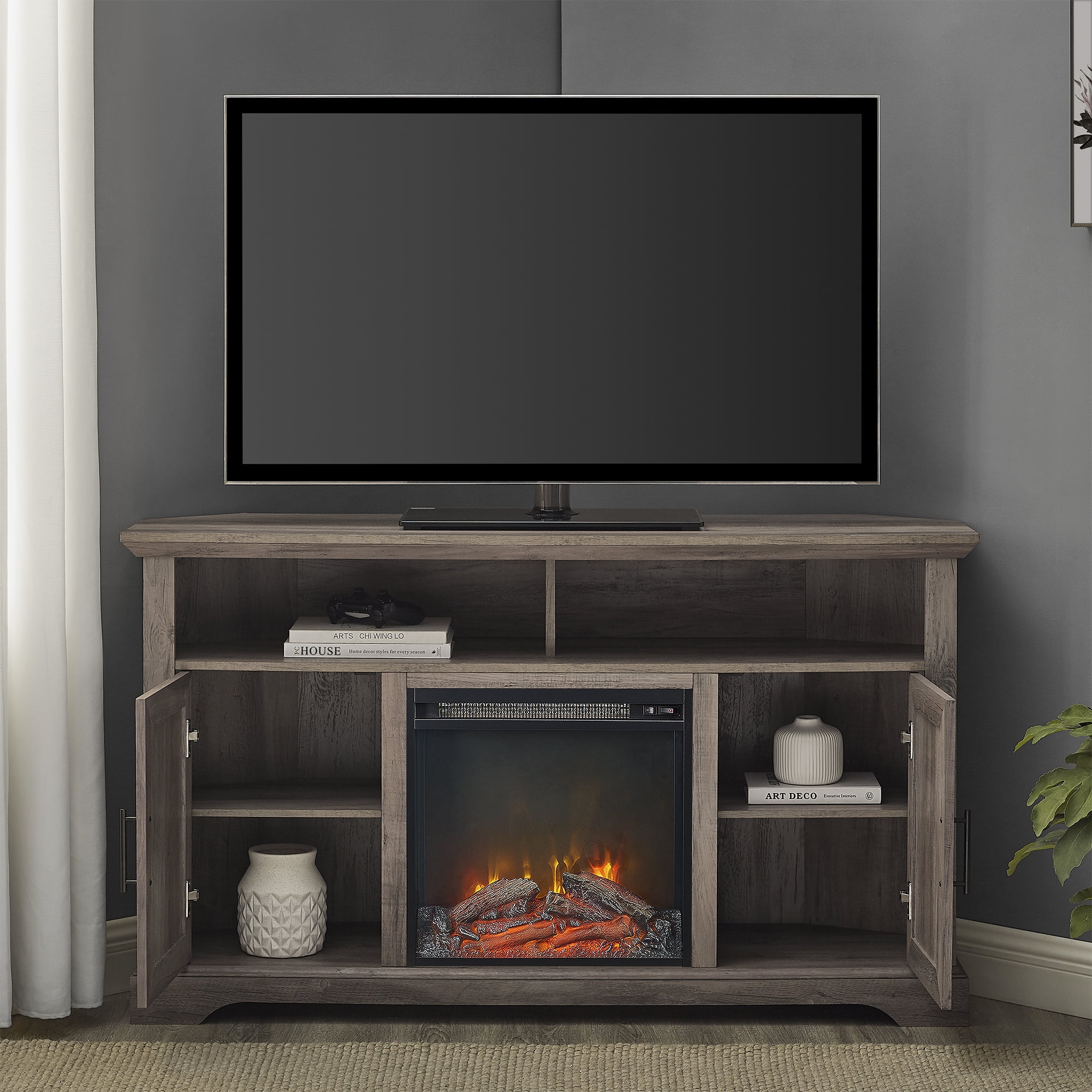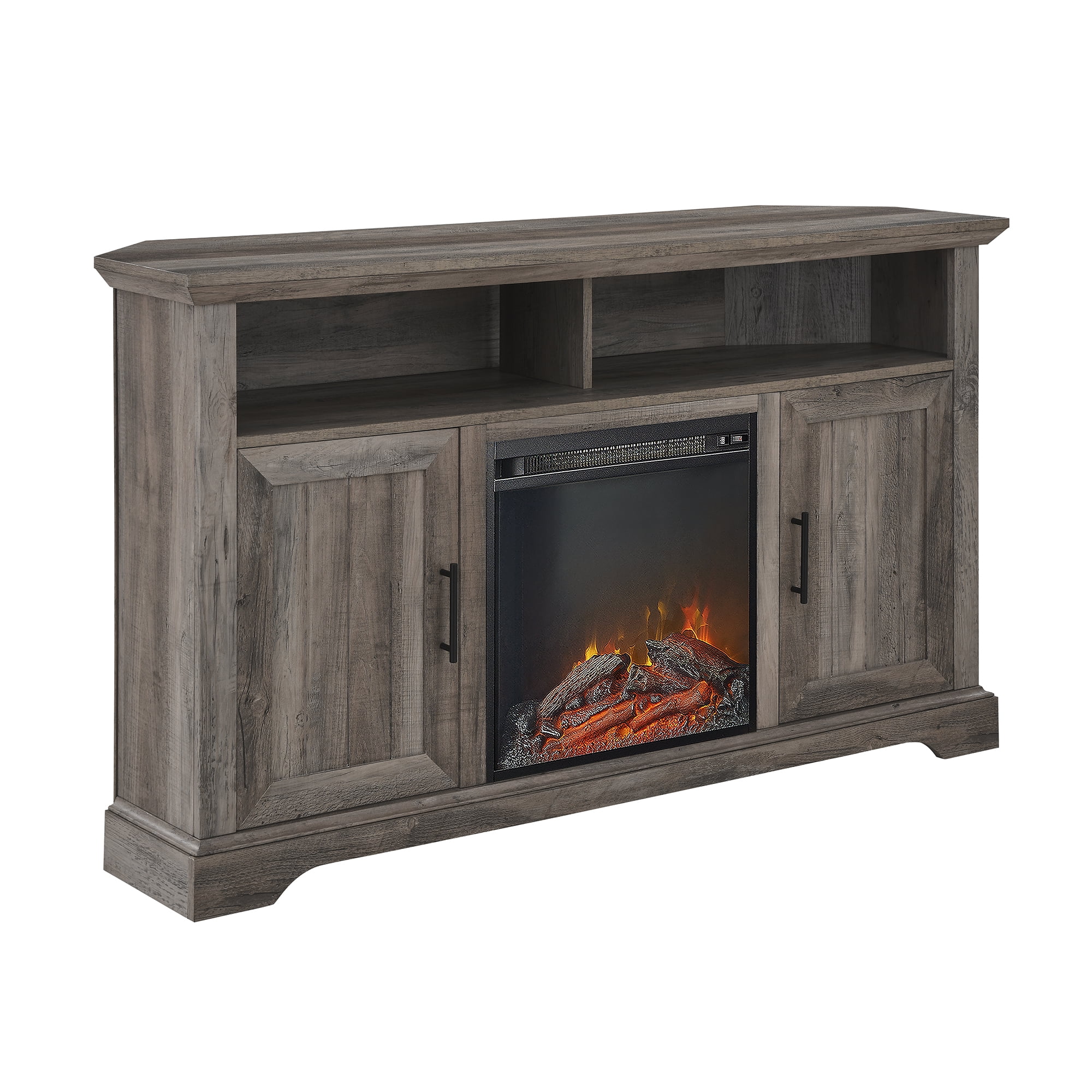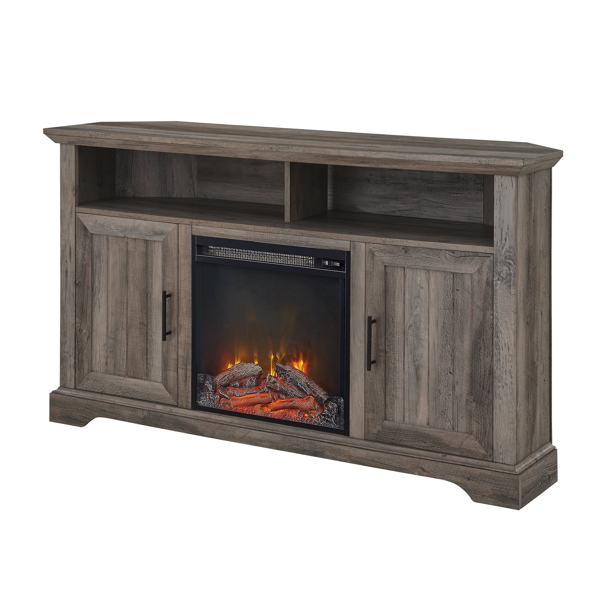 Manor Park Coastal Corner Fireplace TV Stand for TVs up to 60″, Grey Wash: Modern farmhouse style Grey wash finish Angled sides for a corner fit Electric fireplace with 6-foot cord and universal plug 2 open cubbies with cord management ports 2 grooved doors with soft-close hinges 2 adjustable shelves for customizable organization Accommodates TVs up to 60 inches Made with warp-resistant MDF wood, durable laminate, and powder-coated steel Ships ready-to-assemble with step-by-step instructions Assembled Dimensions: 31″ H x 54″ L x 15.75″ W Packaged Dimensions: 10″ H x 60″ L x 23″ W