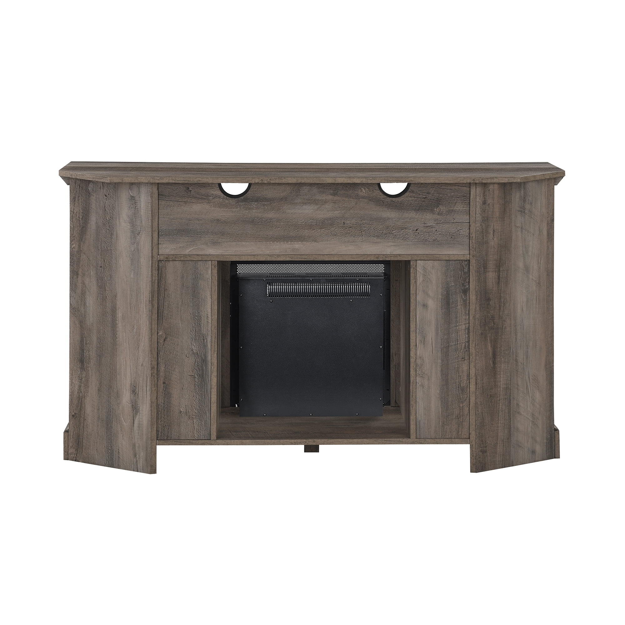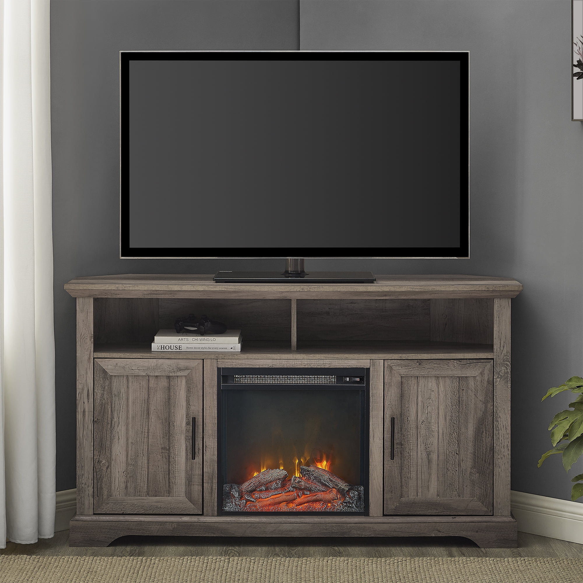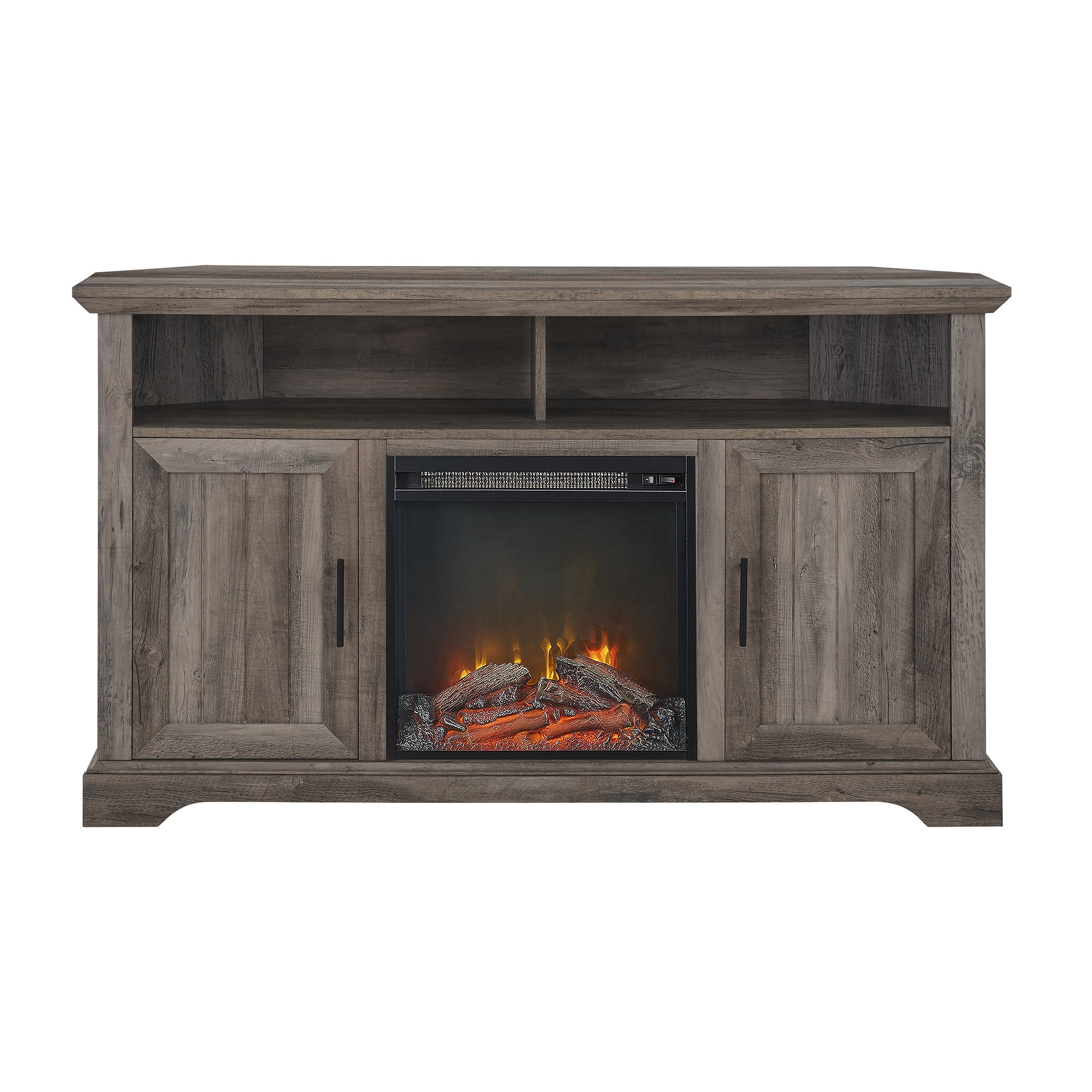 Manor Park Coastal Corner Fireplace TV Stand for TVs up to 60″, Grey Wash: Modern farmhouse style Grey wash finish Angled sides for a corner fit Electric fireplace with 6-foot cord and universal plug 2 open cubbies with cord management ports 2 grooved doors with soft-close hinges 2 adjustable shelves for customizable organization Accommodates TVs up to 60 inches Made with warp-resistant MDF wood, durable laminate, and powder-coated steel Ships ready-to-assemble with step-by-step instructions Assembled Dimensions: 31″ H x 54″ L x 15.75″ W Packaged Dimensions: 10″ H x 60″ L x 23″ W