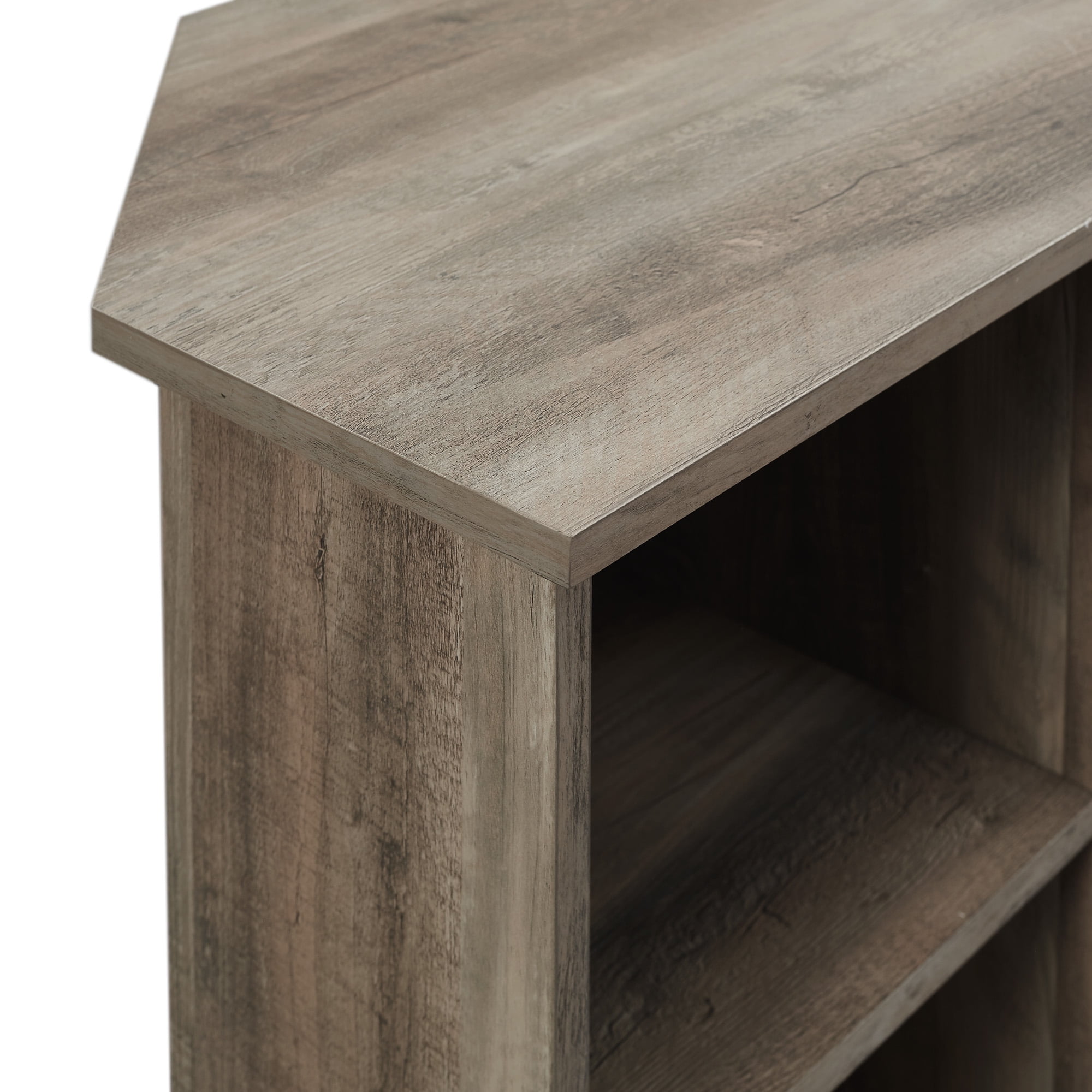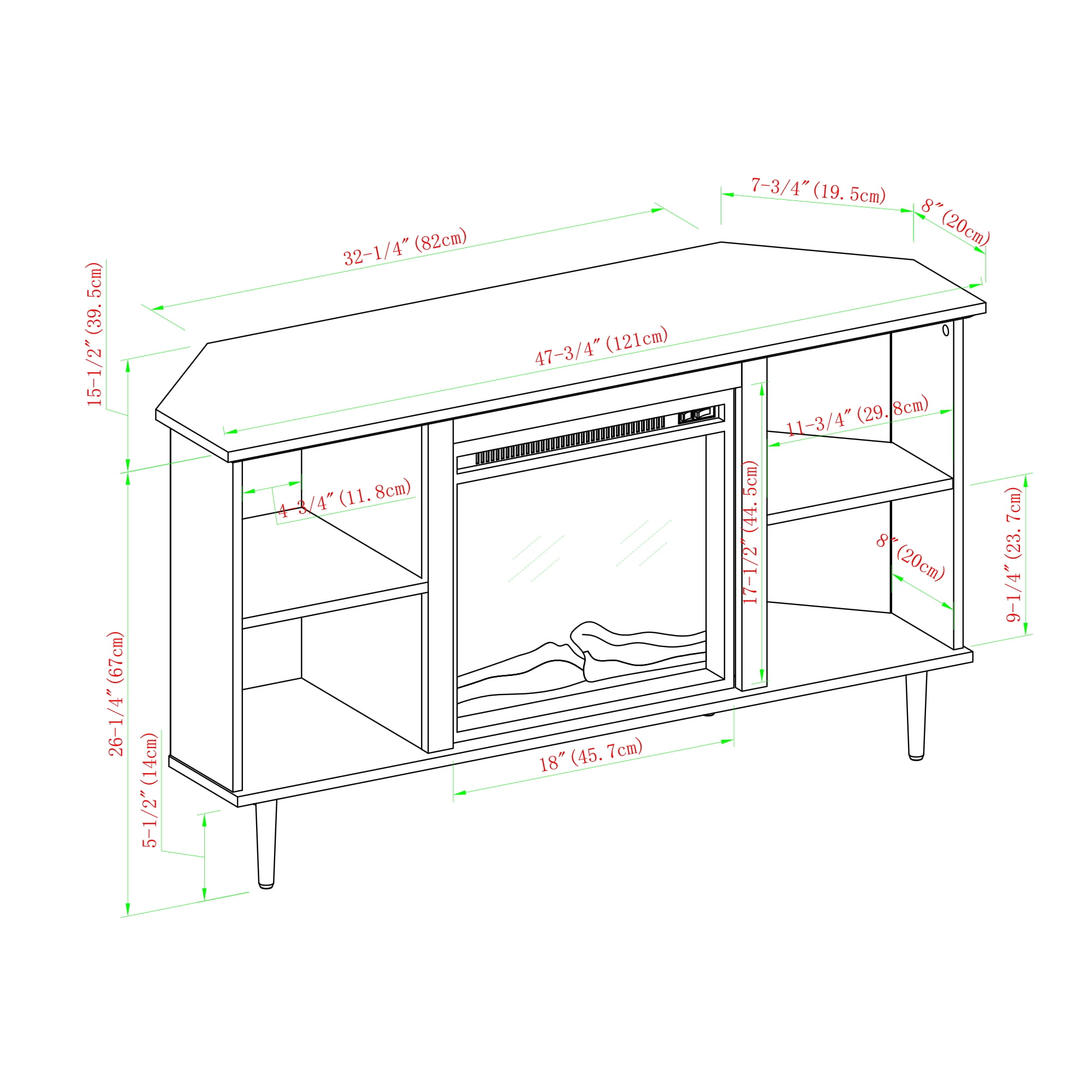 Manor Park Corner Fireplace TV Stand for TVs up to 55″, Grey Wash: Transitional modern style Grey wash finish Corner shape for small space homes 4 open storage cubbies for display space 2 fixed shelves Adjustable feet Organize cables with cord management holes Fireplace insert with 6-foot cord and universal plug Accommodates TVs up to 55 inches Materials: Warp-resistant MDF wood, durable laminate, and powder-coated steel Assembly: Ships ready-to-assemble with step-by-step instructions Assembled Dimensions: 26.25” H x 47.75” L x 15.75” W Package Dimensions: 9.5” H x 53” L x 23.75” W