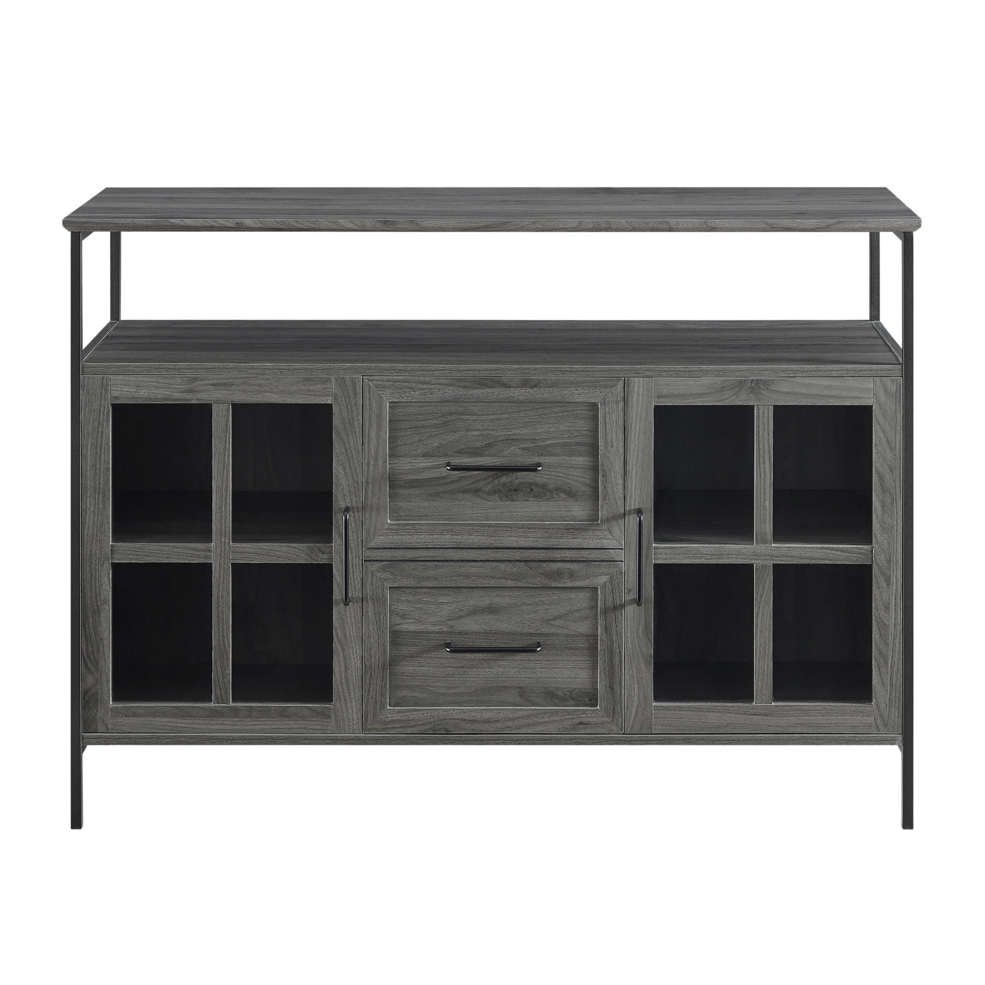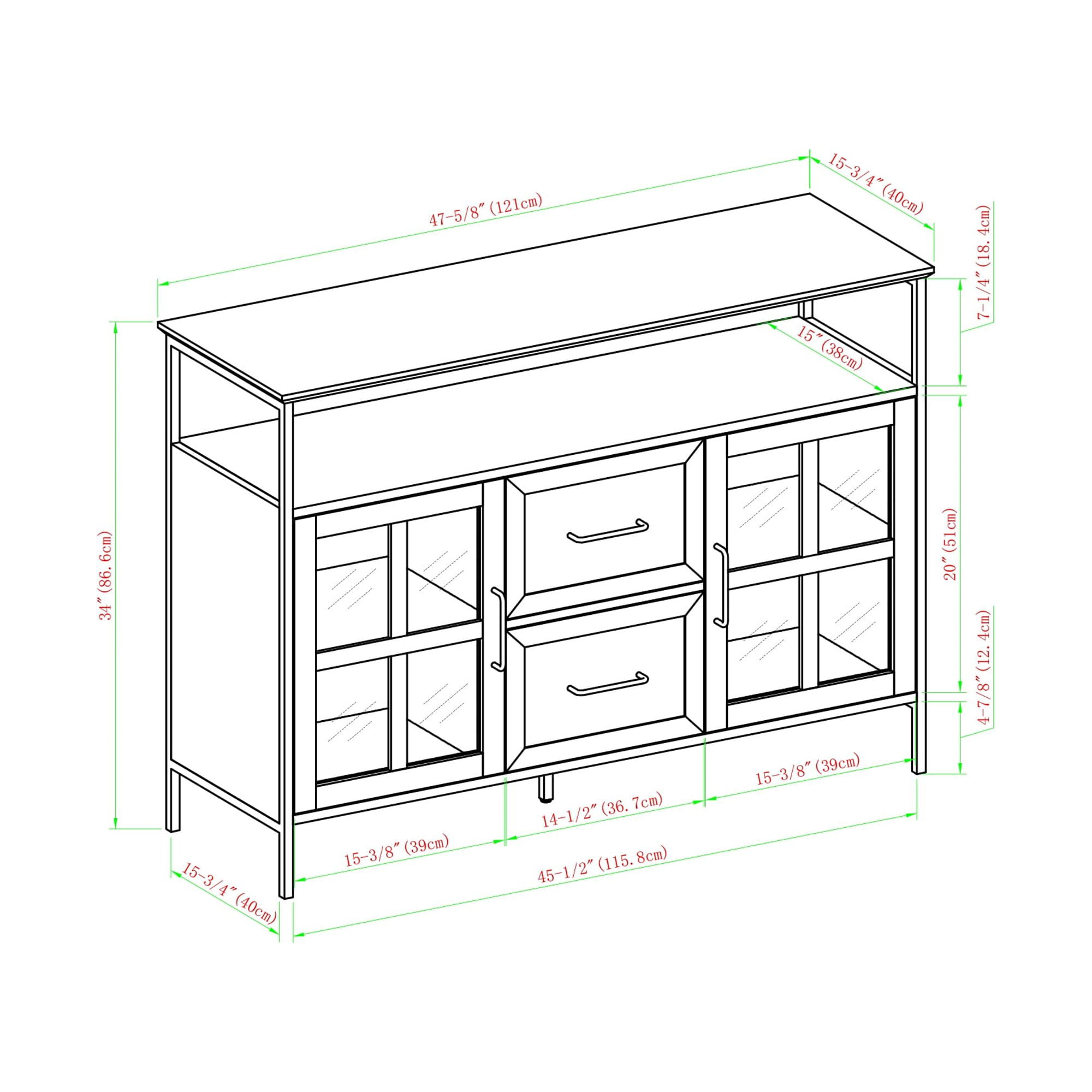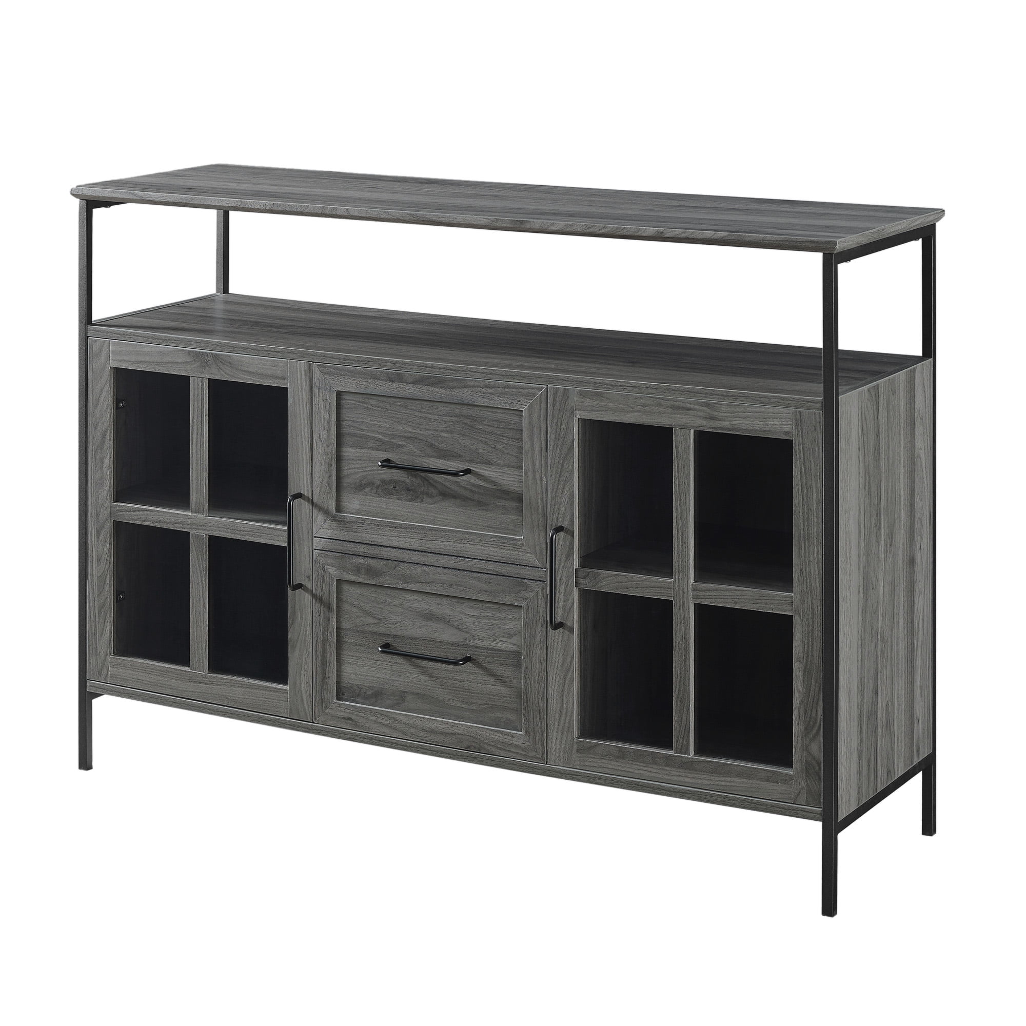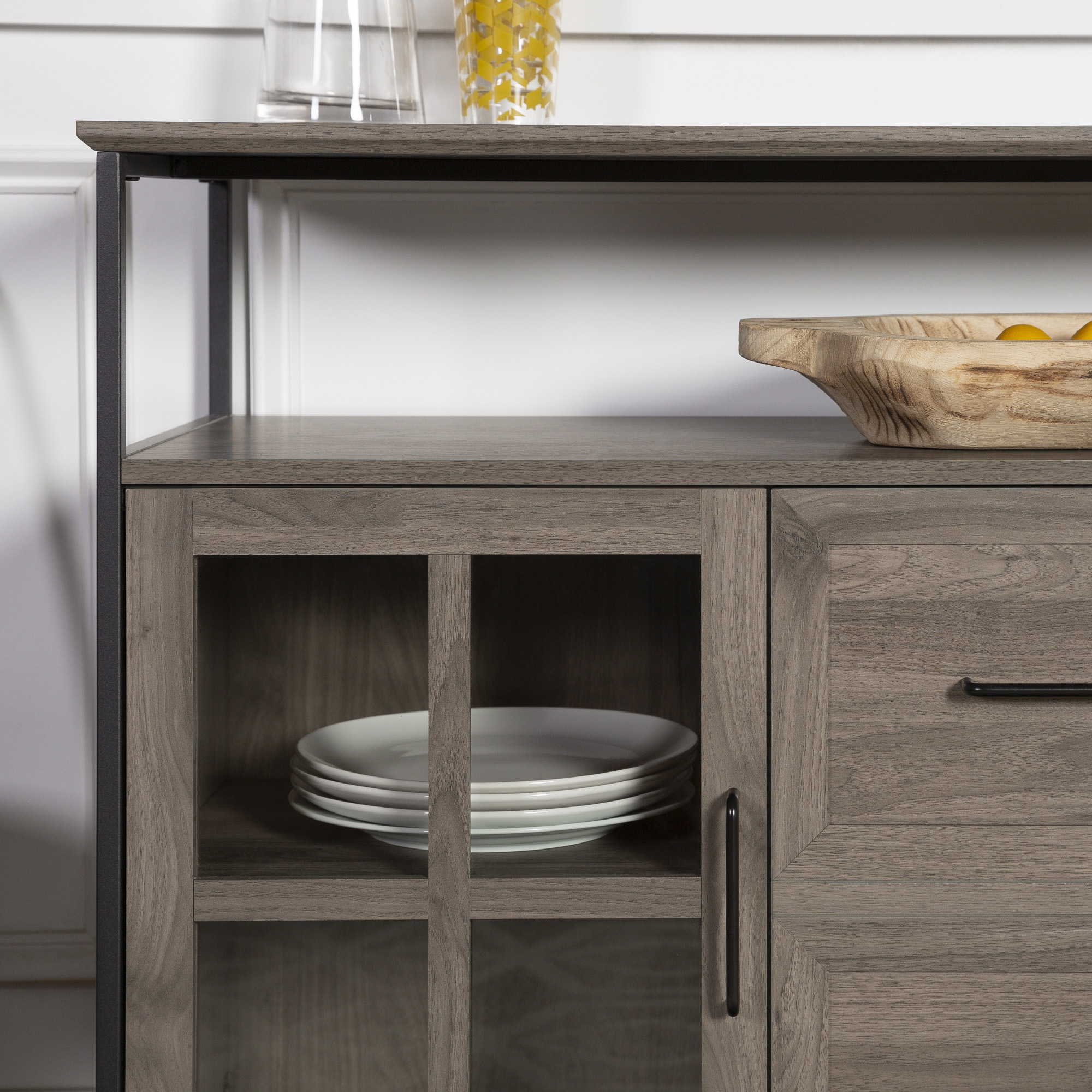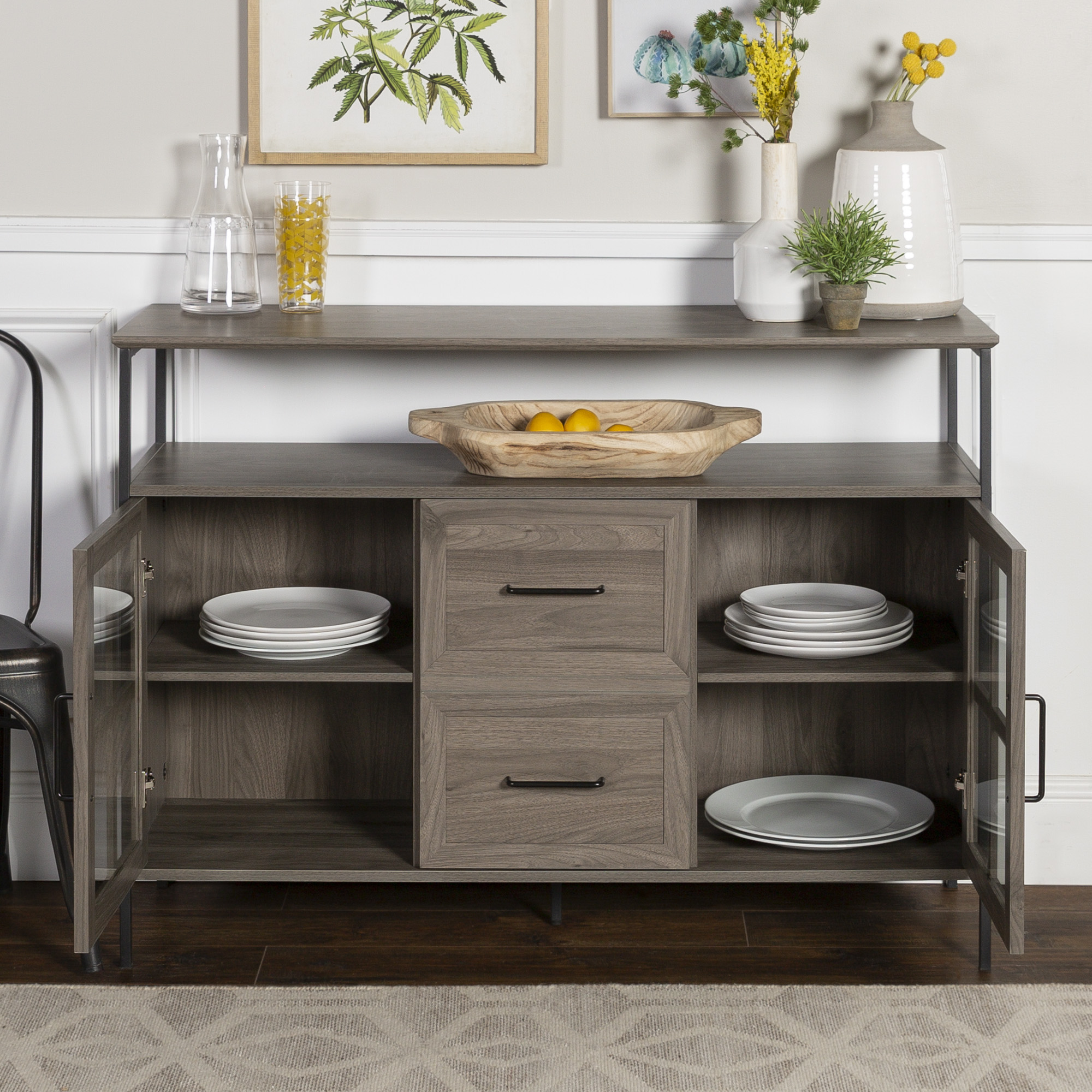 Open up your design possibilities with this three-door metal and wood buffet. The subtle mix of materials in this sideboard creates an industrial and gender-neutral look that can be used in a variety of rooms. There are three doors with soft close hinges on the bottom of the unit, two of which feature a classic fretwork design on tempered glass, while the door in the middle has a faux drawer facade. Behind the doors are adjustable shelves. The open section between the lower half of the unit and the top shelf also makes this piece functional as an entertainment center where it can accommodate TVs up to 52-inches.