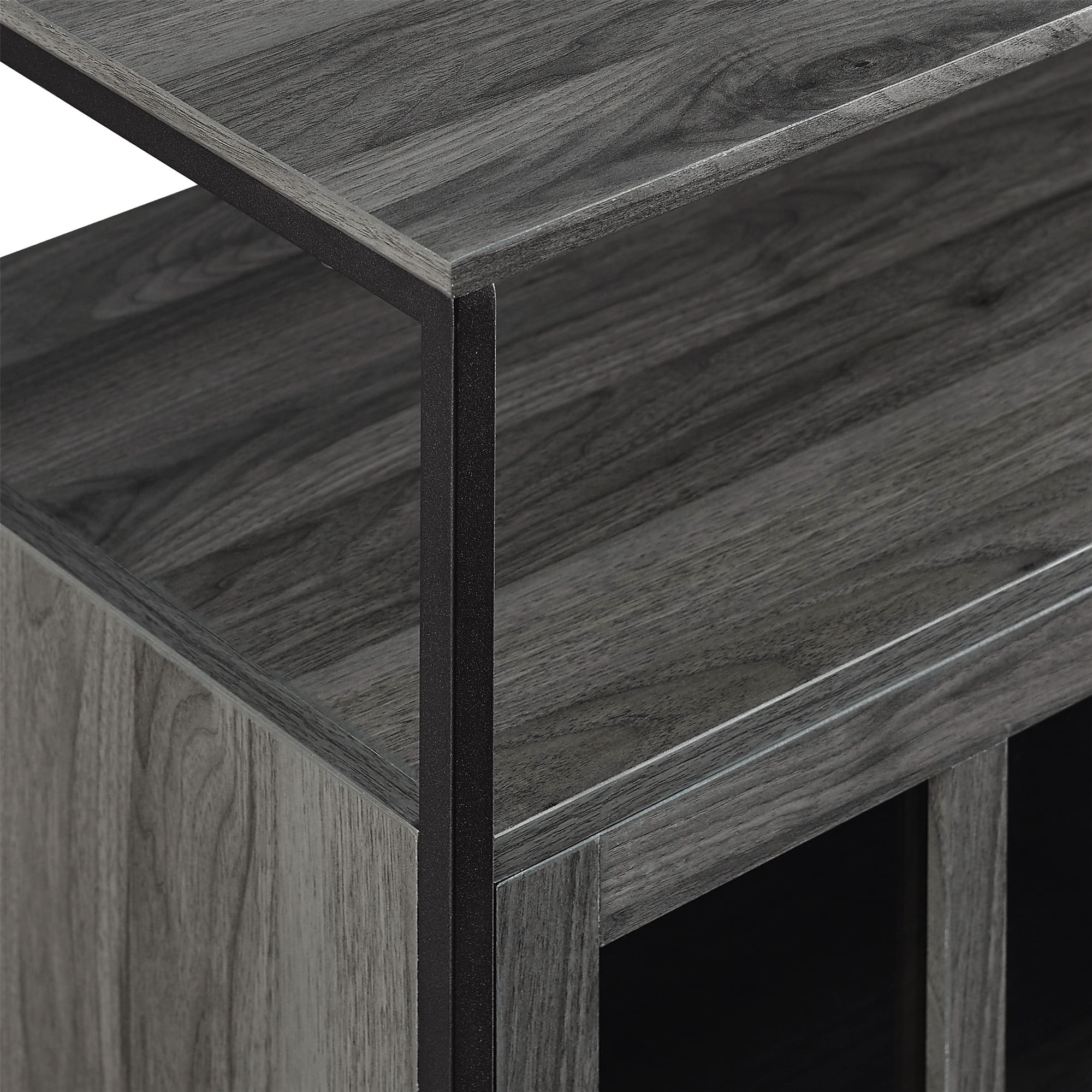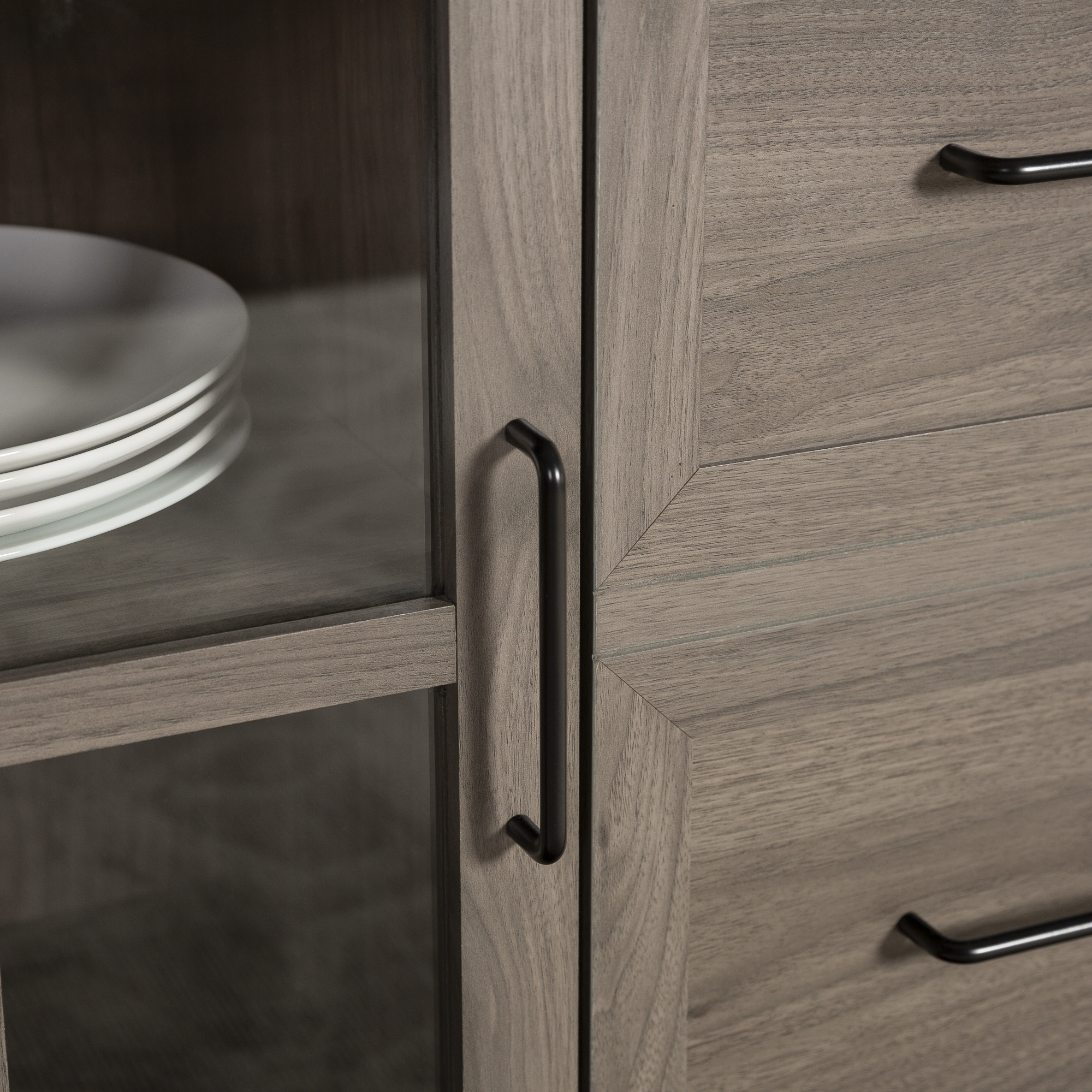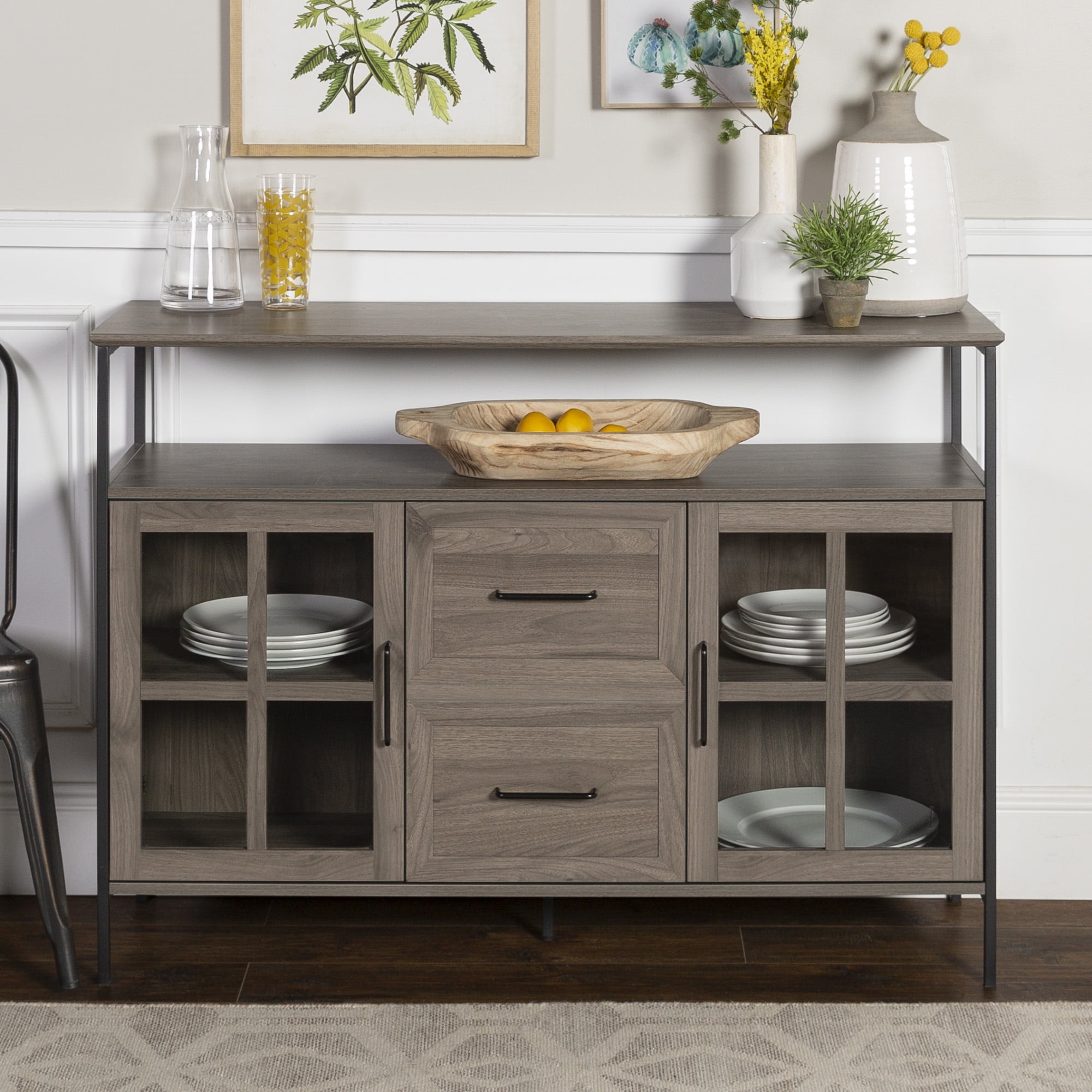 Manor Park Industrial 3-Door Storage Buffet, Slate Grey Use as a buffet, sideboard, or media console 3 doors with adjustable soft-close hinges Open and closed storage Adjustable shelves Accommodates up to a 52″ TV High-grade MDF, high-quality laminate, powder-coated steel, tempered glass 34.75″ H x 47.5″ L x 15.75″ W; 88 LBS. Ships ready-to-assemble with step-by-step instructions