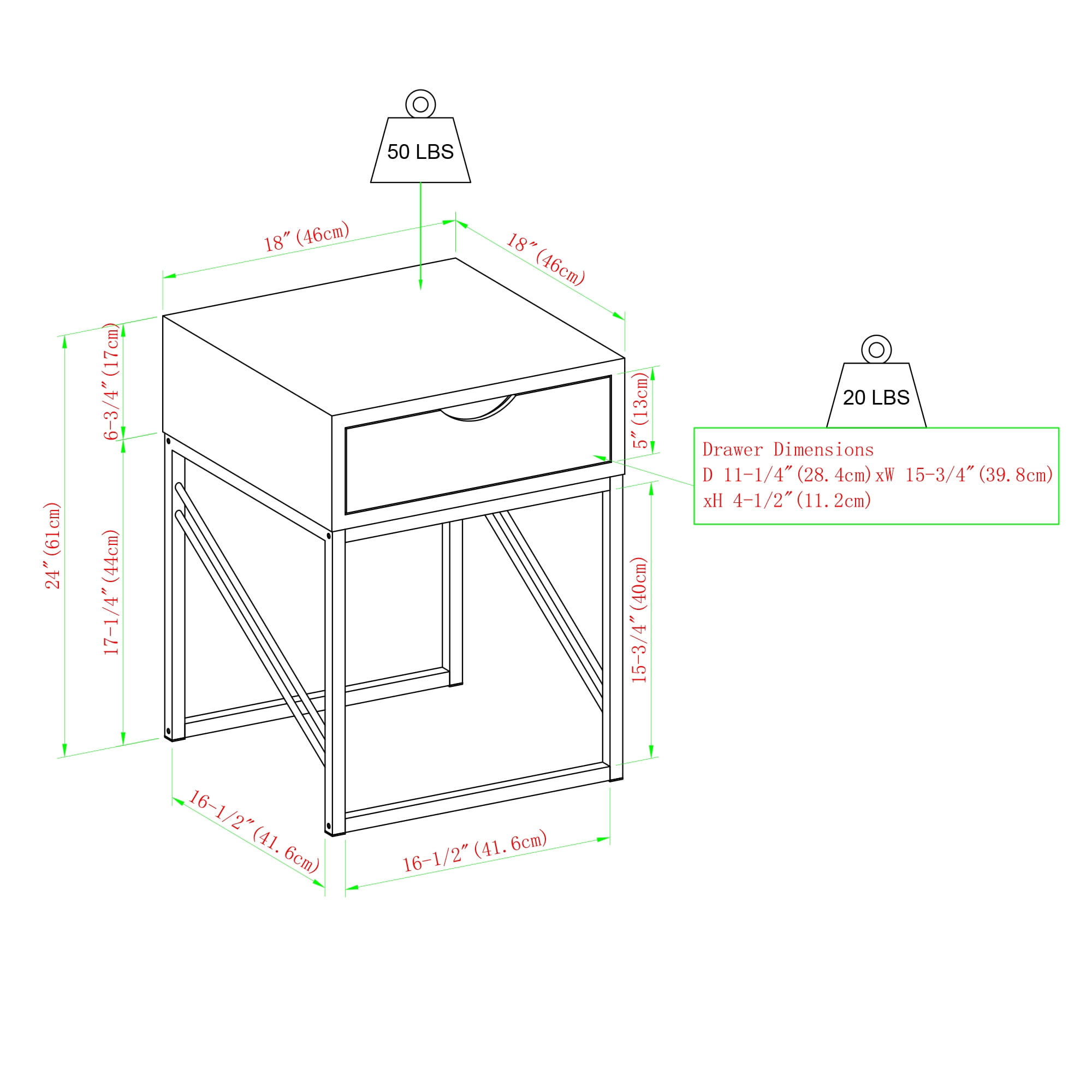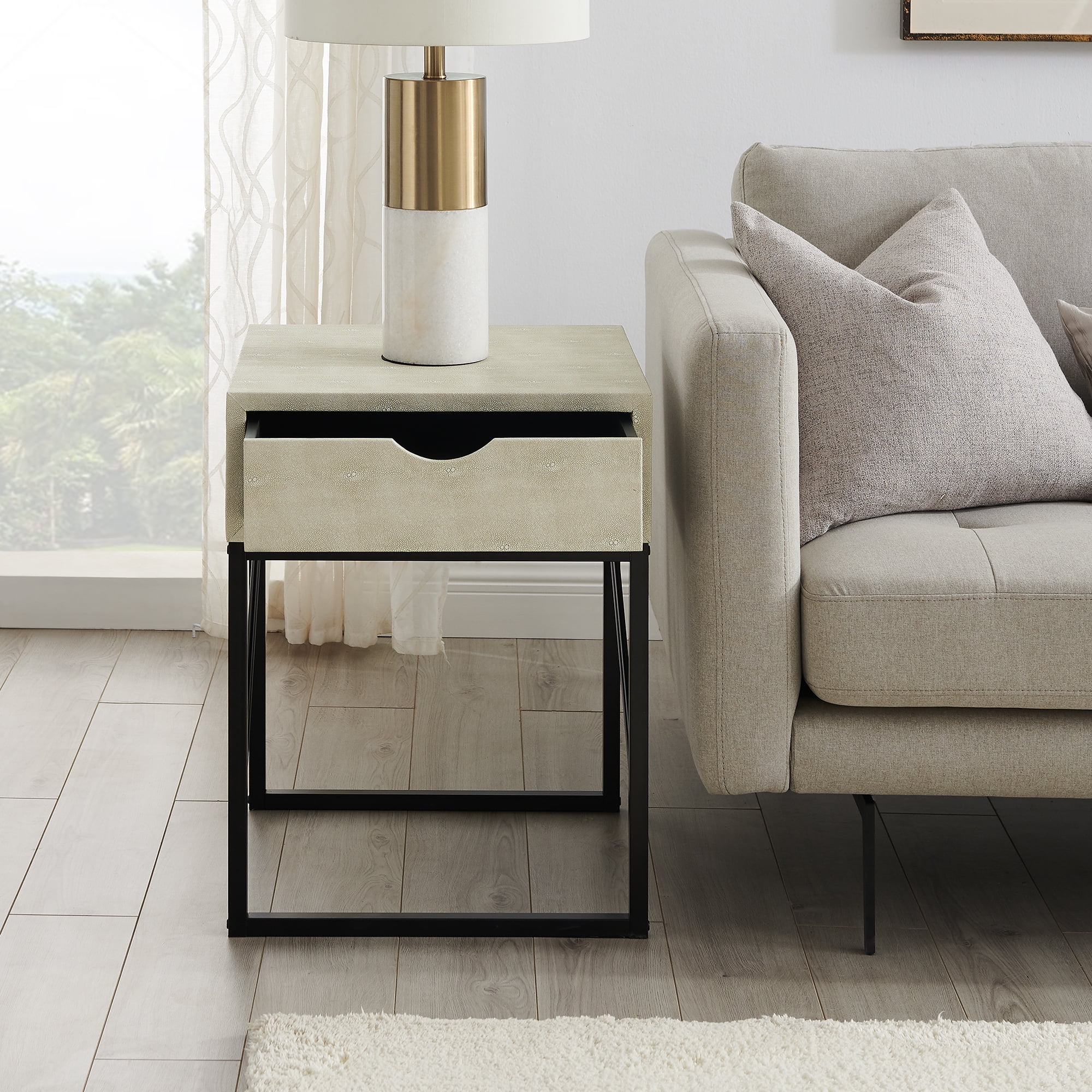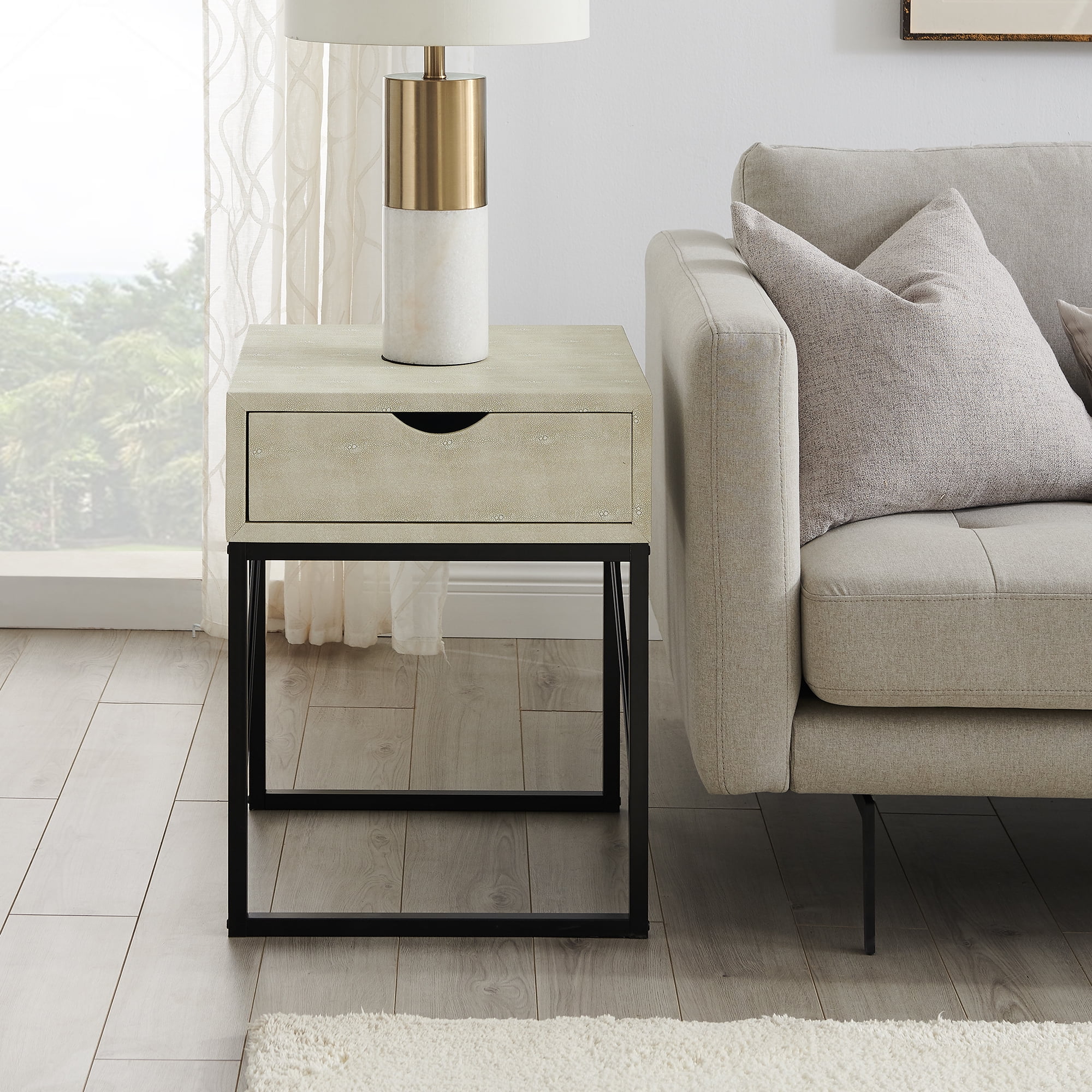 Modern glam style Faux shagreen off white finish Single drawer on wood runners and a fabric-lined interior Attractive cutout handles Unique, metal leg details Easy assembly; just add the base Pair with the matching coffee table Made from warp-resistant MDF wood, non-woven polypropylene, and powder-coated steel Ships ready-to-assemble with step-by-step instructions Assembled Dimensions: 24” H x 18.25” L x 18.25” W Packaged Dimensions: 22.5” H x 22” L x 15” W