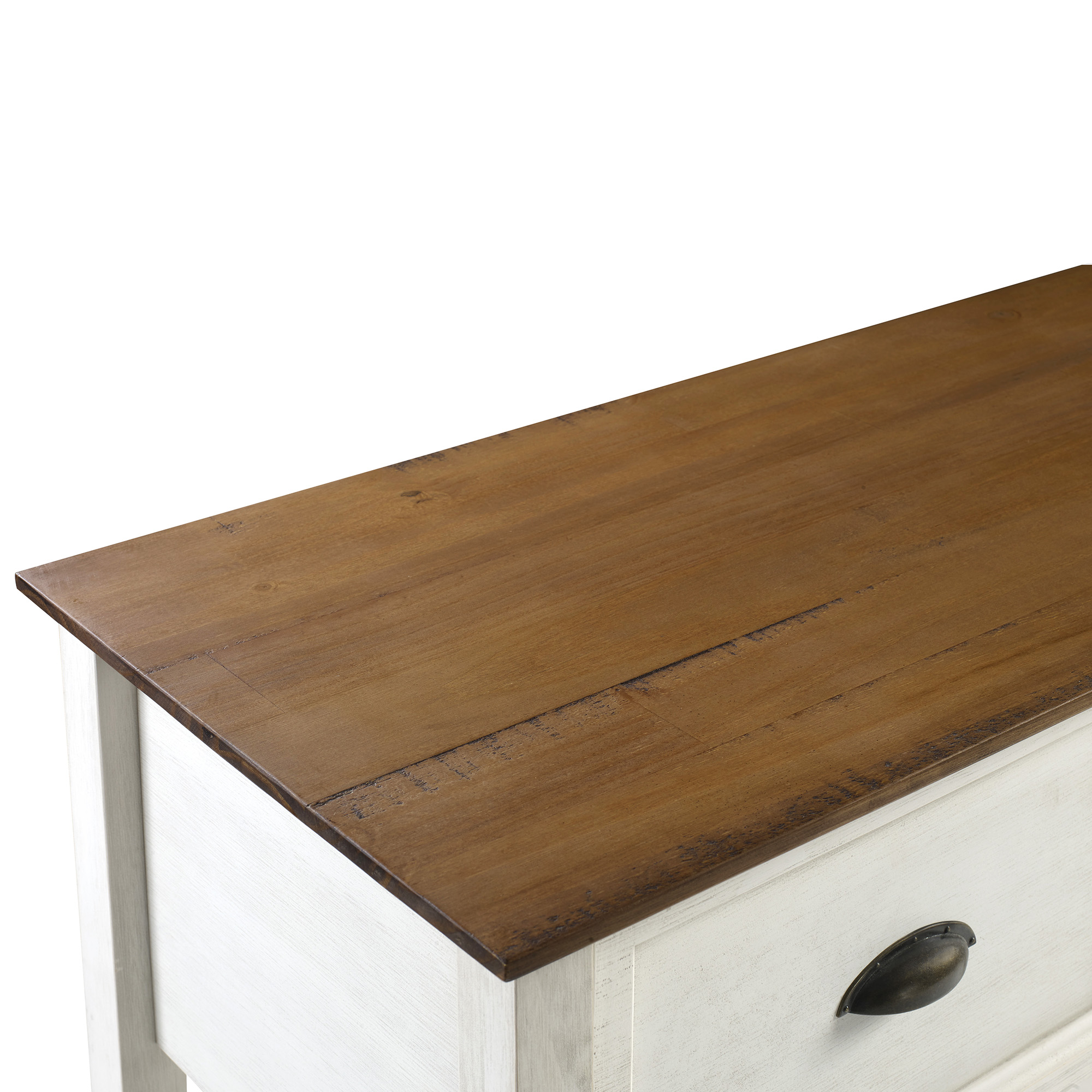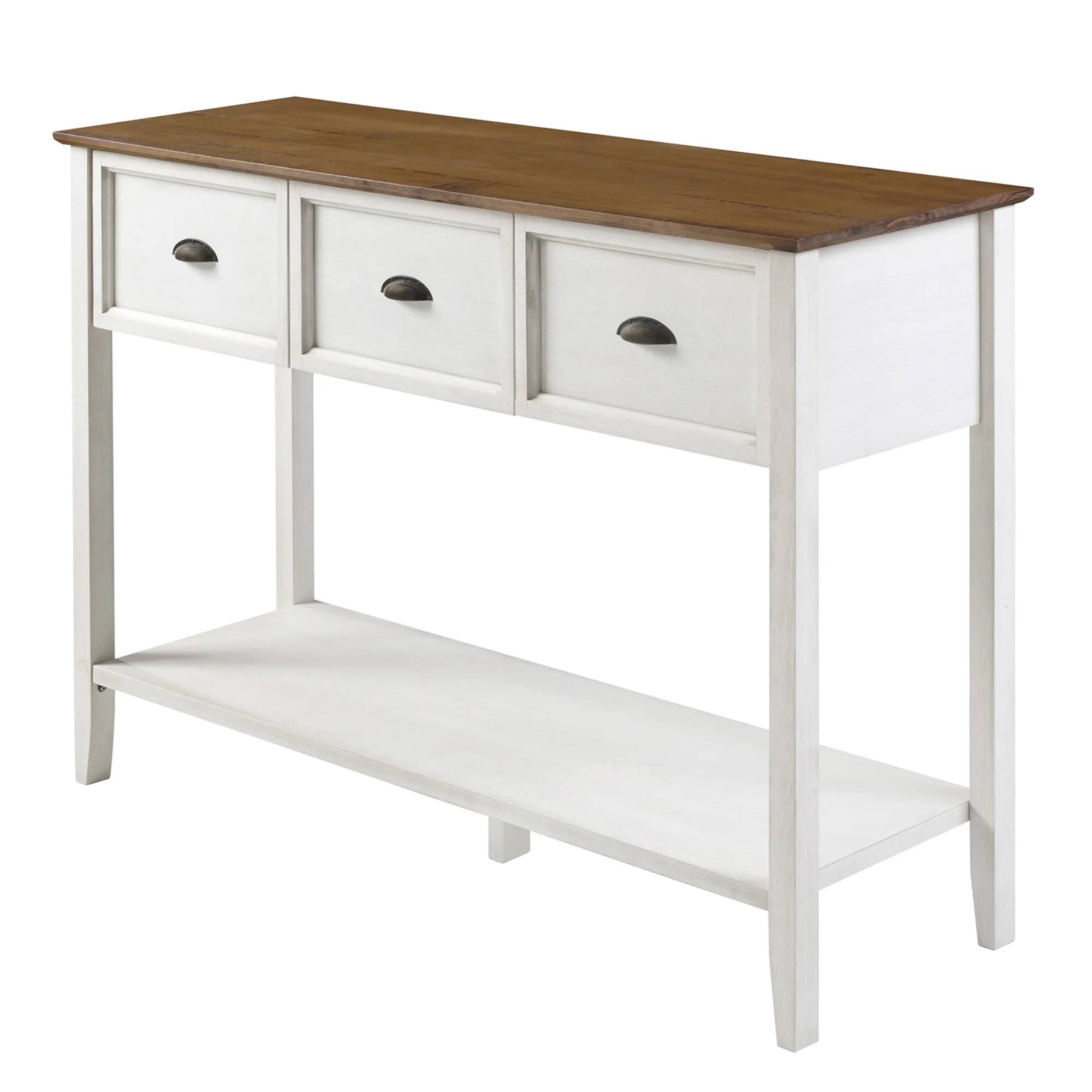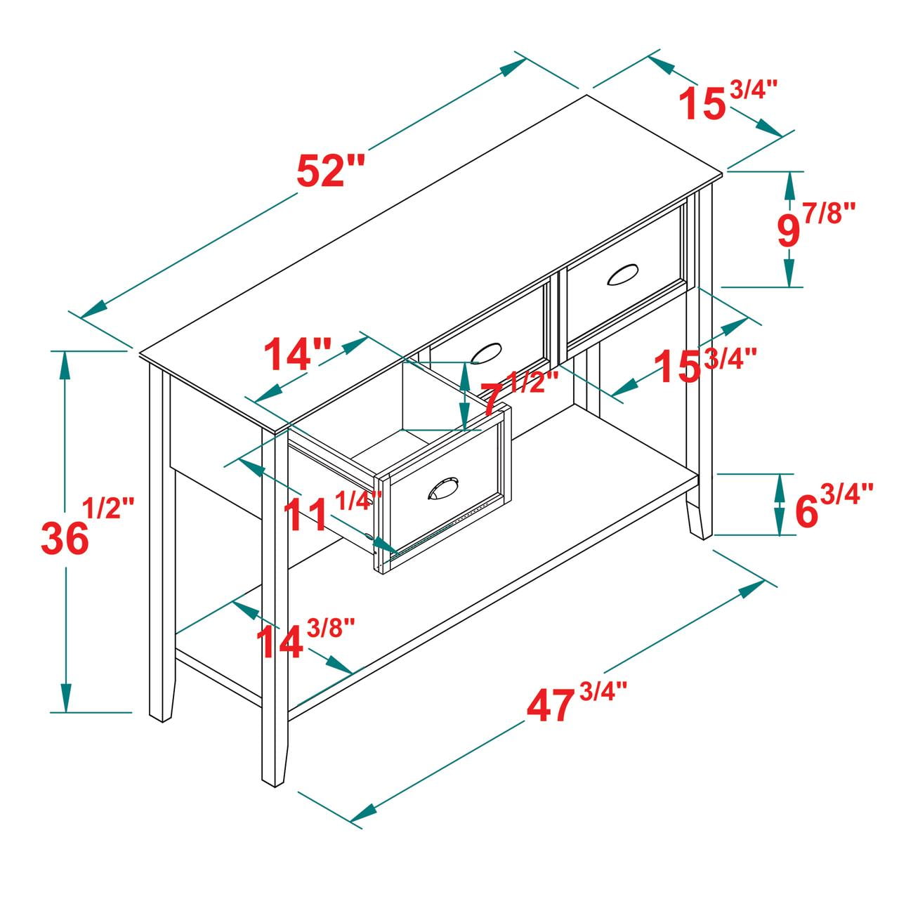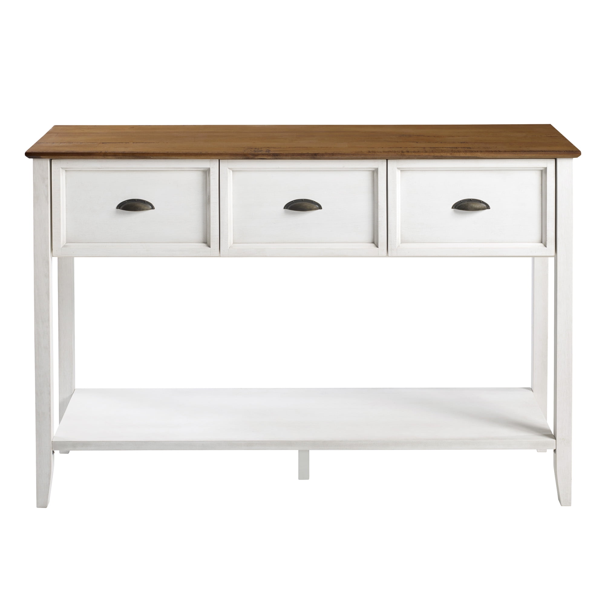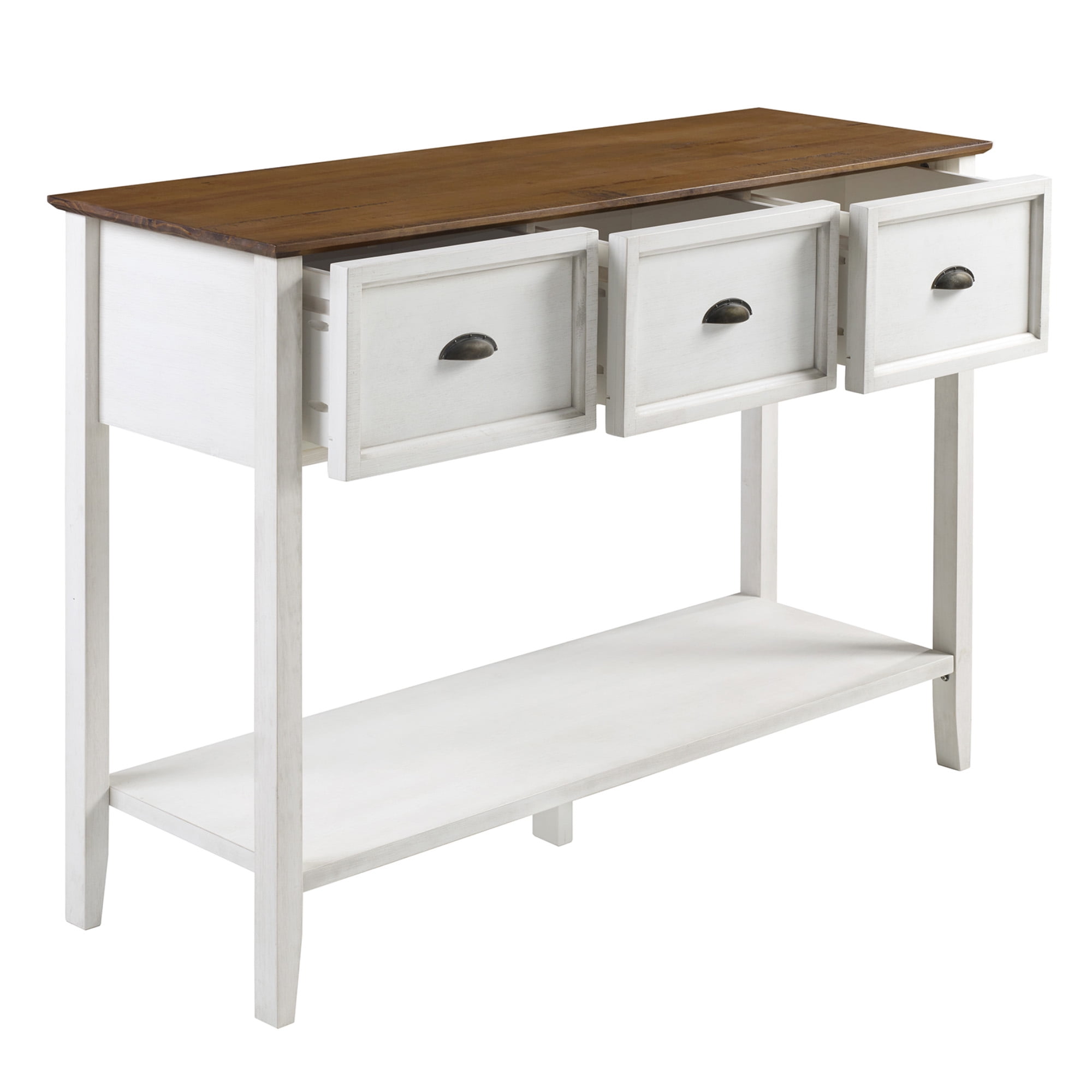Manor Park Modern Farmhouse 3 Drawer Buffet Table, Reclaimed Barnwood/White Modern farmhouse style Reclaimed barnwood and white finishes 3 drawers on smooth, wood glides Lower open storage shelf made of warp-resistant MDF wood Center support foot for extra stability Made from solid pine wood responsibly harvested from renewable forests Use as an entry or sofa table Ships ready-to-assemble with step-by-step instructions Assembled dimensions: 36.5″ H x 52″ L 15.75″ W Packaged dimensions: 7” H x 57” L x 21” W