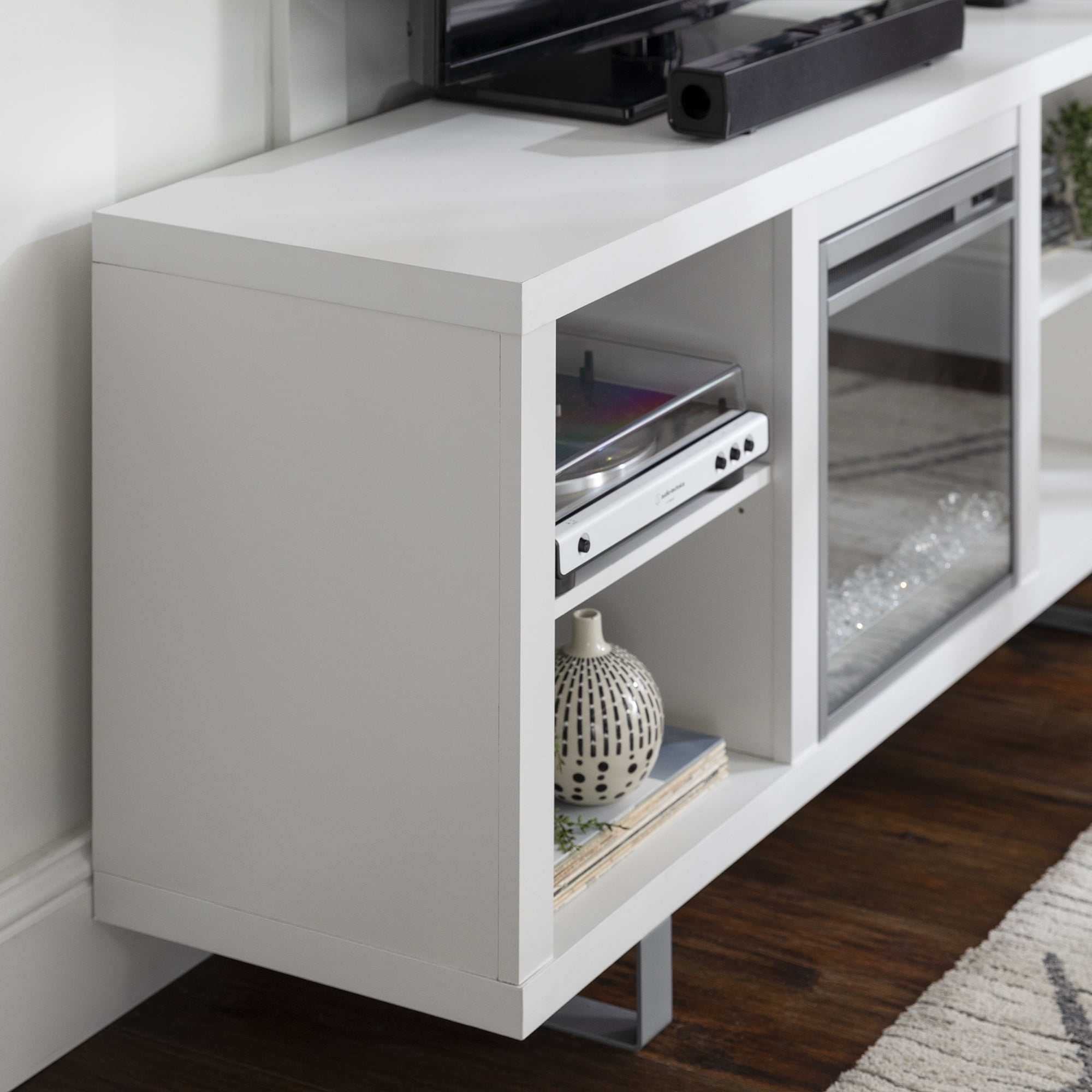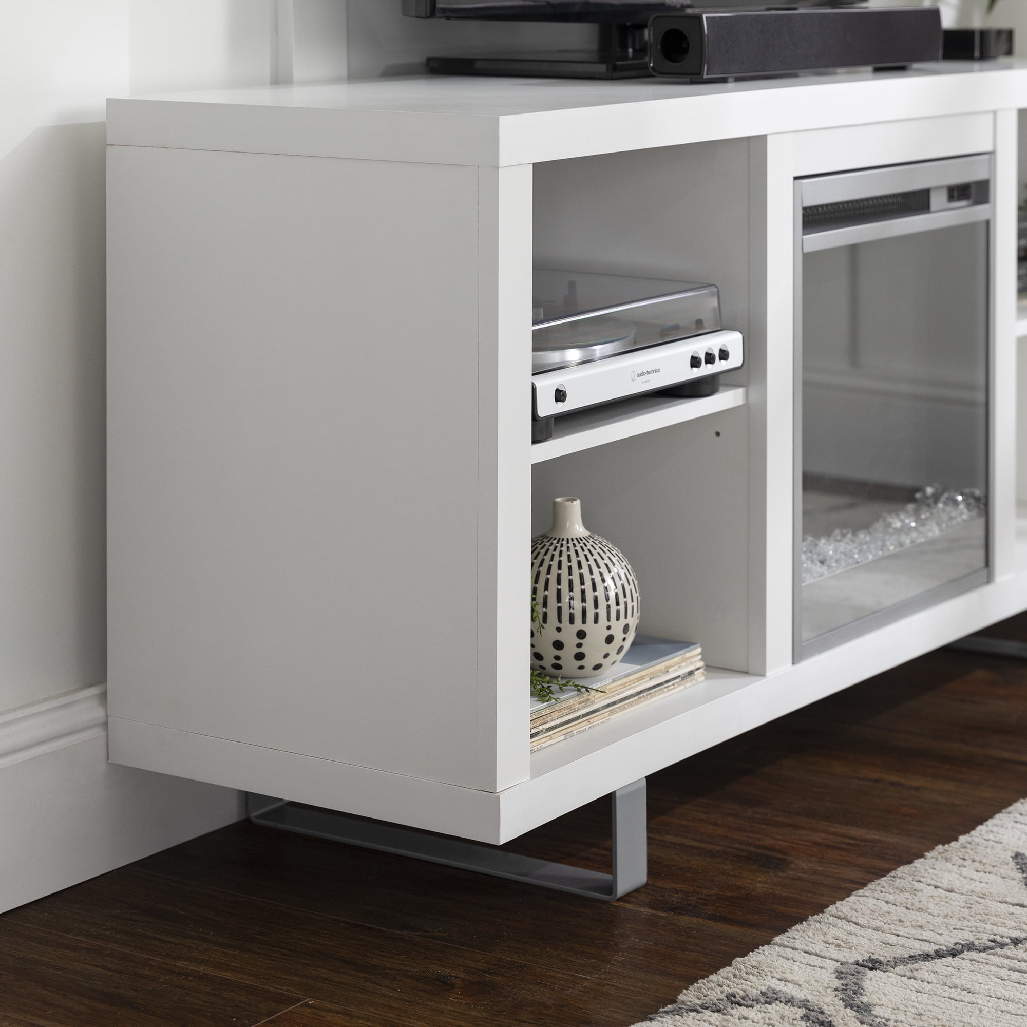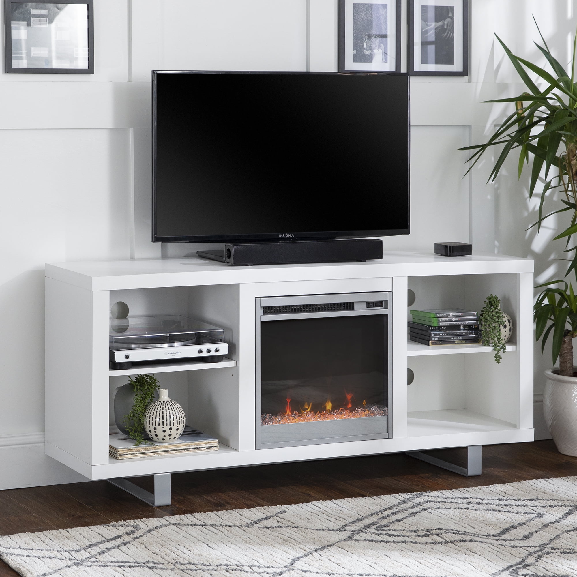 Manor Park Modern Fireplace TV Stand for TVs up to 64″, White: Features a trendy, modern design style to update your home Ideal for your living room or bedroom to add heat and fashionable style Electric fireplace simply plugs in, with no electrician needed Cable management holes to maintain a clutter-free space 58″white modern fireplace TV stand Holds TVs up to 64″