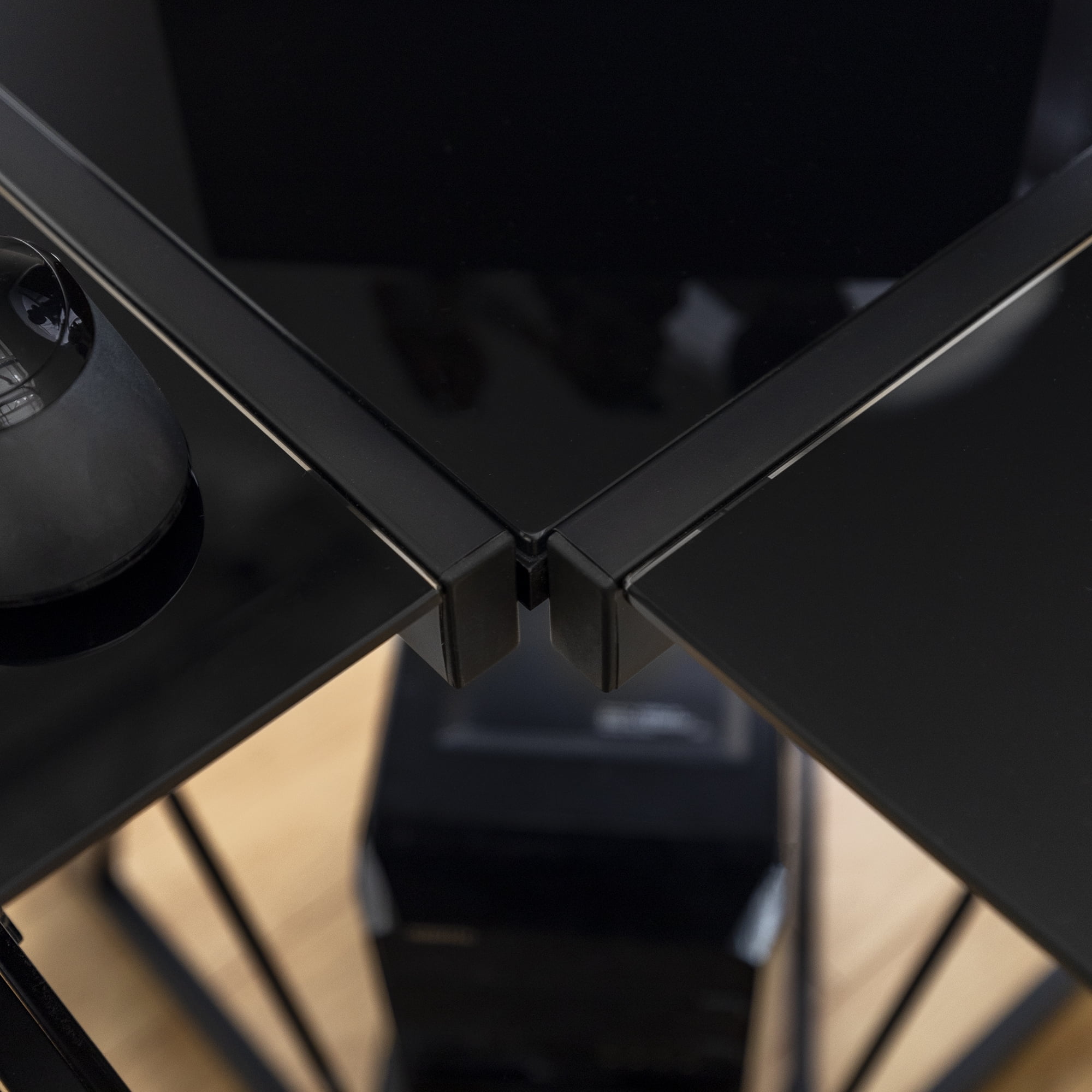 Modern Glass and Metal Black L-Shaped Corner Computer Desk by Manor Park: Contemporary and modern design style. Polished and beveled tempered safety glass top. A durable, steel metal frame with a powder-coated finish holds up the tabletop. In a versatile design that allows you to separate it into two desks if needed. Ships ready-to-assemble with step-by-step instructions.