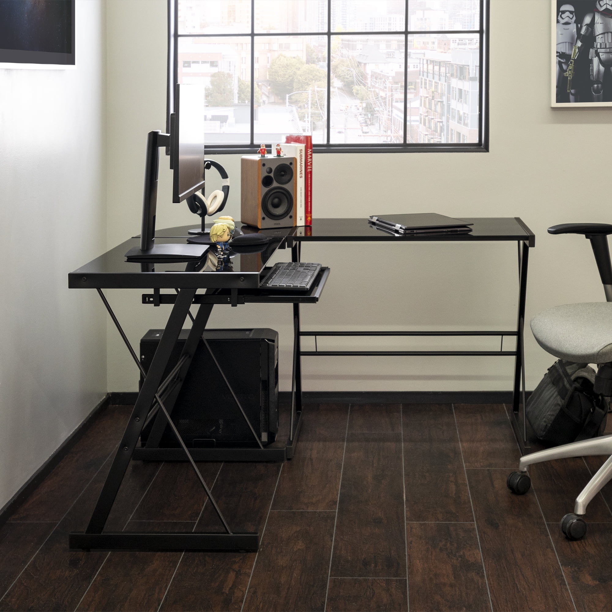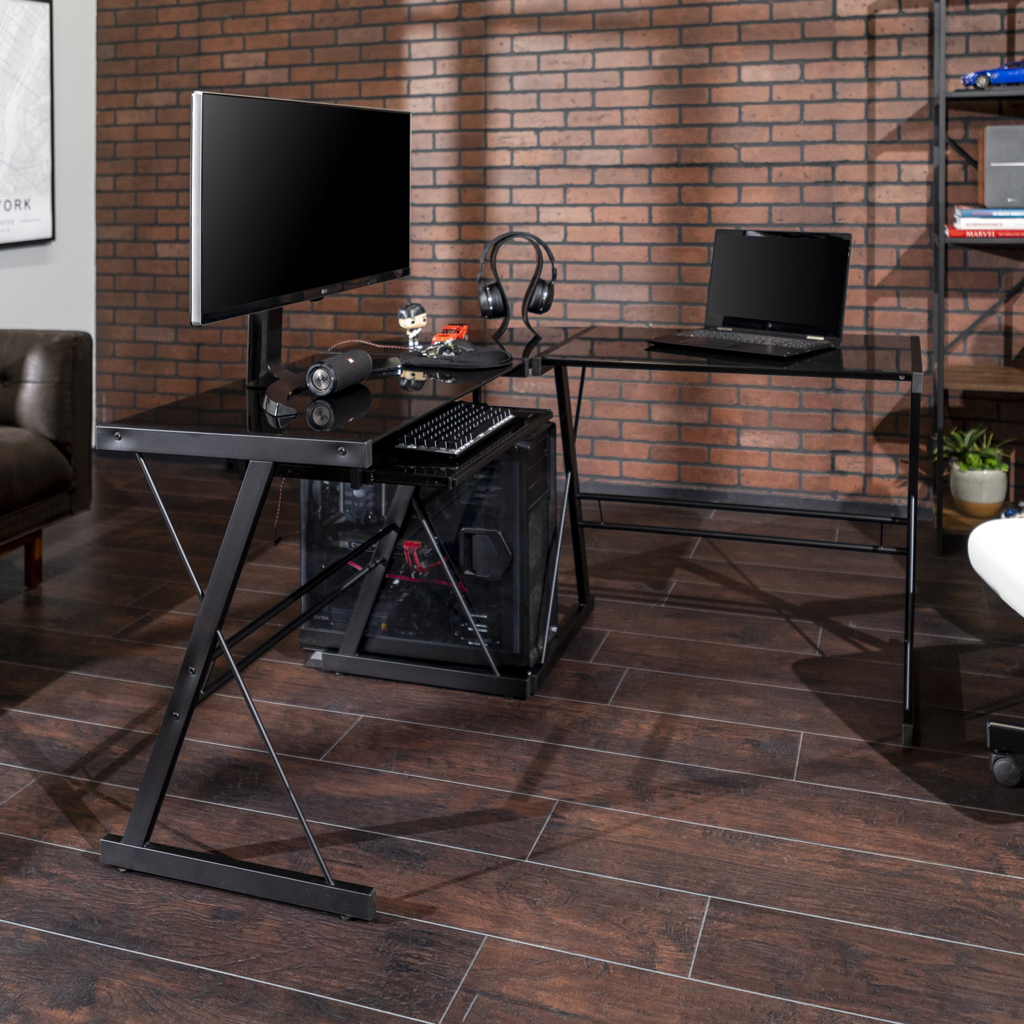 Manor Park Modern Glass and Metal Black L-Shaped Corner Computer Desk