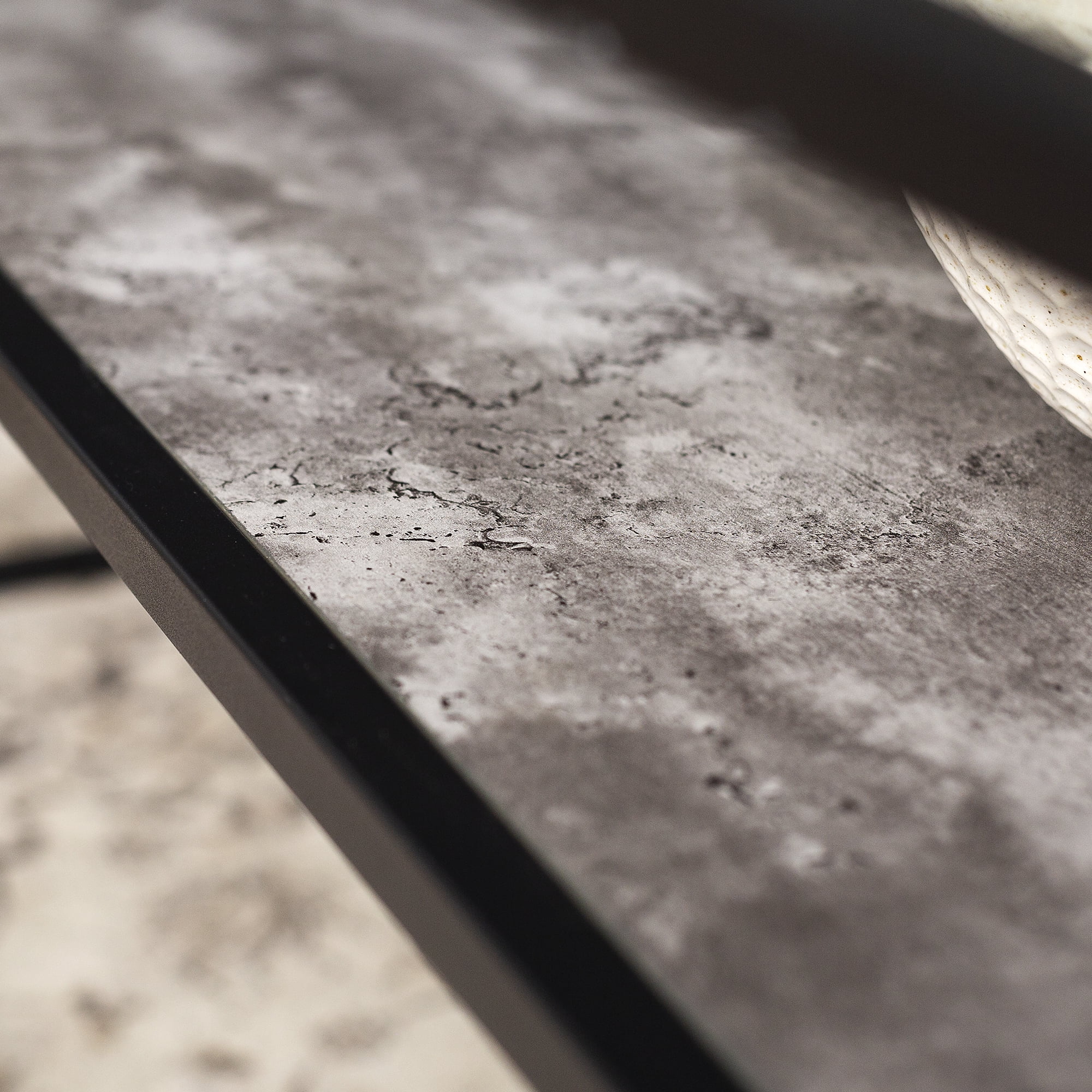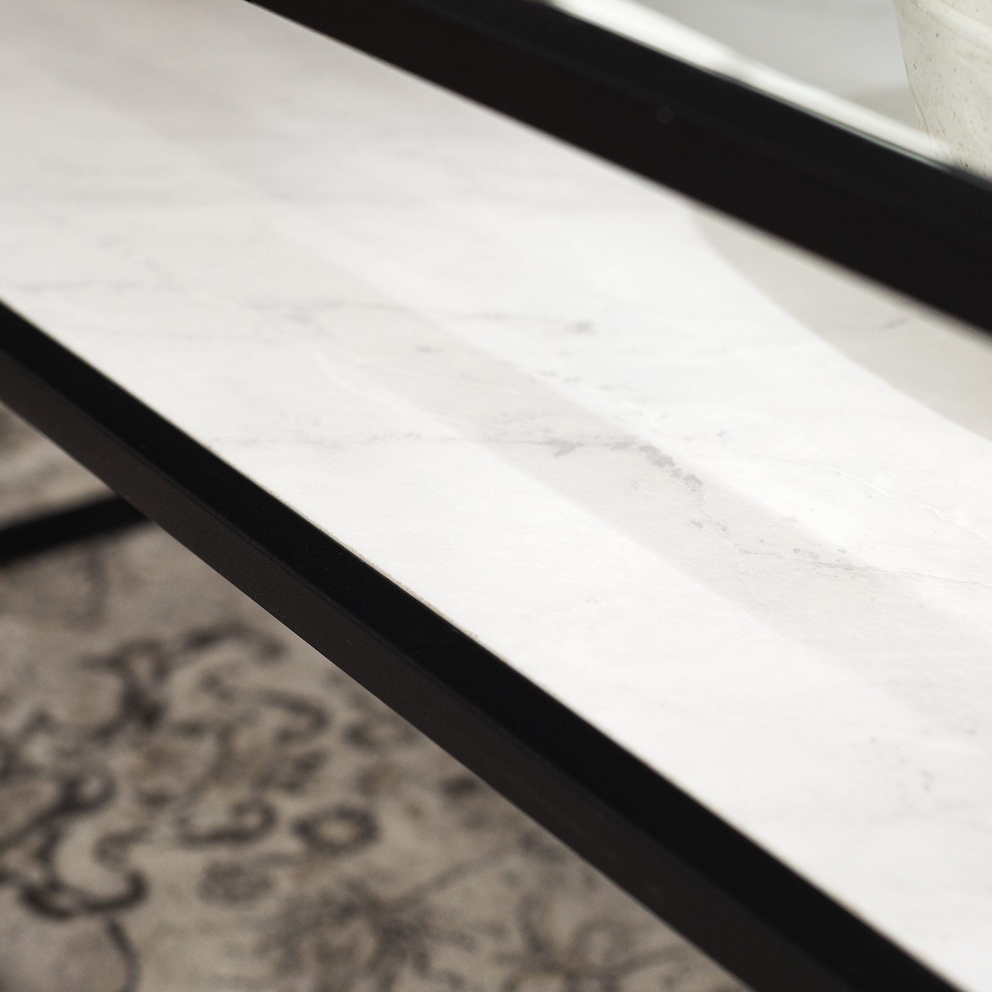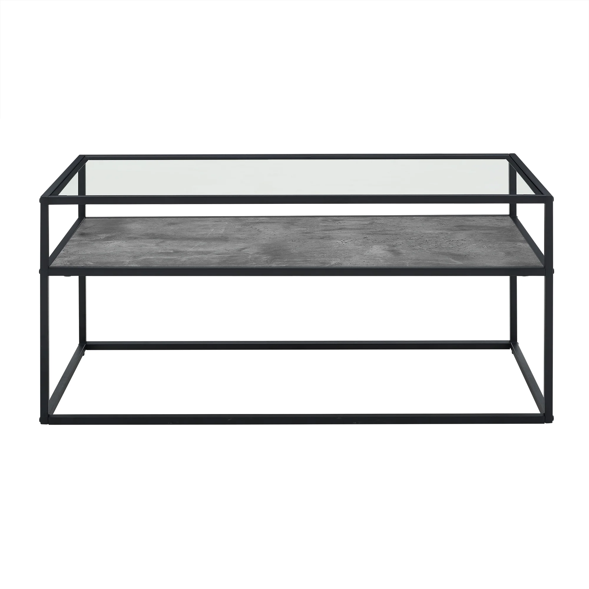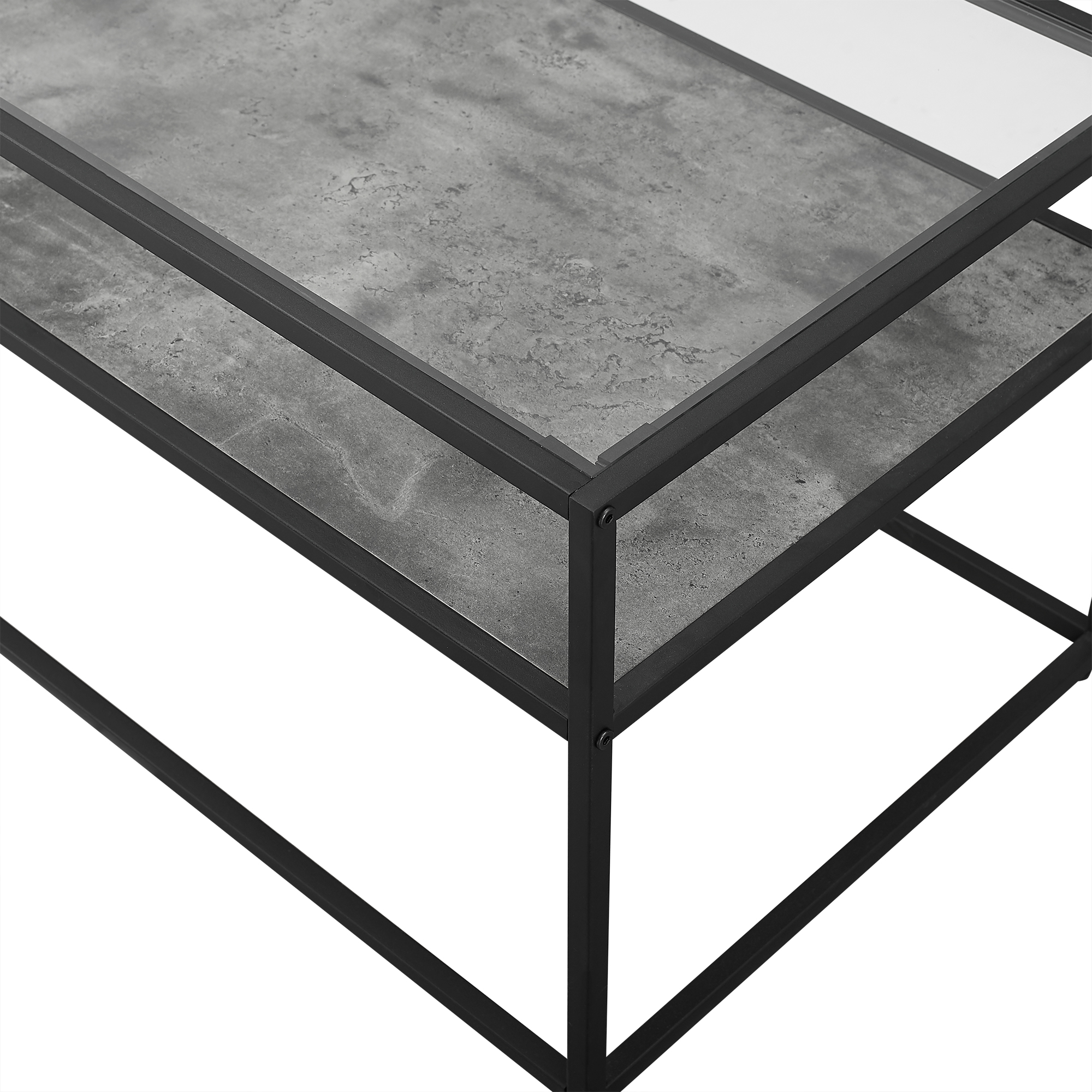 Packaged Dimensions: 5? H x 43? L x 23? W Assembled Dimensions: 18″ H x 40″ L x 20″ W Materials: High-grade MDF, durable laminate, powder-coated metal, and tempered safety glass Assembly: Some assembly required White faux marble and dark concrete finish Urban industrial coffee table Reversible lower shelf Open box frame Mixed material Glass tabletop