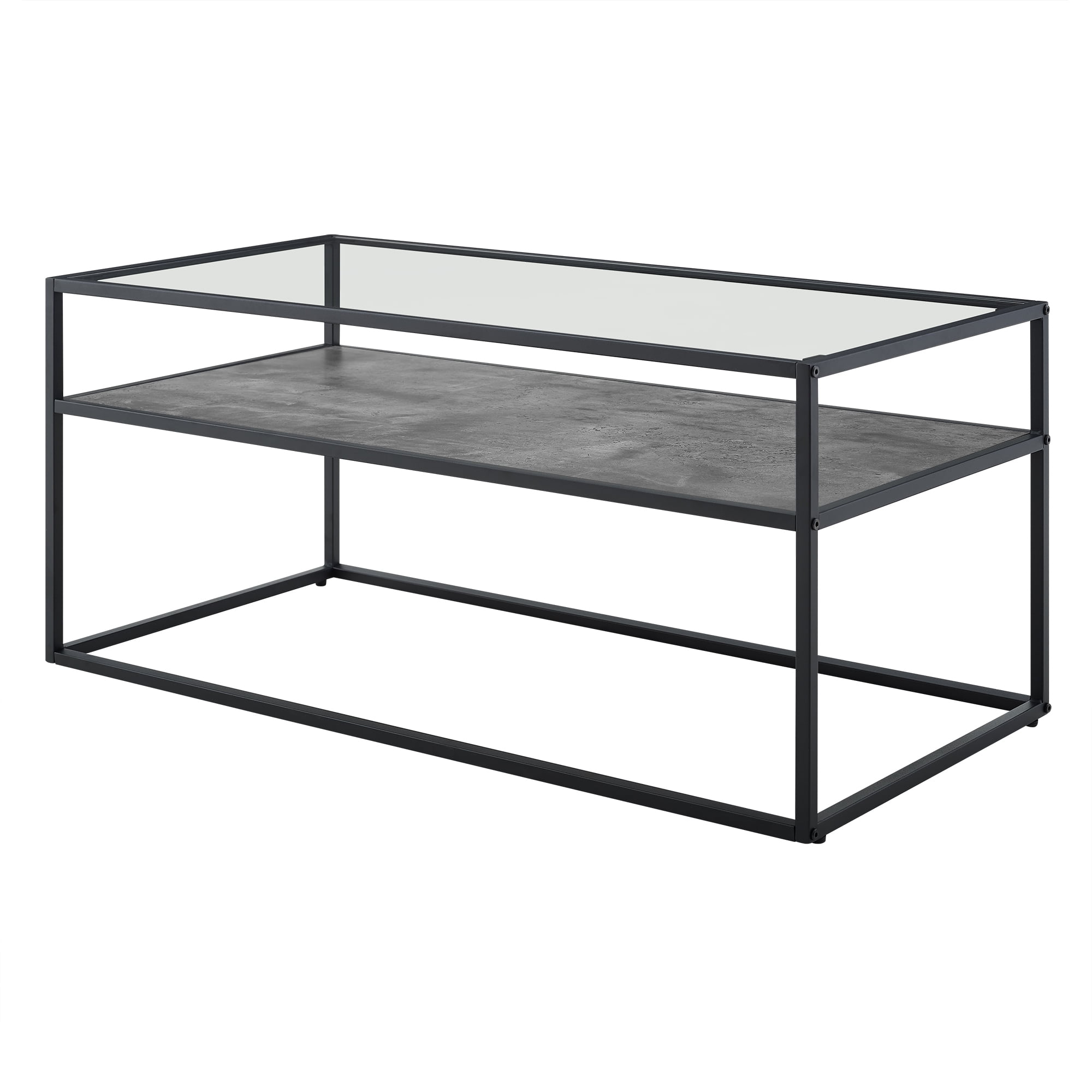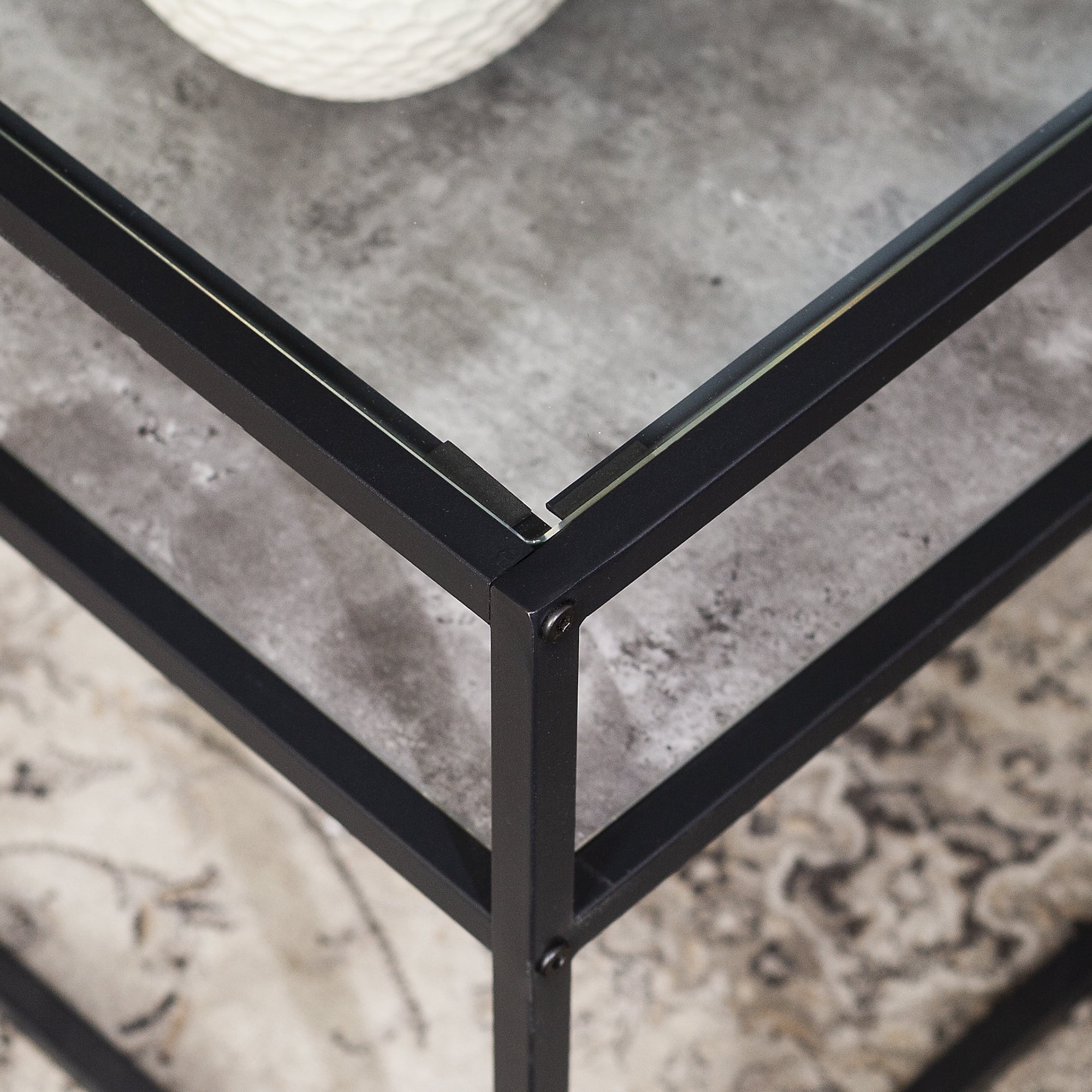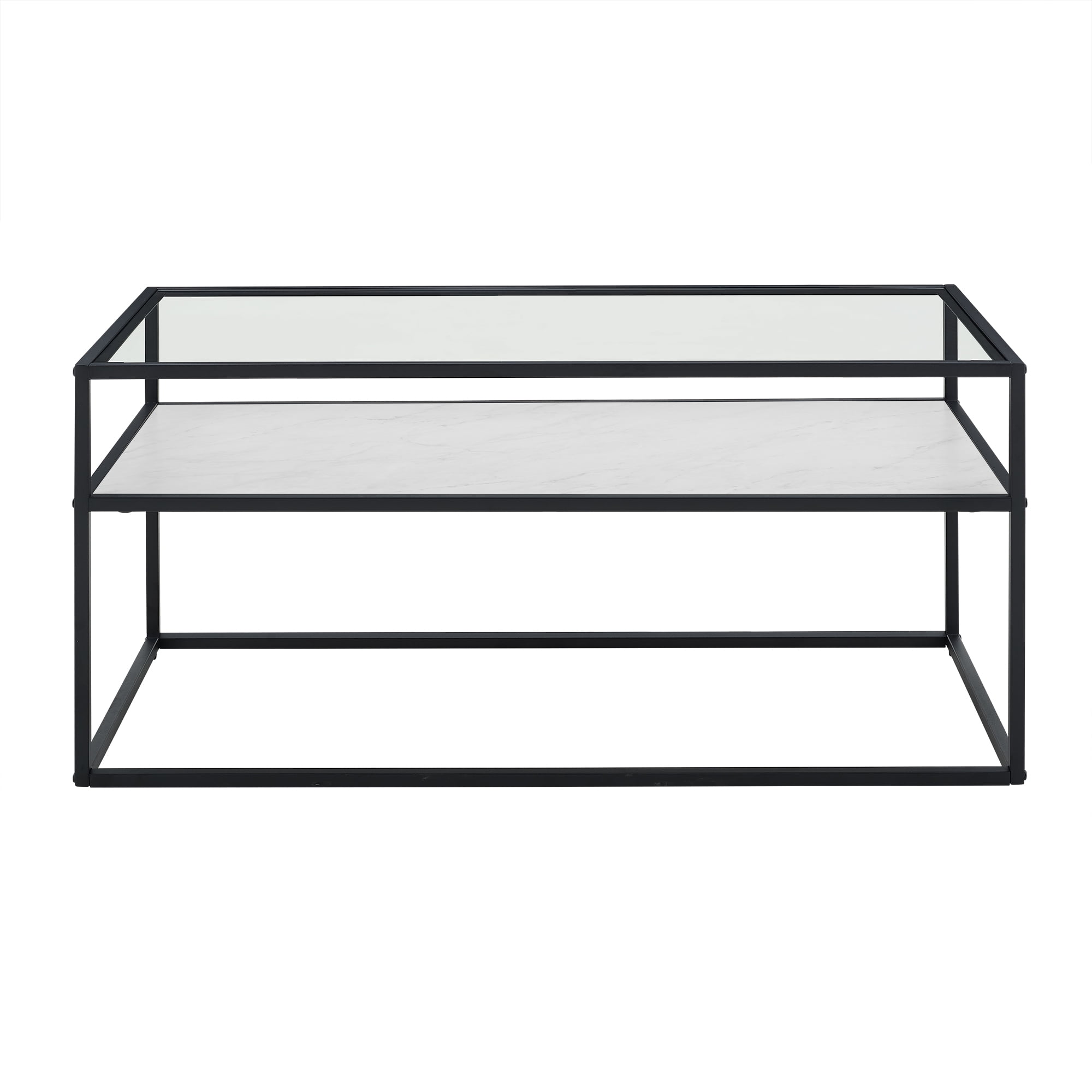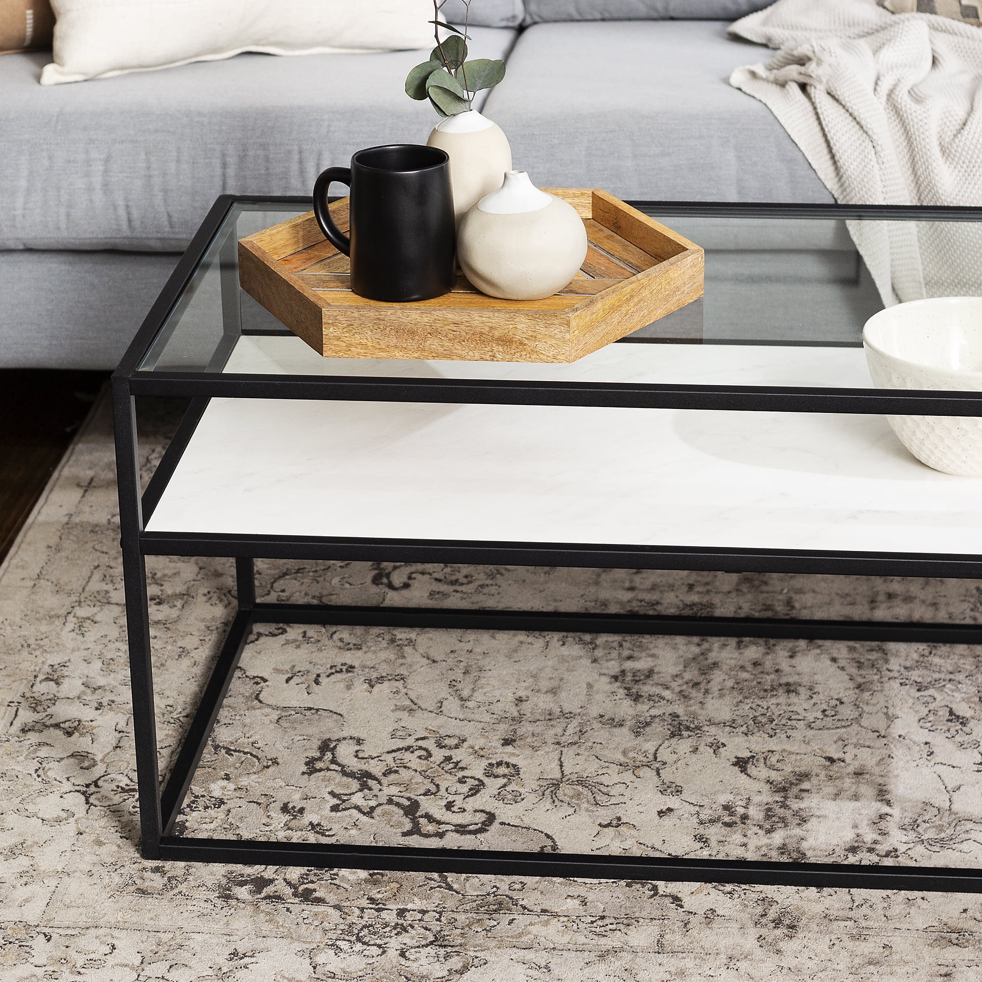 Upgrade your sleek, urban living room with this modern coffee table by Manor Park. The glass tabletop and lower faux marble shelf provide a perfect place for your favorite magazines, TV remotes, and other objects. The open box legs can be used as their own storage area for blankets, stacks of books, or crates of vinyl. Made from high-grade MDF, durable laminate, powder-coated metal, and tempered safety glass, this industrial coffee table is sturdily constructed so it will grace your living room for years to come. Invite friends over to sit back, drink tea, and chat about the latest film releases over this sophisticated piece of furniture.
