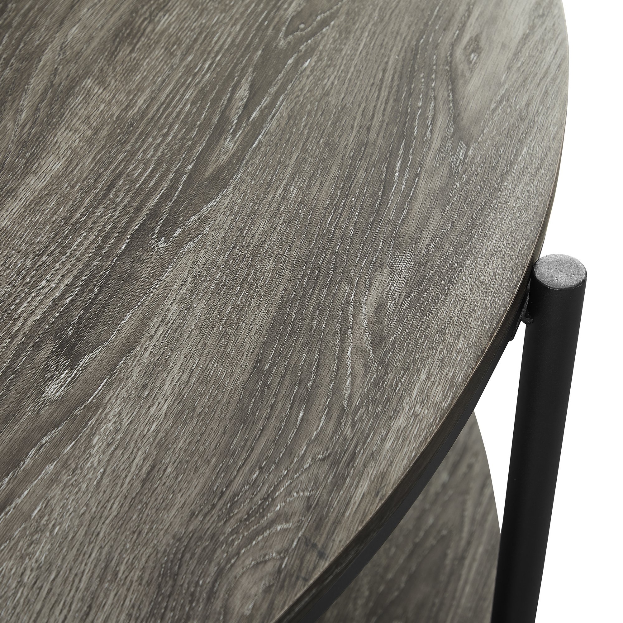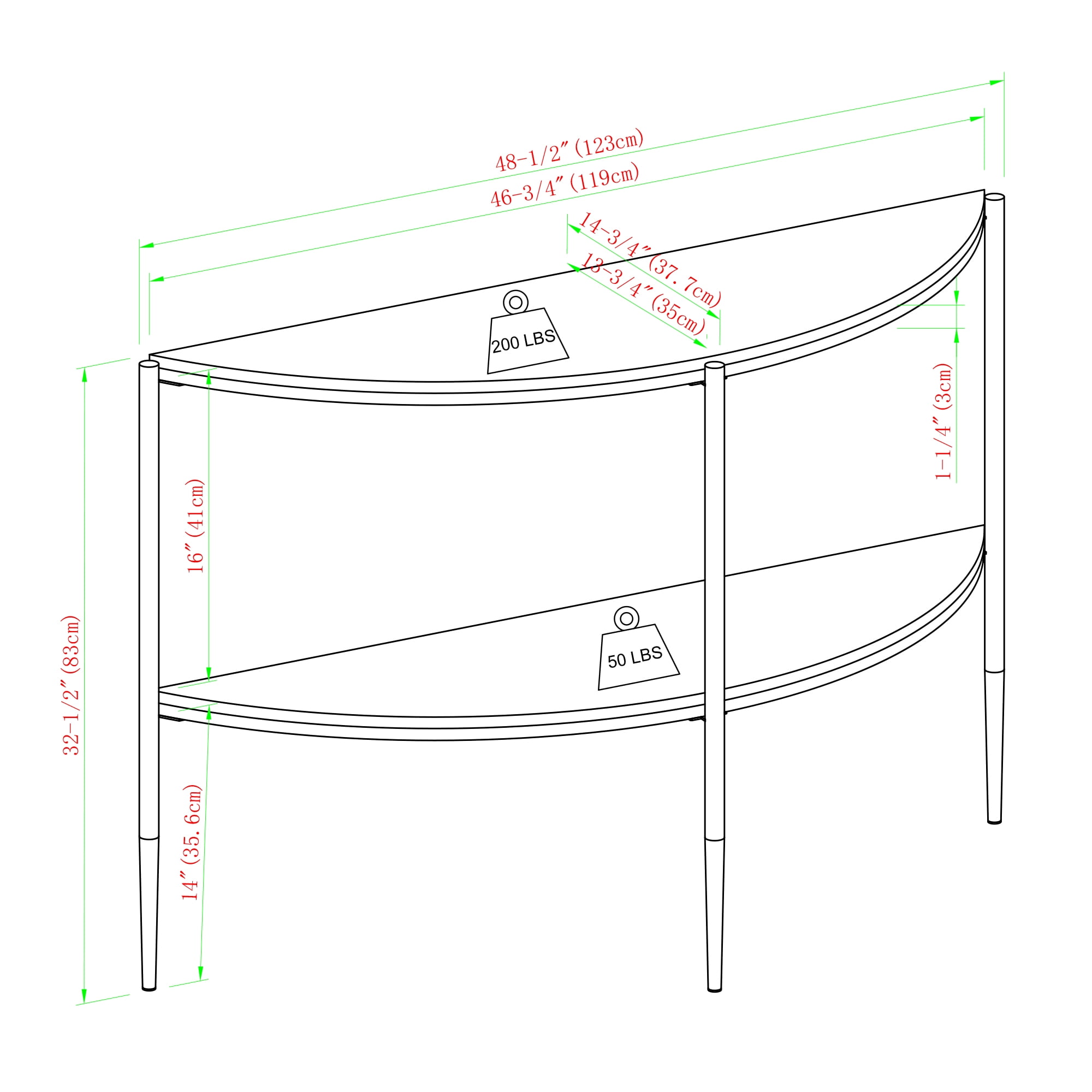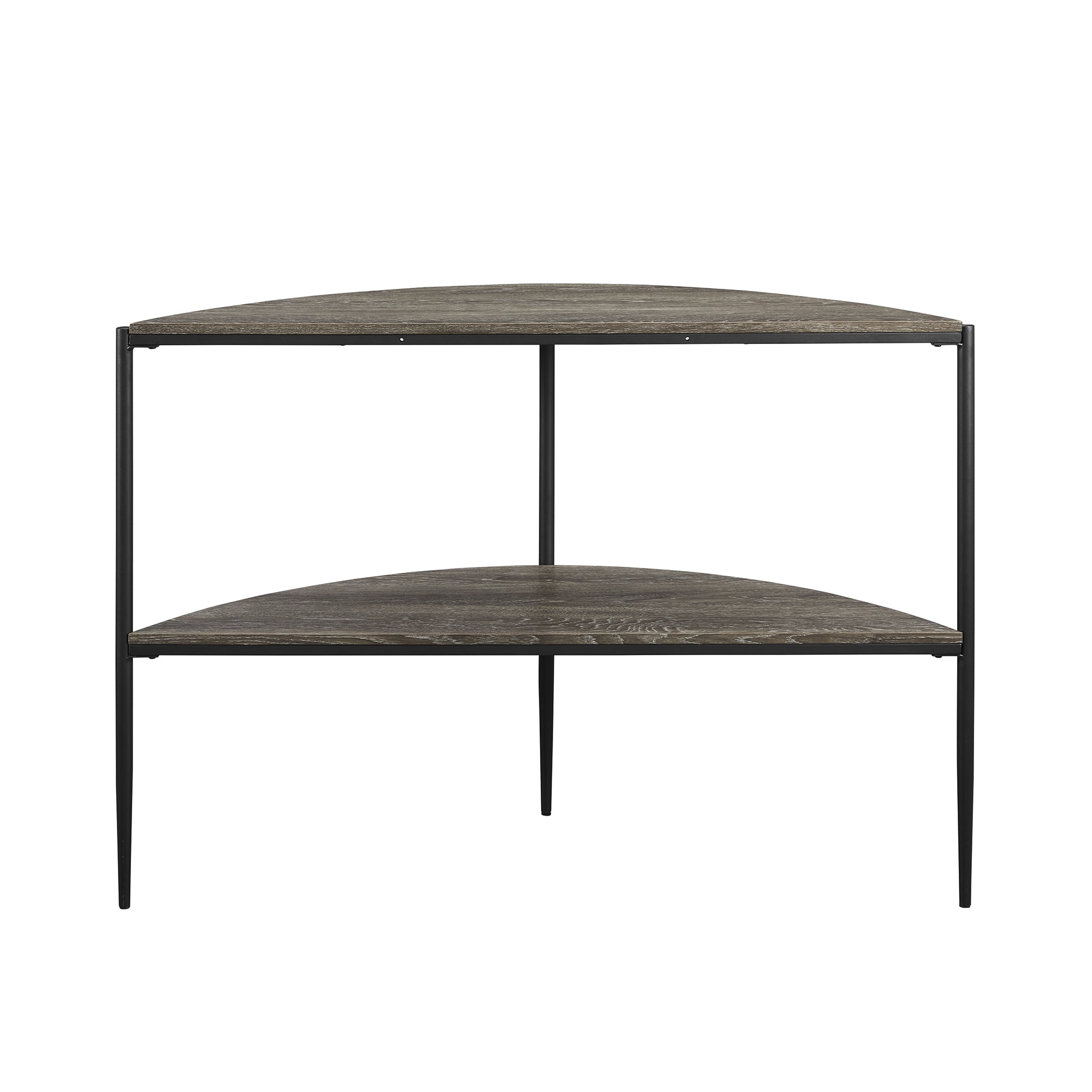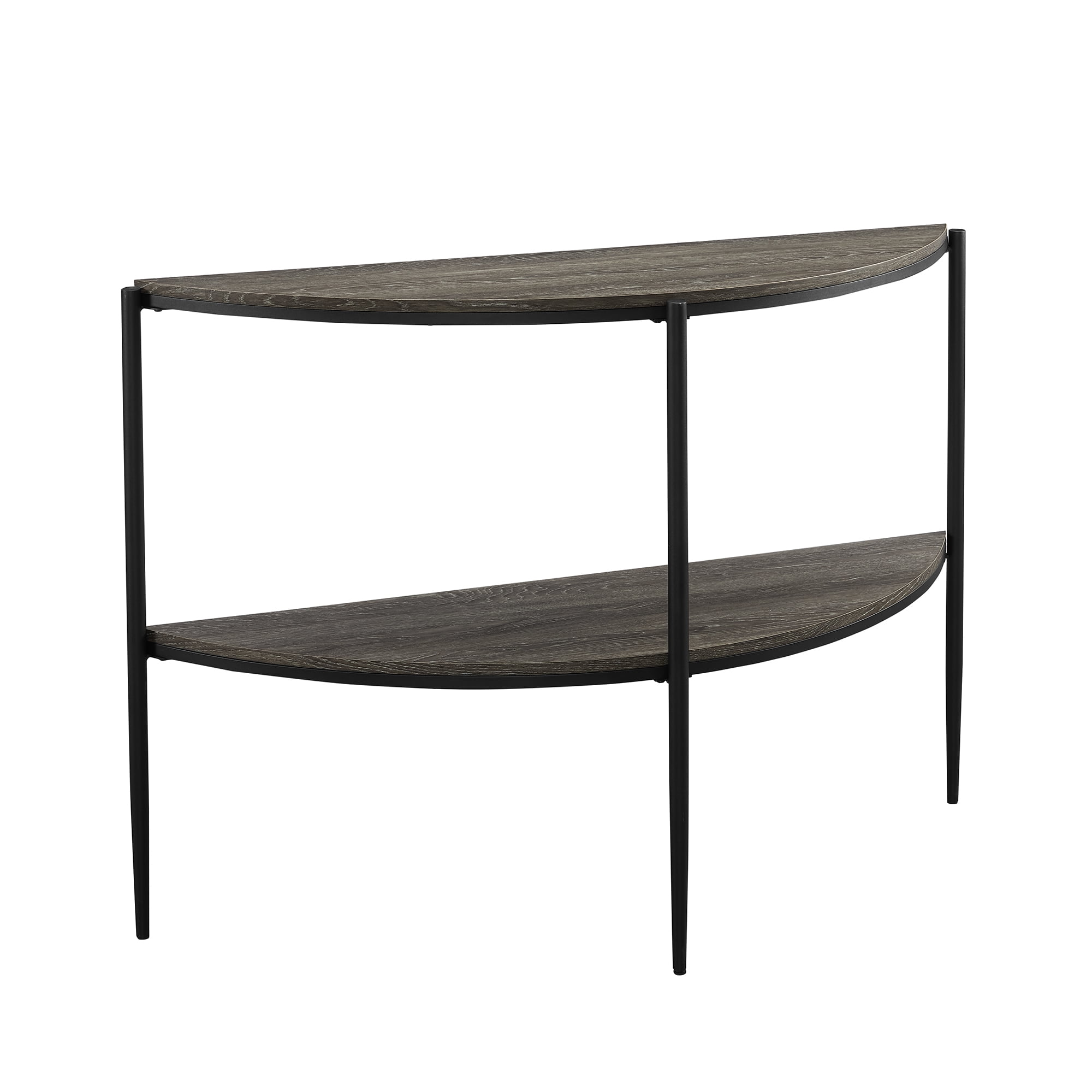 Modern contemporary style Cerused ash finish Lower shelf for extra display space Rounded half-moon shape Attractive tapered legs Use as a sofa table or hallway console Made with powder-coated steel, durable laminate, and warp-resistant MDF Ships ready-to-assemble with step-by-step instructions Assembled Dimensions: 32.5” H x 48.25” L x 15.75” W Packaged Dimensions: 5.25” H x 48.5” L x 16.75” W