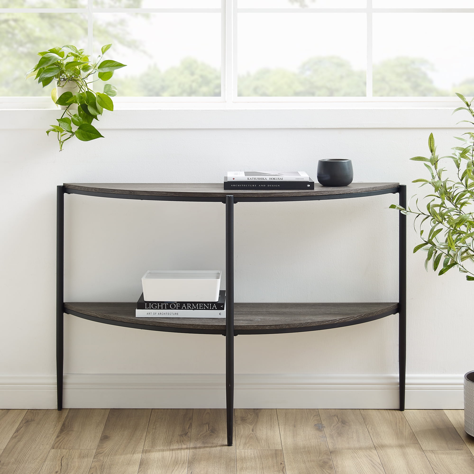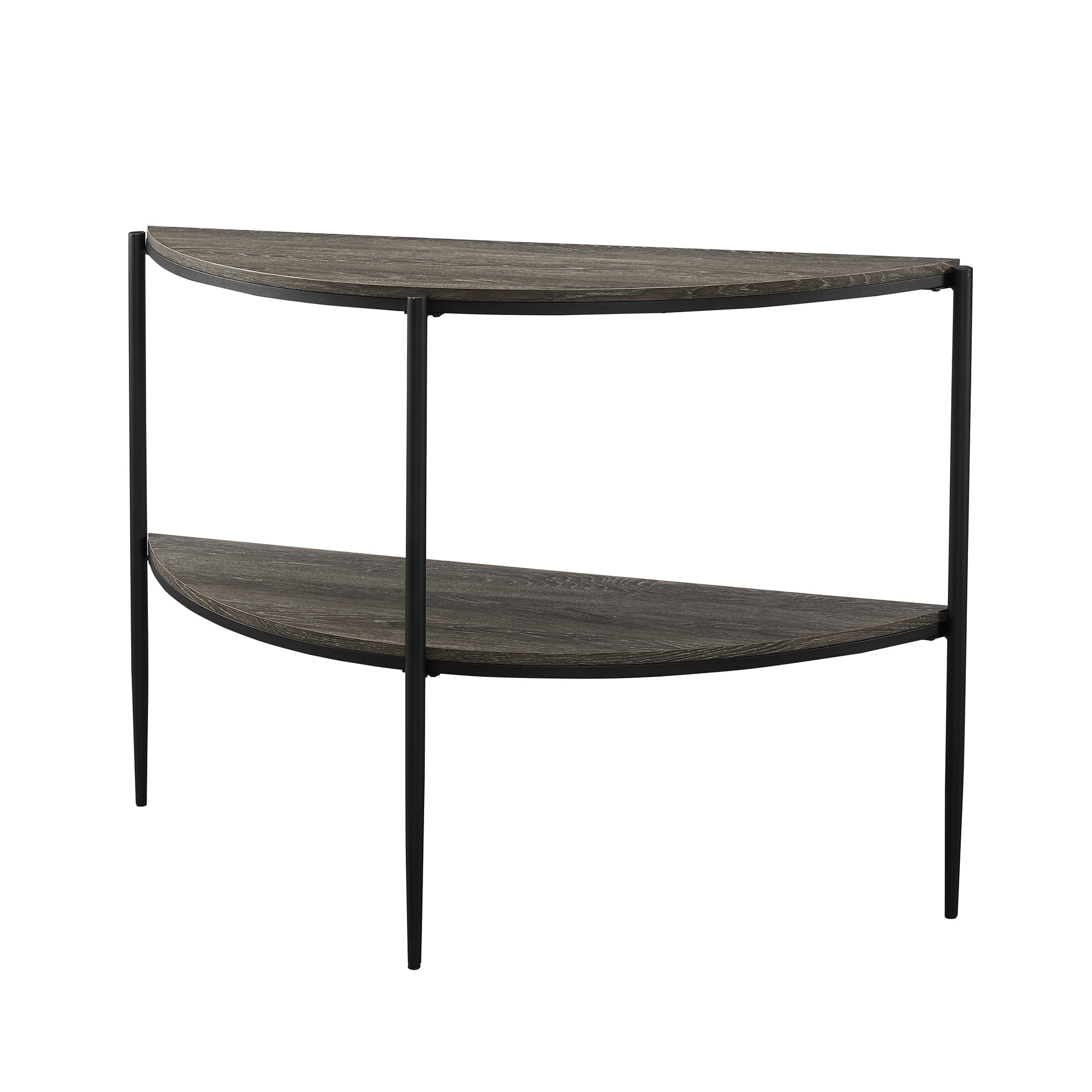 Add a sophisticated touch to your entry space with the Manor Park Modern Rounded Mixed Material Entryway Table. Whether you’re looking for a place to keep your keys or to decorate with seasonal decor, the two tiers of this contemporary sofa table are the perfect match. Attractive tapered legs and the Demilune shape provide a unique, eye-catching centerpiece for the hallway or living room. Add some extra storage space by placing this attractive piece behind the couch. You can trust the warp-resistant MDF wood, powder-coated steel, and durable laminate build to hold your prized possessions.