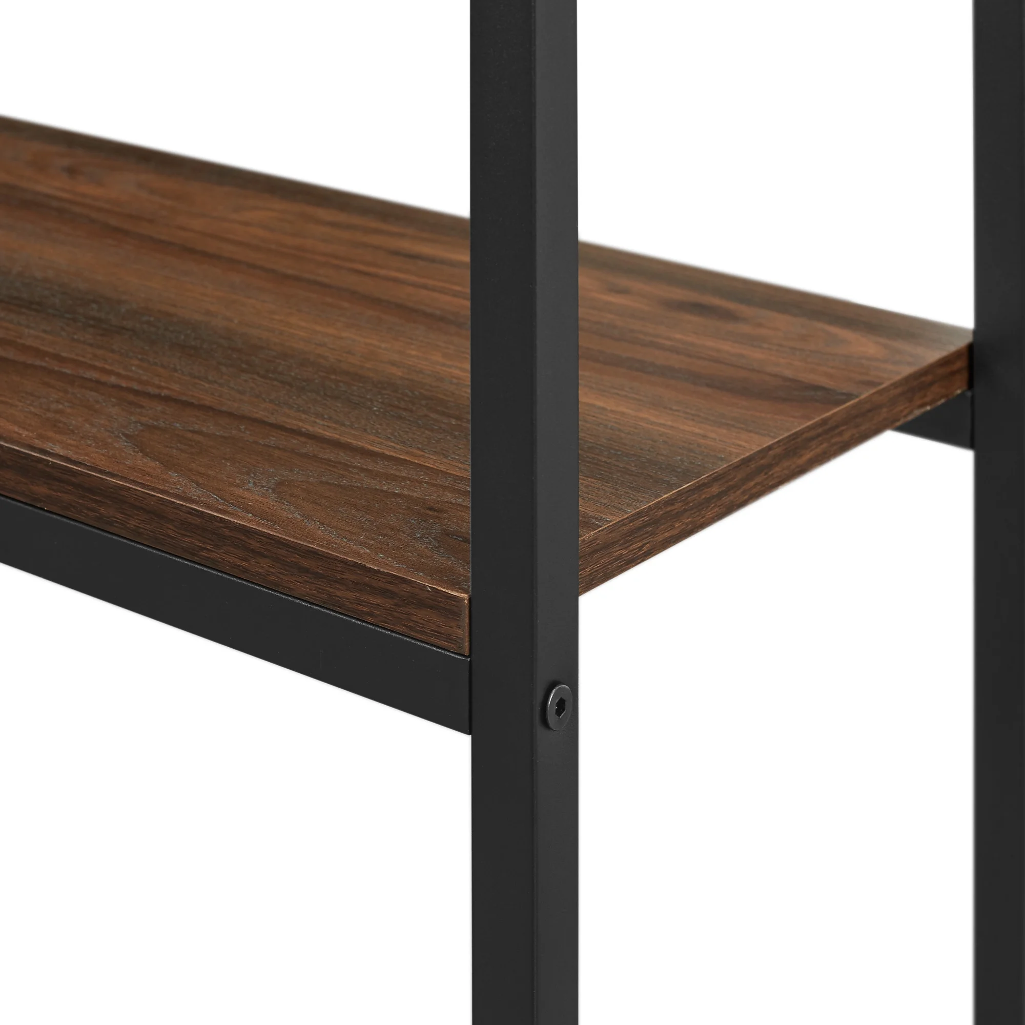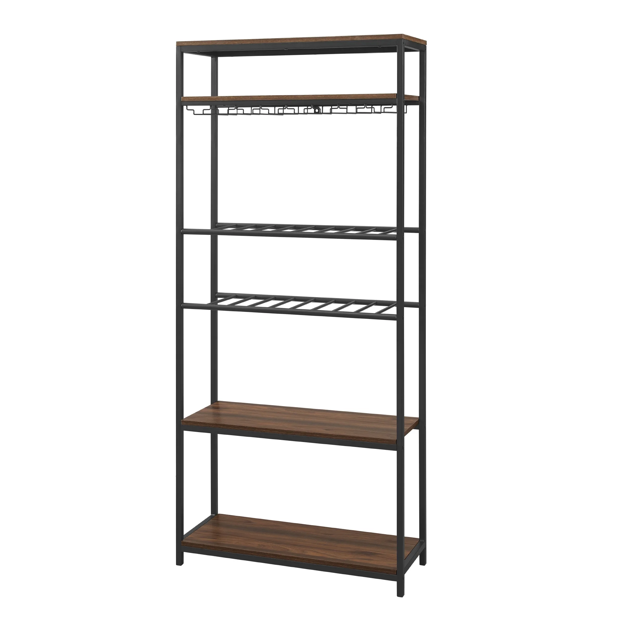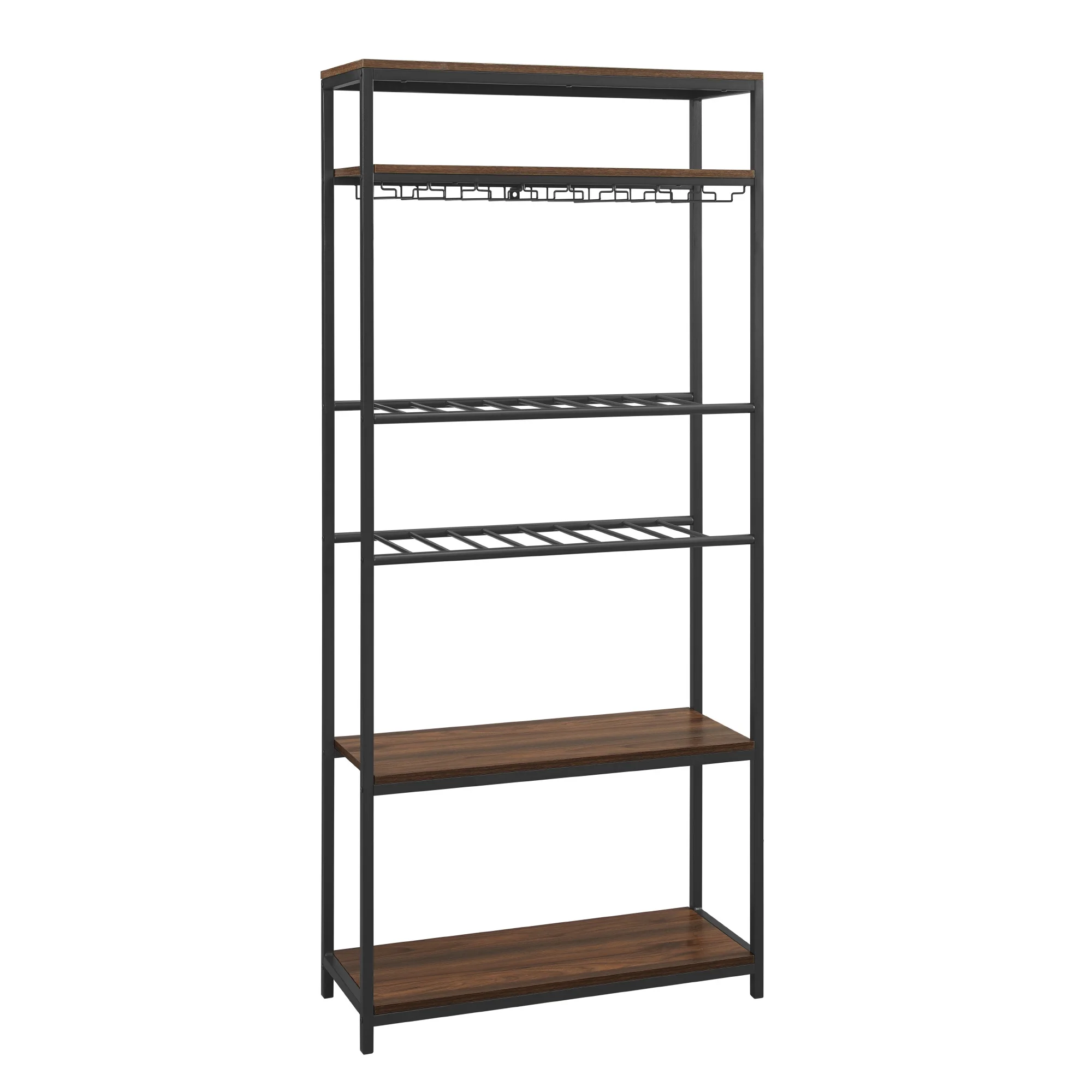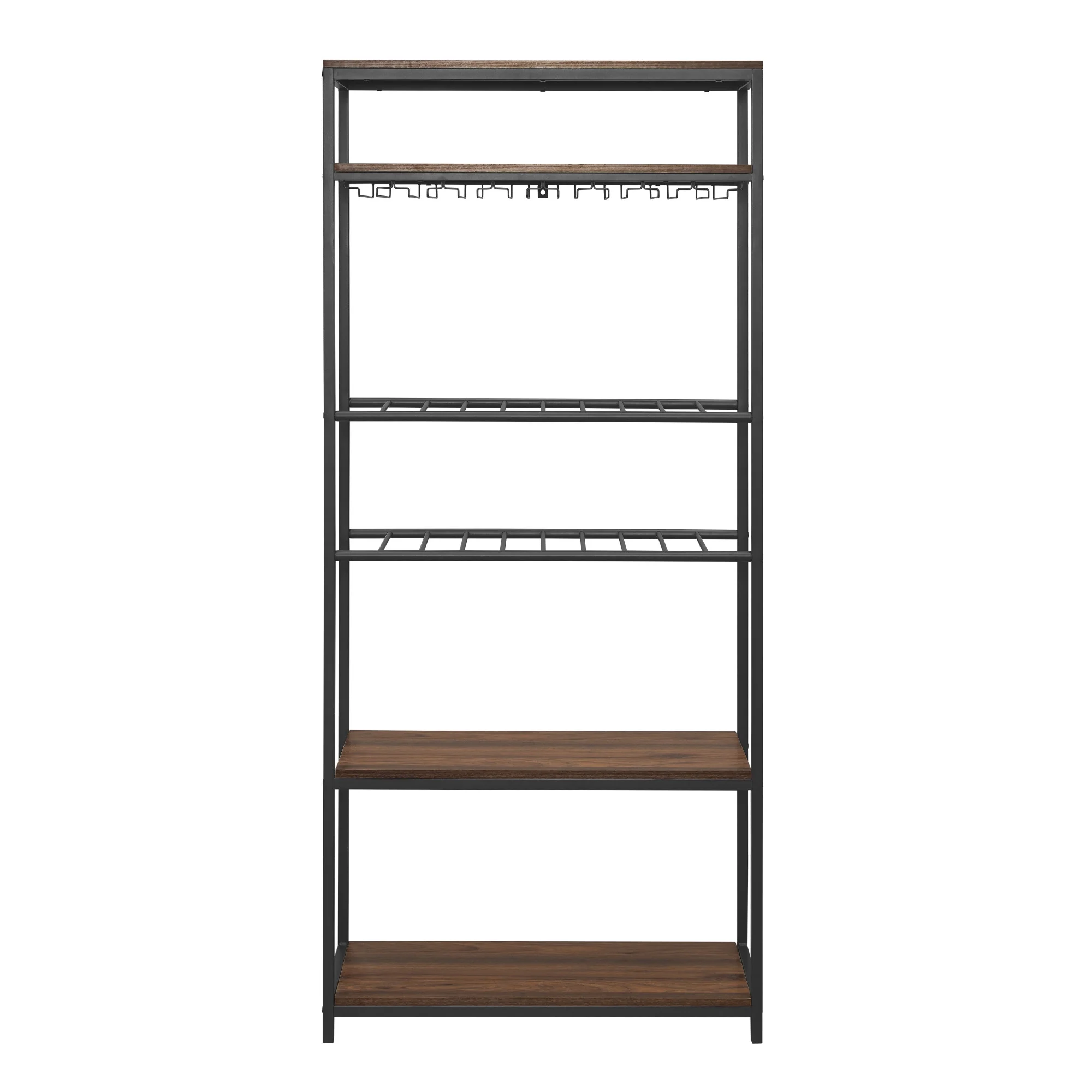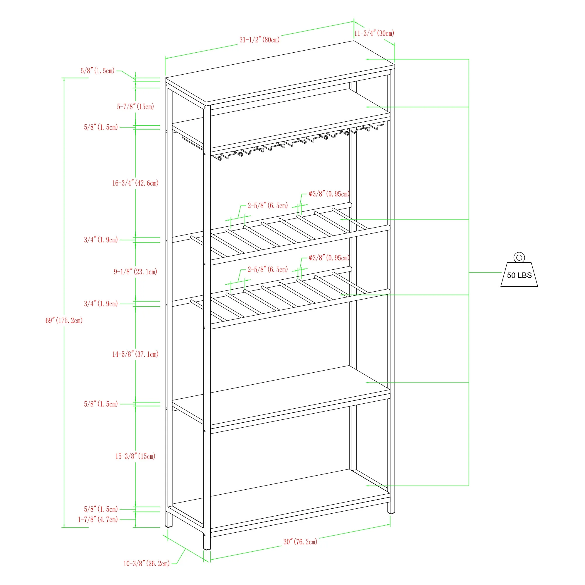 Contemporary, industrial style Cerused ash finish 2 metal shelves hold 16 wine bottles 3 fixed shelves for cocktail accessories 8 stemware racks Small-space friendly Wall anchor included Made warp-resistant MDF wood, durable laminate, and powder-coated steel Ships ready-to-assemble with step-by-step instructions Assembled Dimensions: 69″ H x 31.5″ L x 12″ W Packaged dimensions: 6″ H x 71″ L x 15″ W