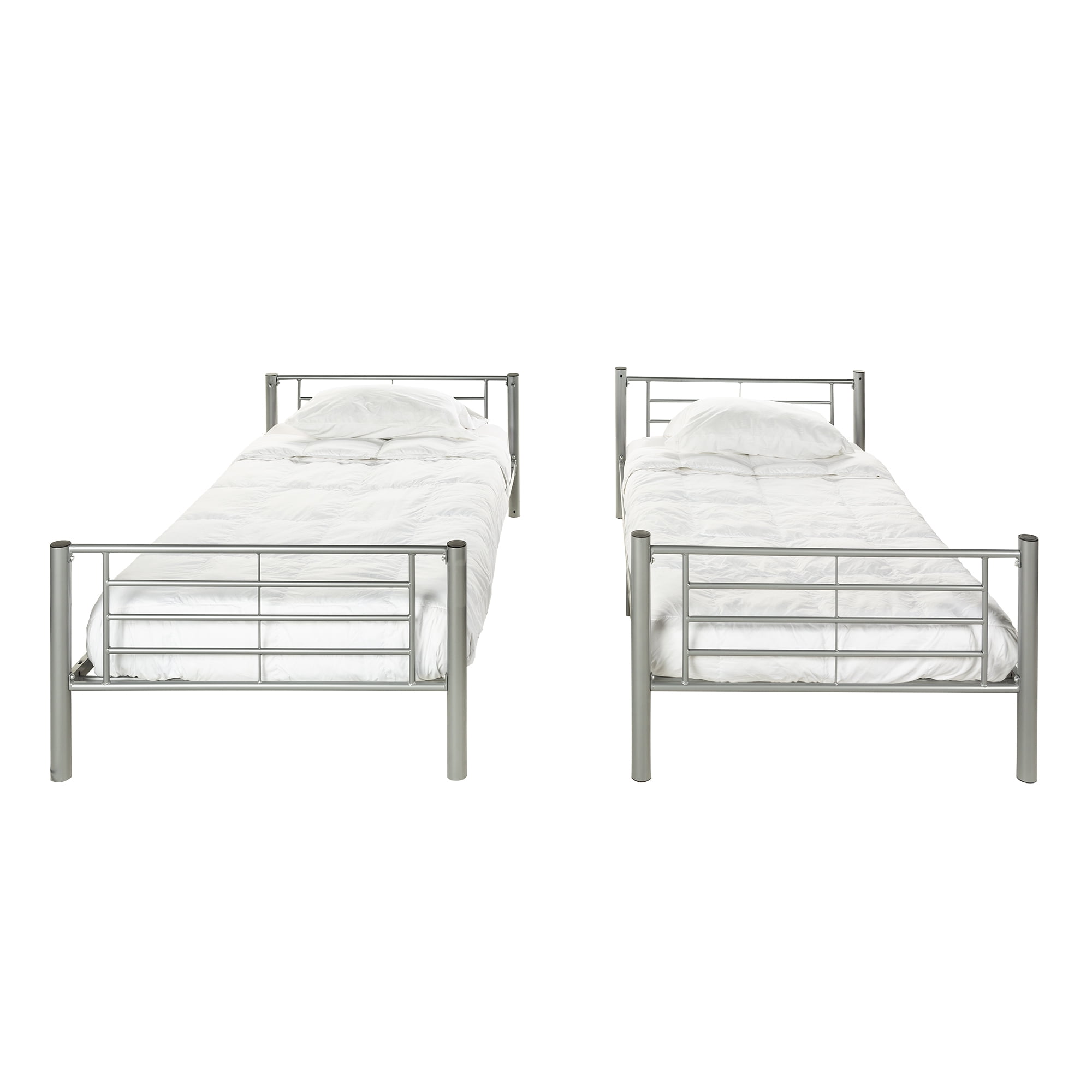 Manor Park Premium Twin Over Twin Silver Metal Bunk Bed, Silver: Made with steel construction with a powder-coated finish Support slats are included, but no box spring is needed The ladder can be attached to either end of the bunk bed Meets the latest consumer product safety standards Does NOT include mattresses or bedding Ships ready-to-assemble with step-by-step instructions