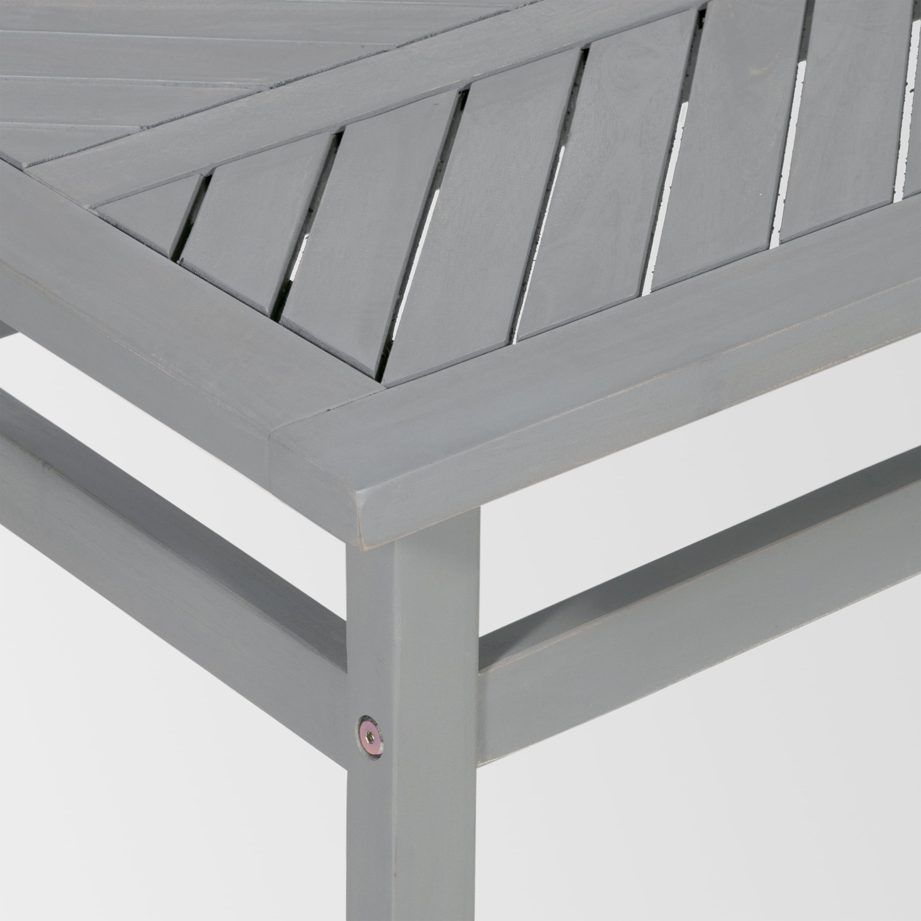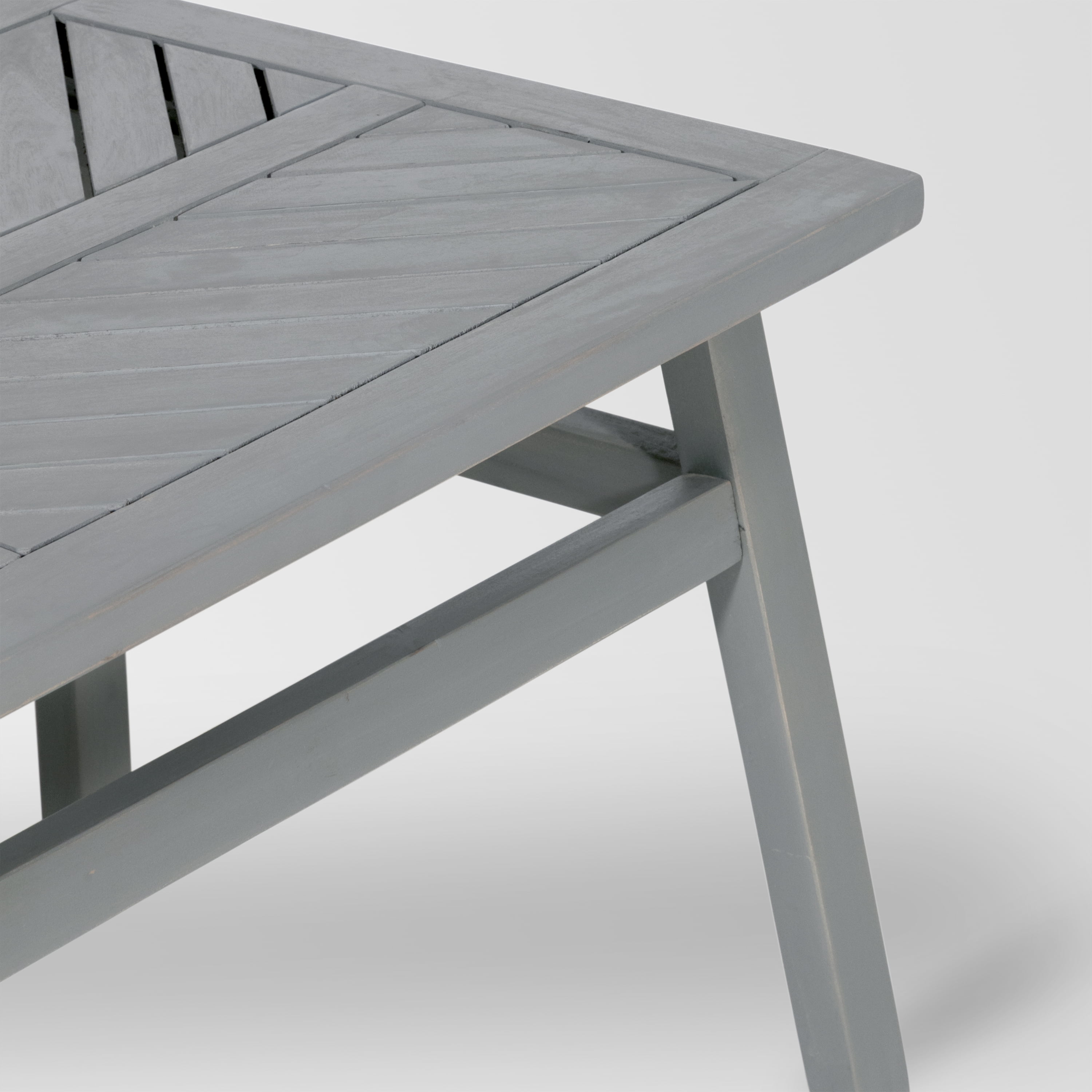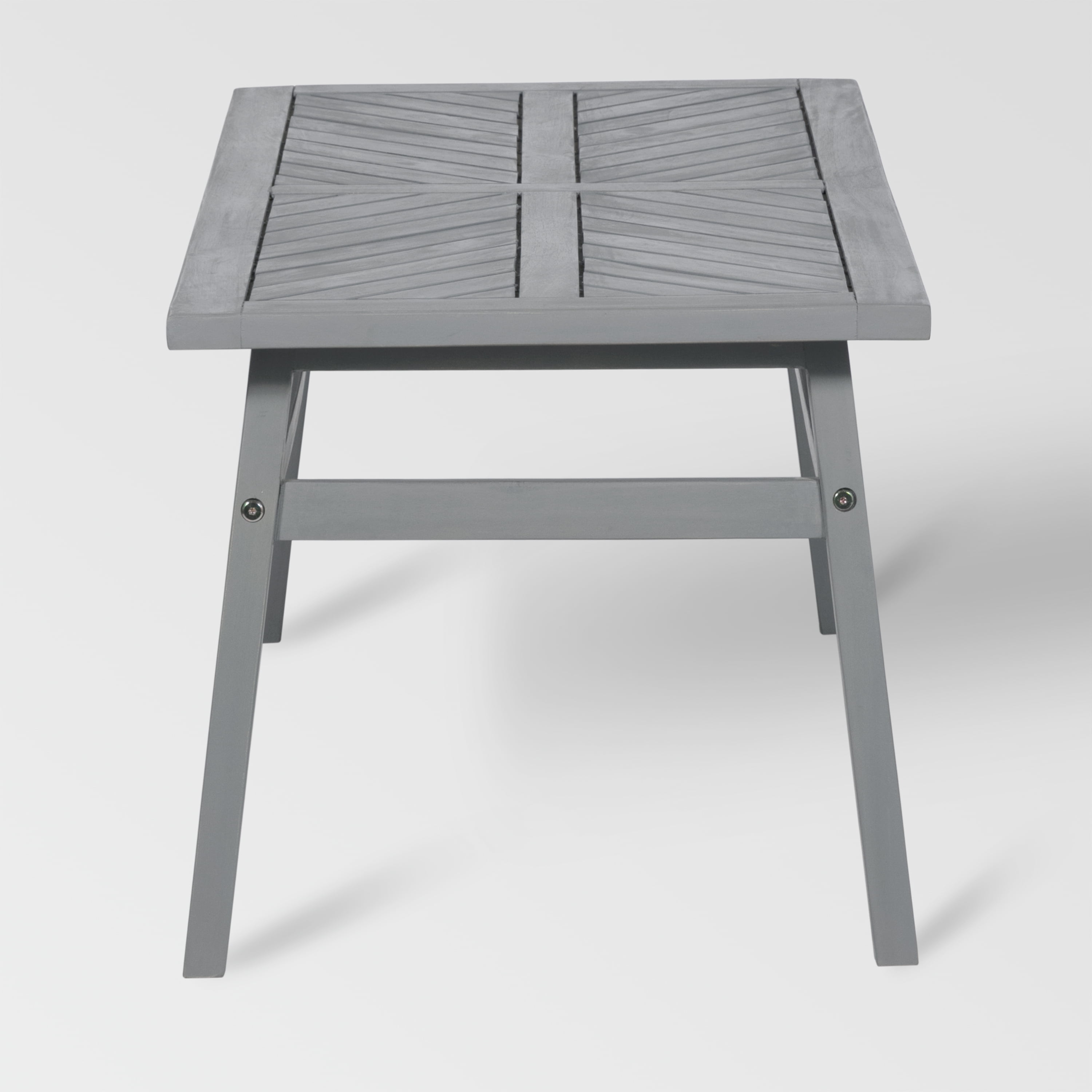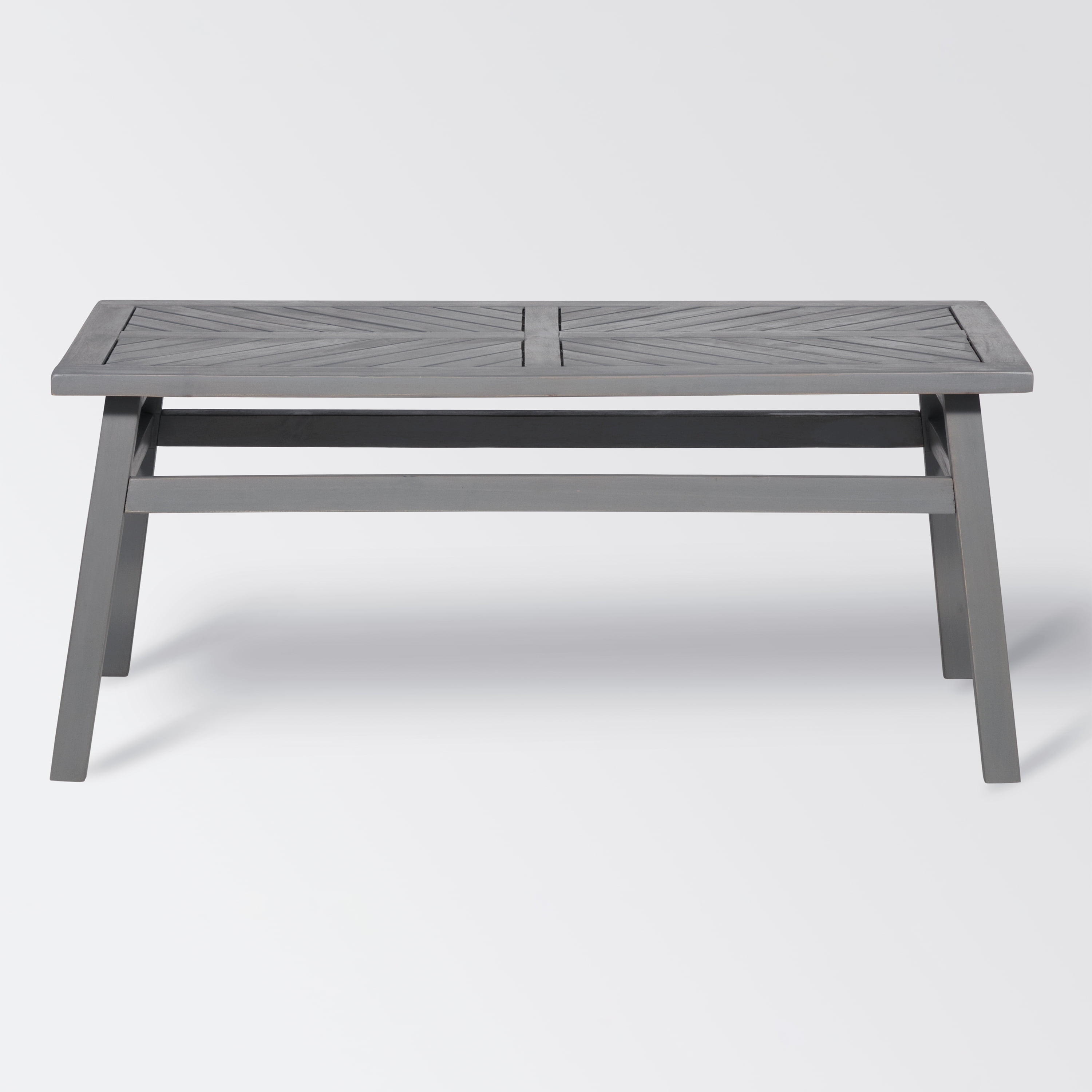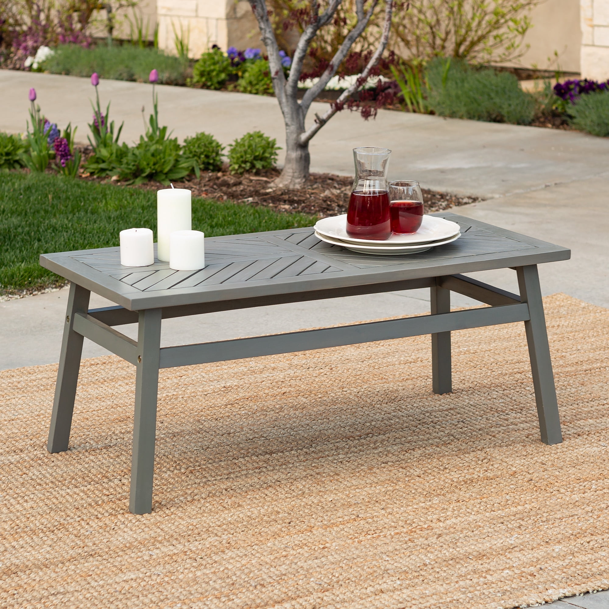 Made of solid acacia wood, this patio coffee table is perfect for any outdoor space, whether in your backyard or on your deck, patio, or porch. Featuring a chevron patterned table top and a painted grey finish for a modern and transitional style. Pair next to your outdoor chairs or loveseat to enjoy coffee, tea, or hot cocoa with a friend on the weekends. You’ll love the simple aesthetic this coffee table will add to your outdoor living space.