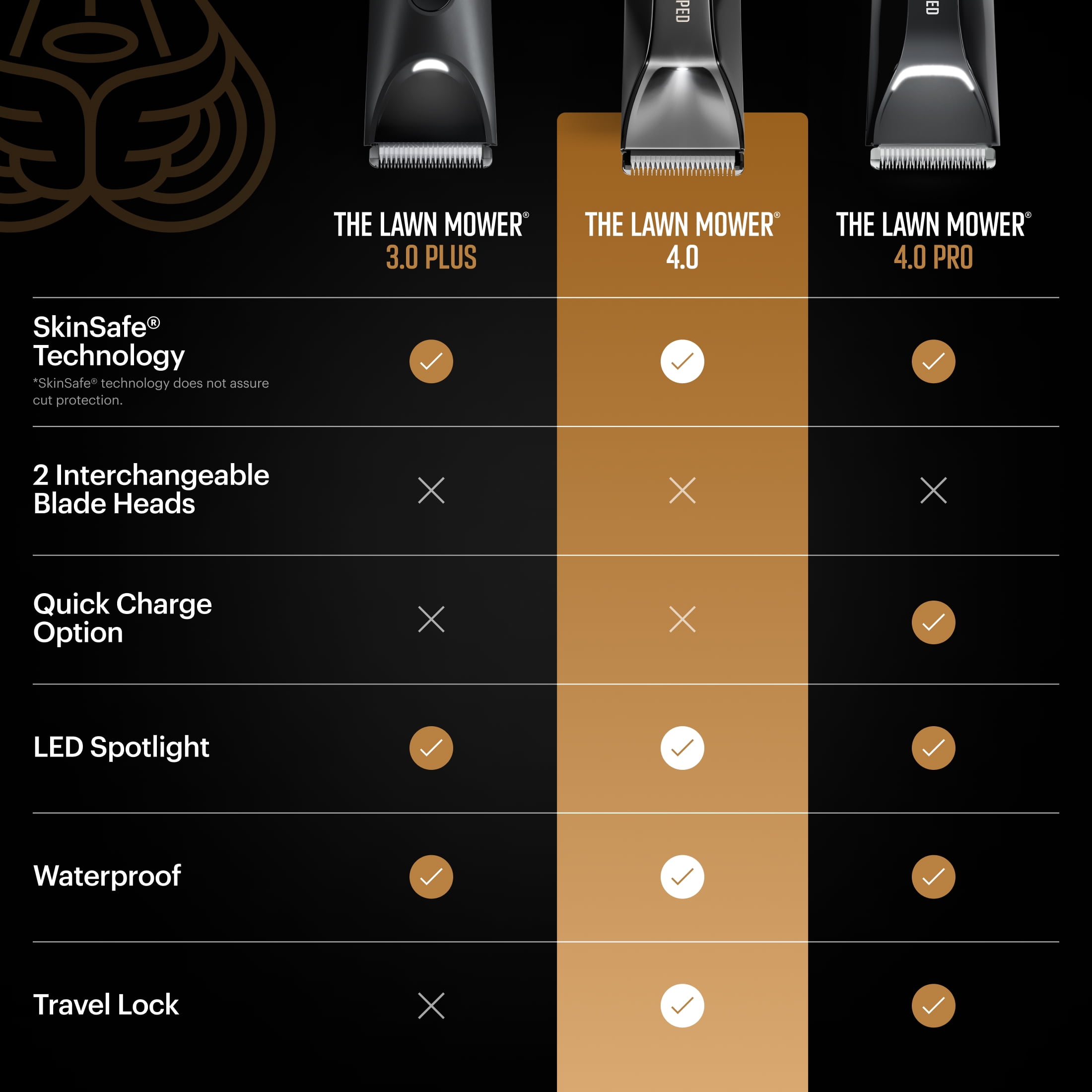 The new Lawn Mower® 4.0 features powerful upgrades and keeps some of the most popular features of its predecessor. 7,000 RPM motor with QuietStroke™ technology for low vibration and rechargeable 600mA li-ion battery. Wireless charging system. *SkinSafe® Technology. Waterproof** for convenient use in the shower. 4000k LED spotlight with diffuser. Easily cleaned under running water. As part of a comprehensive male grooming product lineup, this groin and body trimmer provides the best and closest trim for your entire body, including chest hair, back hair, and pubic hair. This product includes an additional SkinSafe® Replacement Blade. *SkinSafe® technology does not guarantee cut protection. **IPX7 rated to protect against immersion in up to one meter of fresh water for up to 30 minutes.