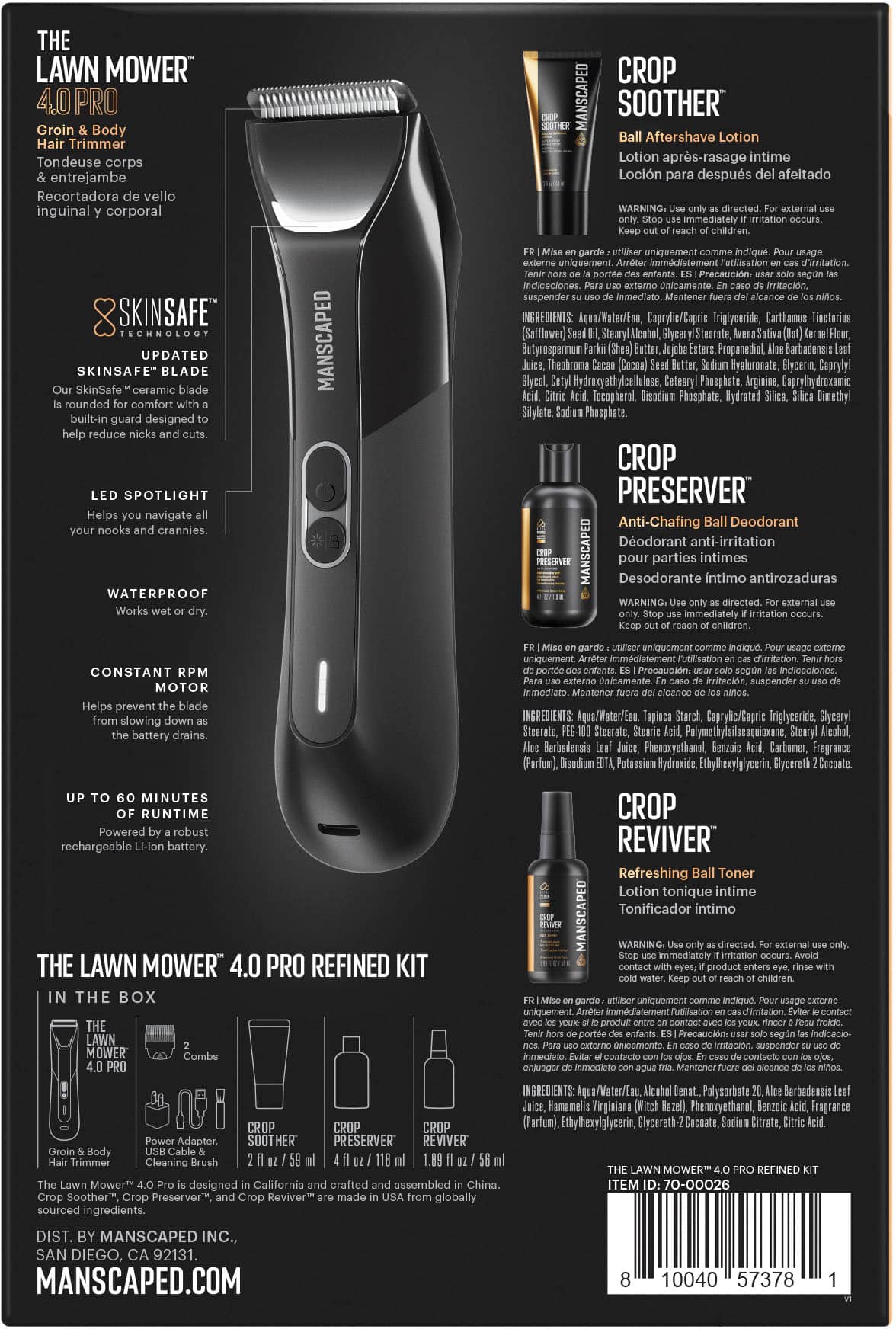 - Product Name: The Lawn Mower 4.0 Pro Refined Package SkinSafe Rechargeable Wet/Dry Groin and Body Hair Trimmer, Grooming Gift Set