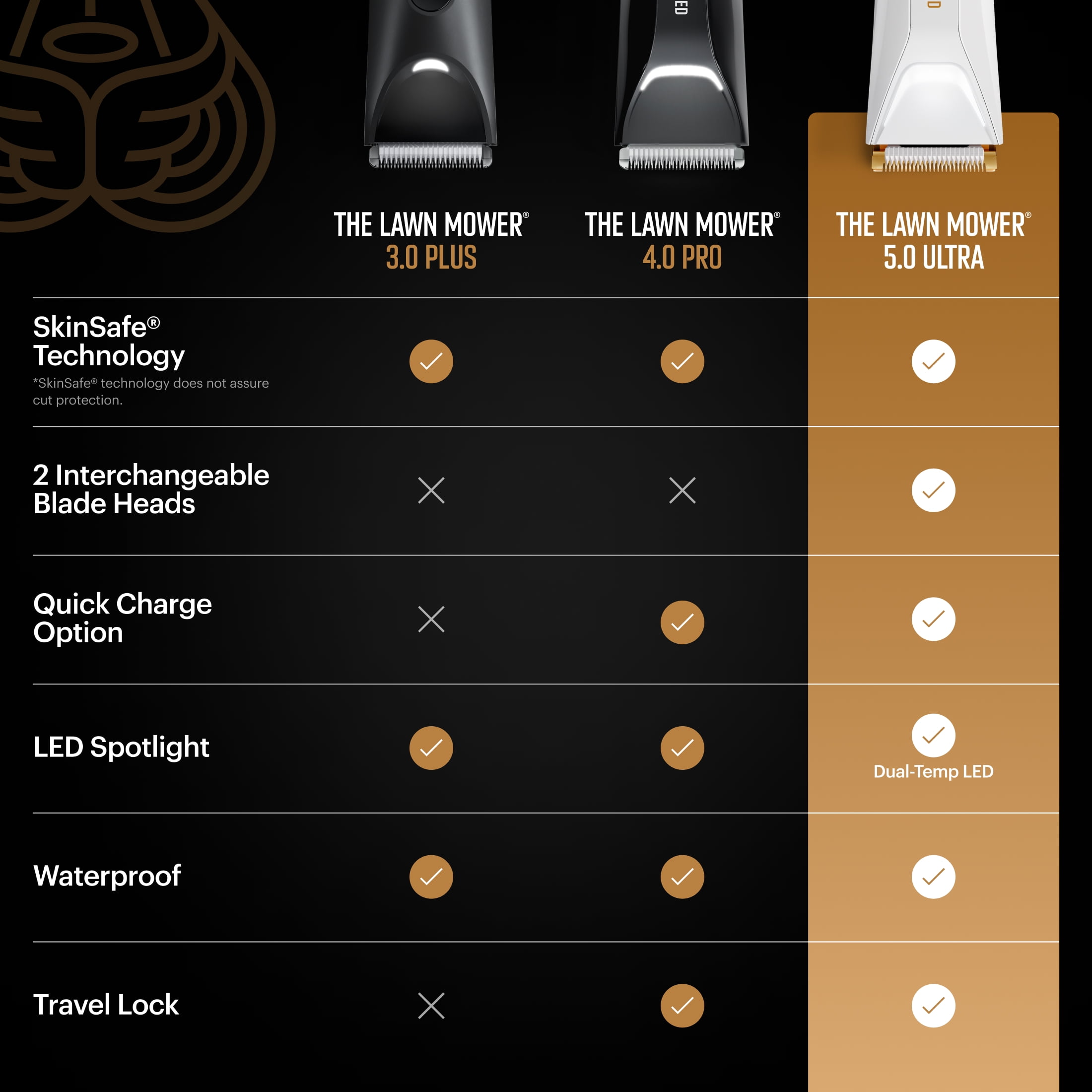 Interchangeable Dual-Blade System Three Length-Setting Combs: 1.4–12 mm Waterproof for Wet or Dry Use Dual-Temperature LED Spotlight USB-C and Wireless Charging Options Tri-Level Battery Indicator Up to 60-Minute Runtime Li-ion Battery Constant Motor