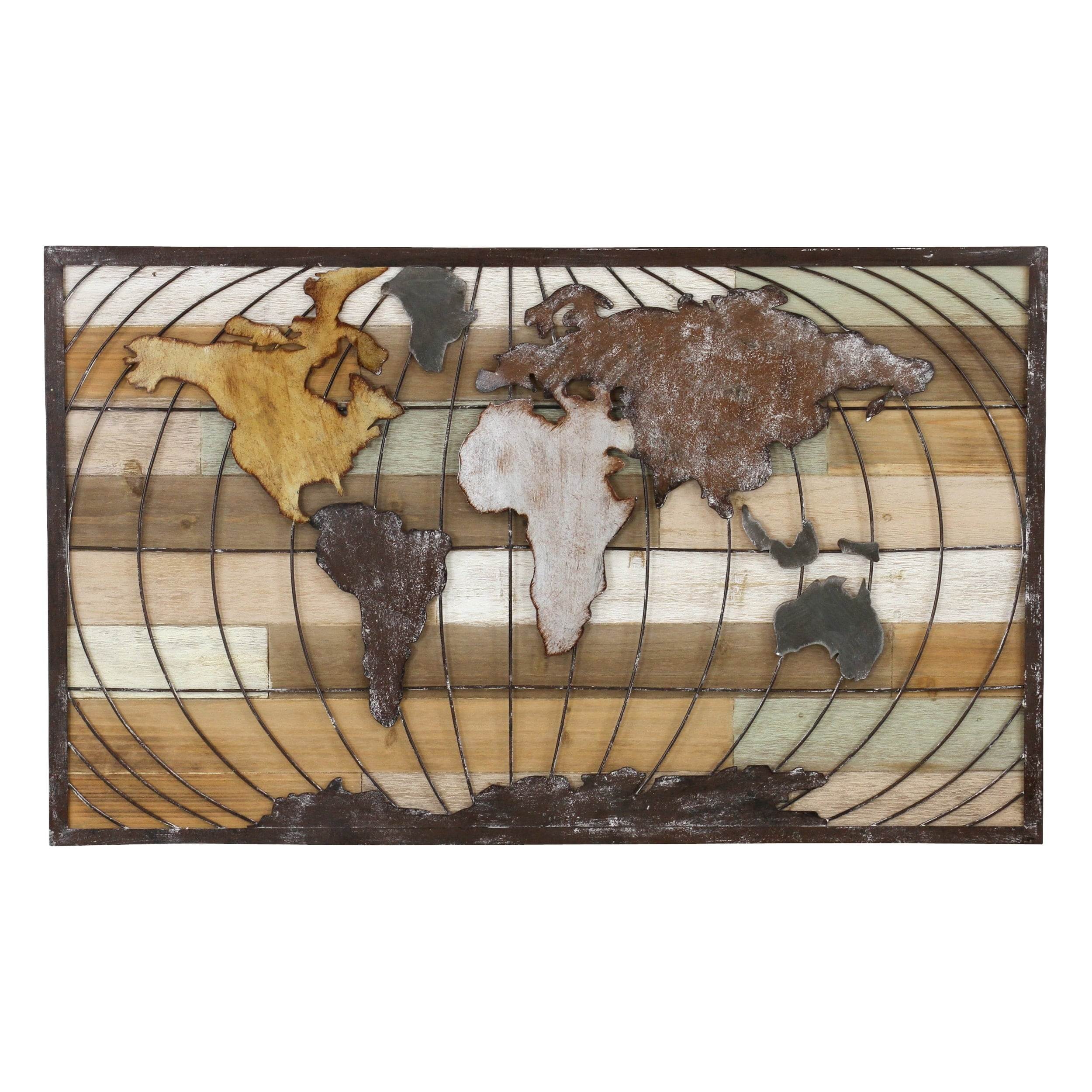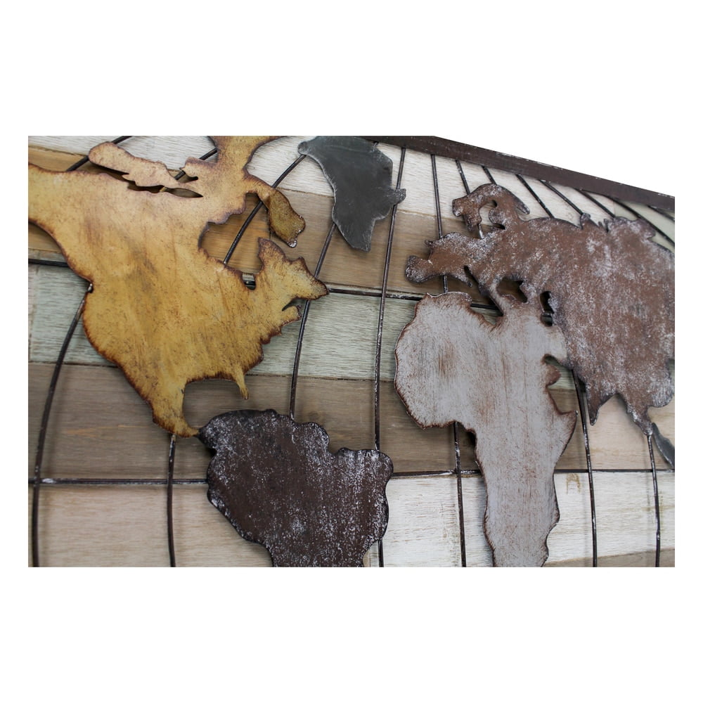 Combining rustic iron and wood finishes, the Marco world map wall decor is a truly attractive home accent. Inset behind the distressed iron map are color washed wood slats that contribute to the industrial feel of this piece.