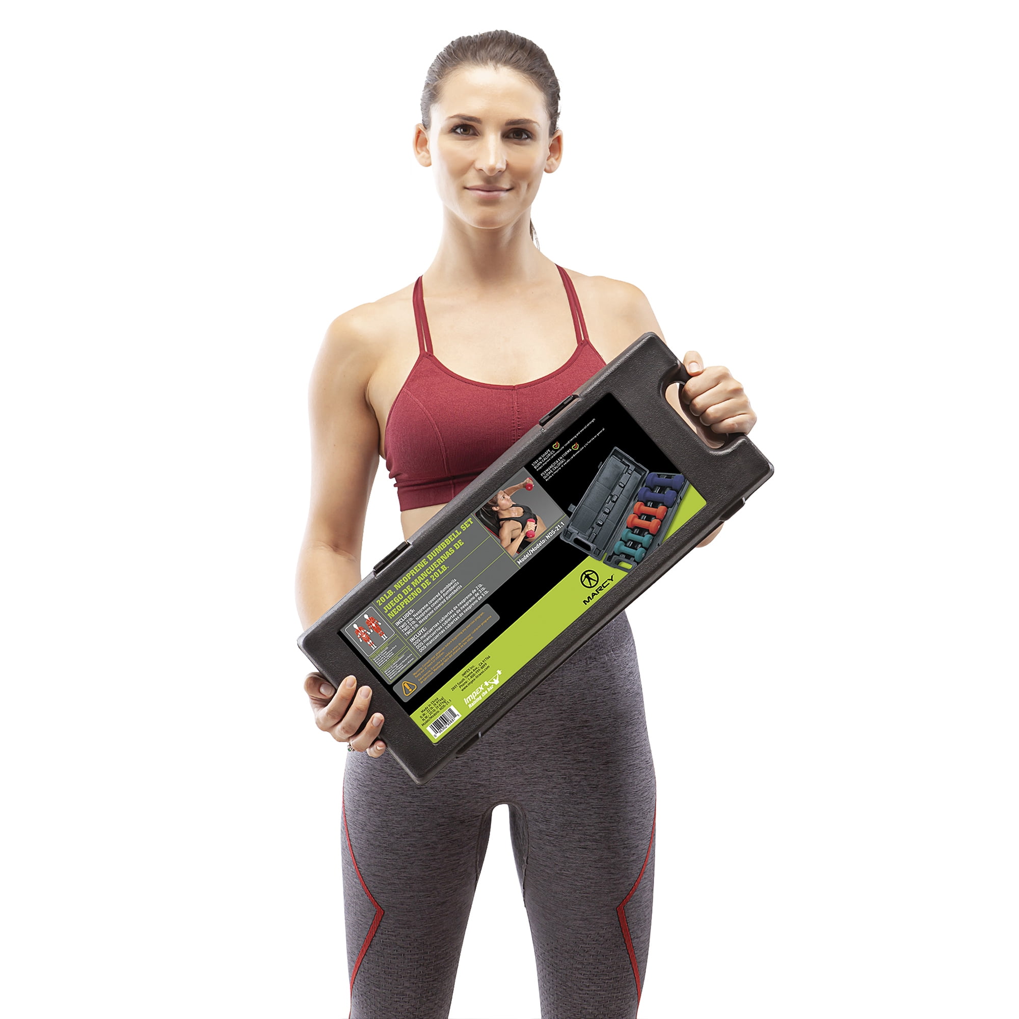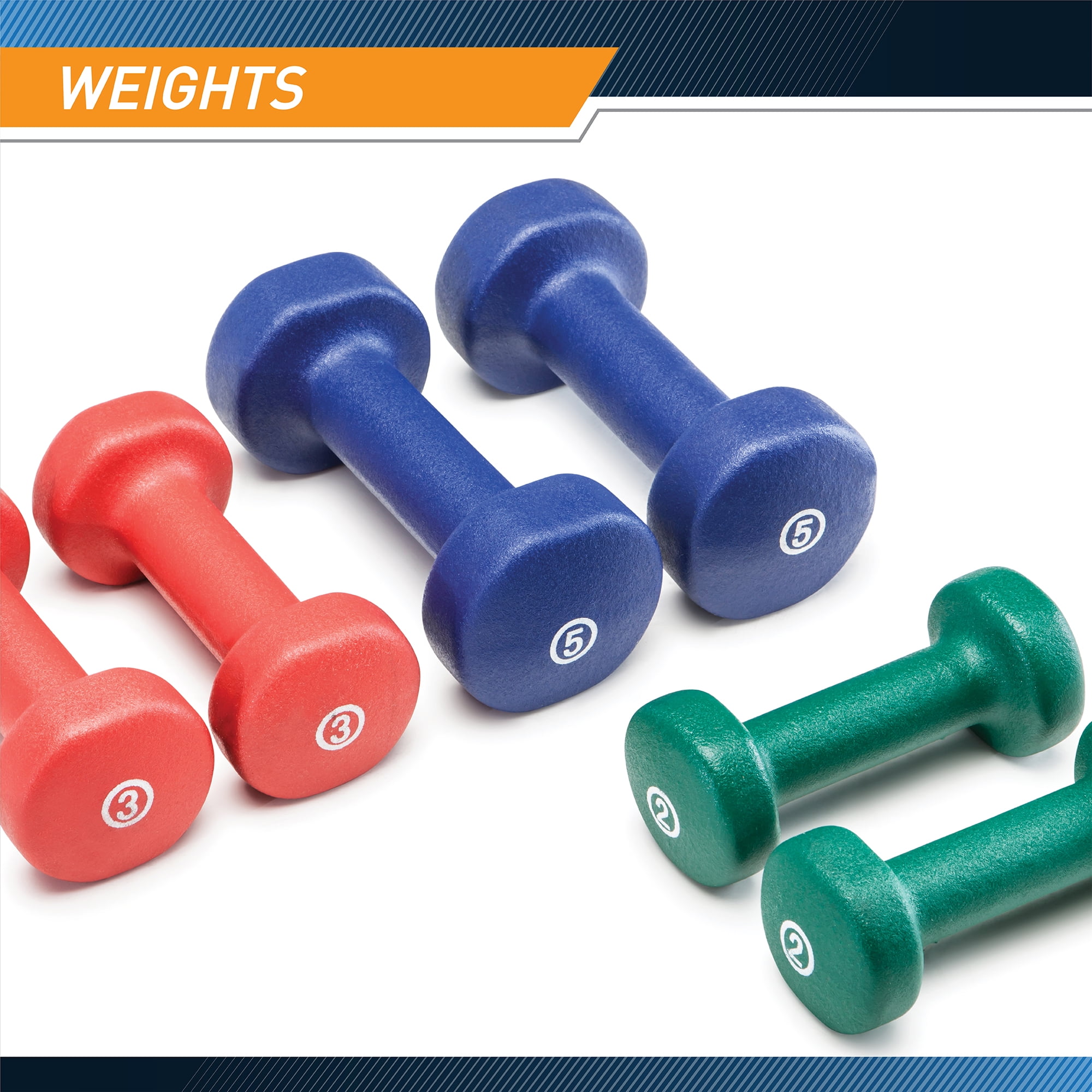 Enhance your arm strength, control, and power by flexing and lifting your way to stronger upper body with the Neoprene Dumbbell Set with Carrying Case from Marcy! Built to be your new workout companion, this weight set allows you to train your way to a more sculpted physique without having to leave the comforts of home.Whether your focus is on strength-training or toning, this 20-Pound Weight Set is for you! Perfect for both fitness beginners and gym rats, this fitness gear includes a pair of 2-pound dumbbells, a pair of 3-pound dumbbells, and a pair of 5-pound dumbbells, letting you tailor your workout according to your skill level. Target different muscle groups and develop a more muscular body with this weight set. Constructed from soft yet heavy-duty neoprene, this dumbbell set boasts superior durability and a non-slip surface. The differently sized dumbbells showcase ergonomic handles that facilitate precise contact of your hands with the bar for enhanced grip and improved handling of the equipment during workouts and training. You don’t have to worry about drenching the bar in sweat and making it difficult to hold thanks to the handle slip-resistant construction. Use this reliable equipment for your circuit training or as an accessory to your weight bench or cardio equipment for intense workouts that will get you in your fittest shape. With this fitness tool, working out anywhere at home will be easy. Also, cleanup and storage will be a breeze, thanks to the compact plastic carrying case that & is included to keep your equipment organized. The set includes one pair of 2-pound, one pair of 3-pound, and one pair of 5-pound weights, all stored in a compact plastic carrying case.