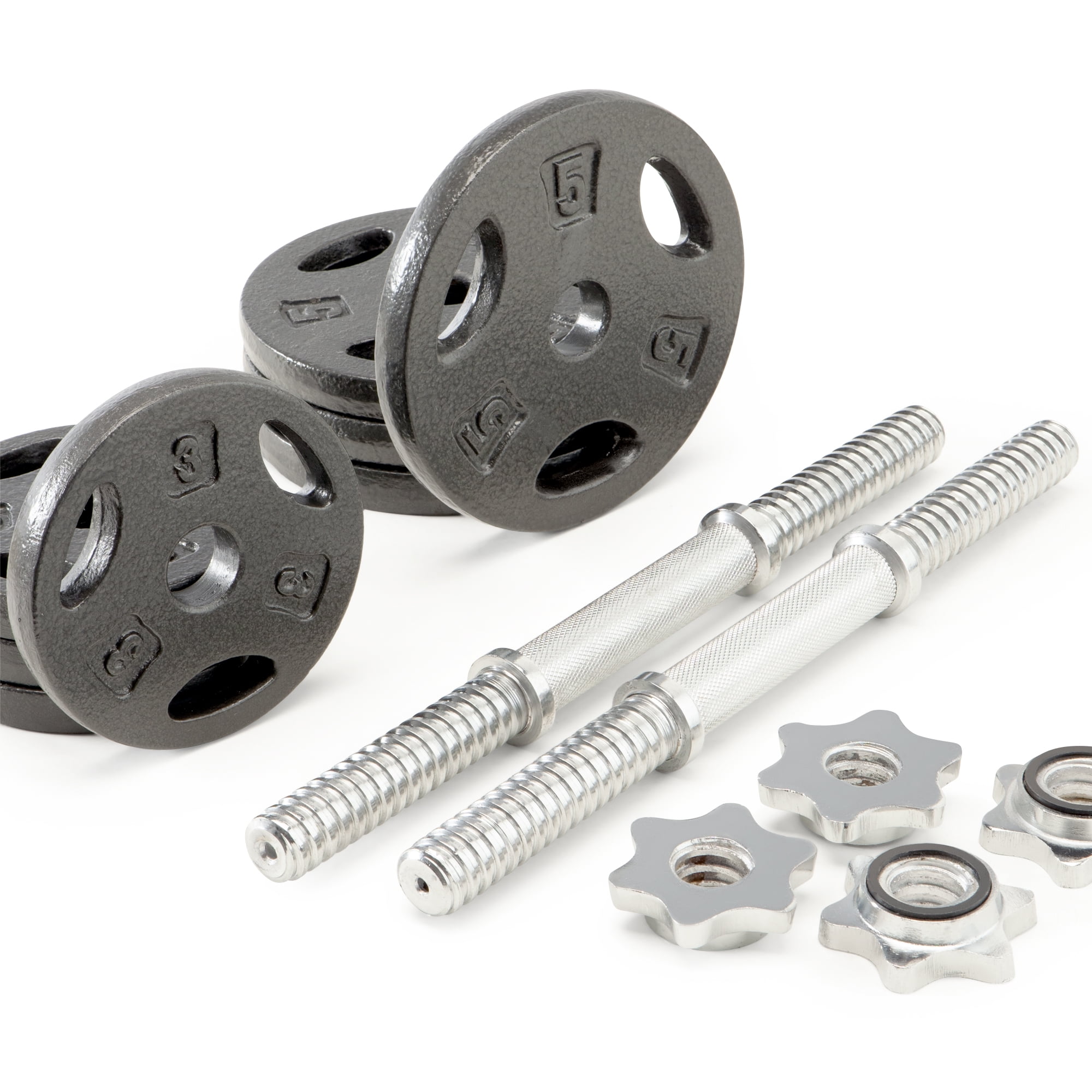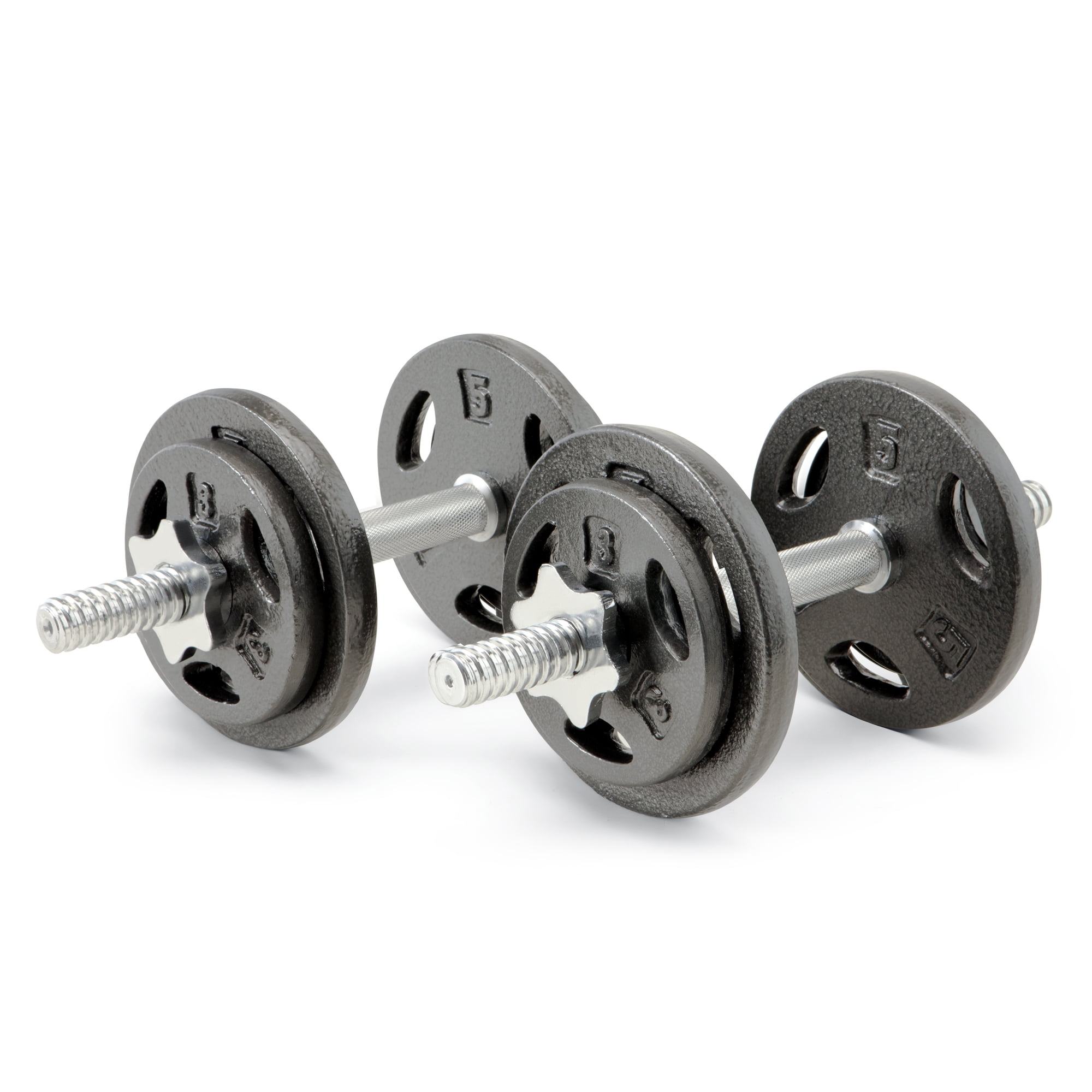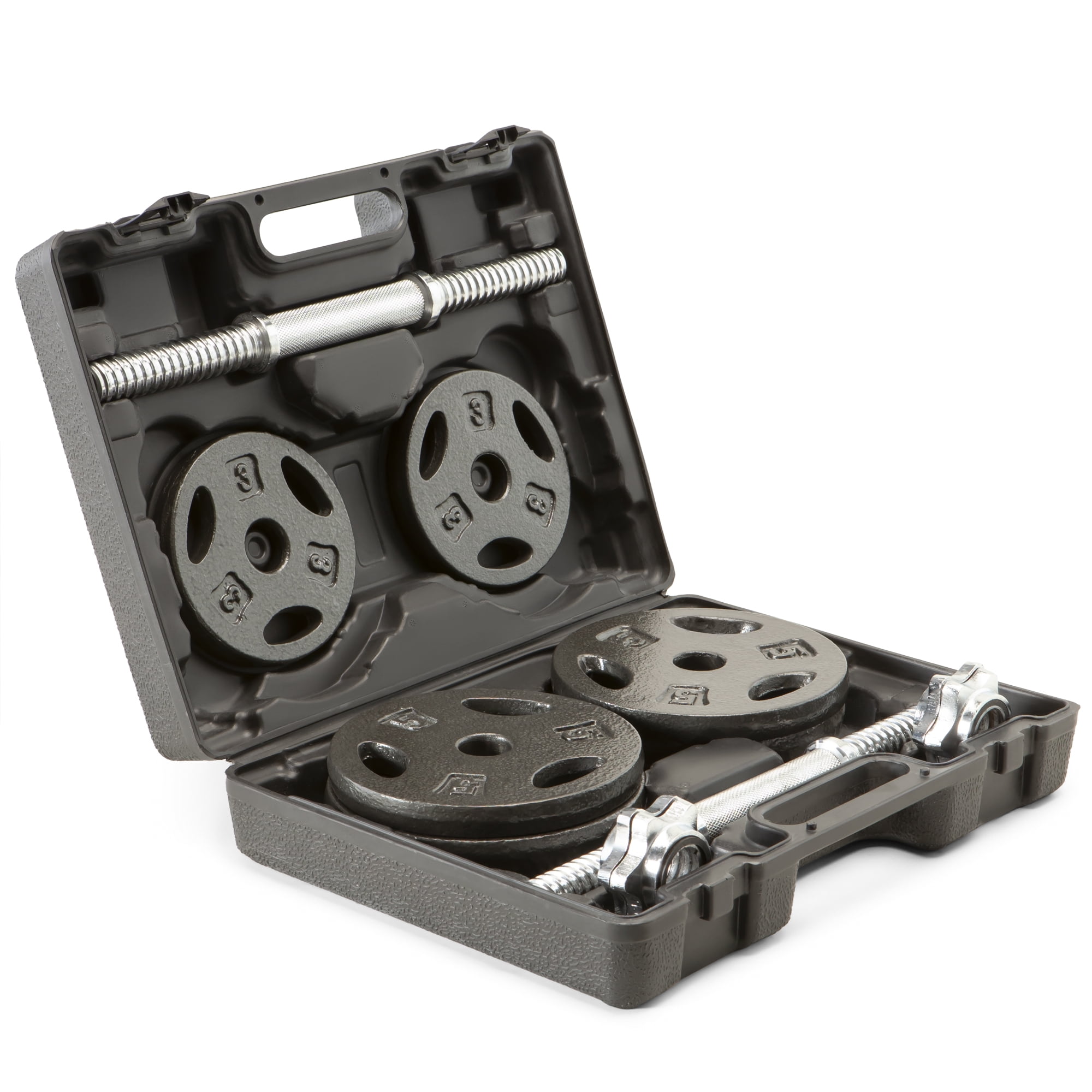 Adjustable, rust-resistant dumbbell set Made with eco-friendly iron Plastic, contoured hand grips Bars and collars weigh 8 pounds Includes: four 5-pound plates, four 3-pound plates, two threaded handles, four spin-lock collars, and carrying case Perfect for arm exercises such as dumbbells rows, dumbbell curls, incline dumbbell presses, dumbbell pullover, dumbbell deadlifts, dumbbell fly’s, dumbbell bench press, and lateral dumbbell raises. Material: Cast iron Dimensions: 18 x 4.5 x 13.5 inches