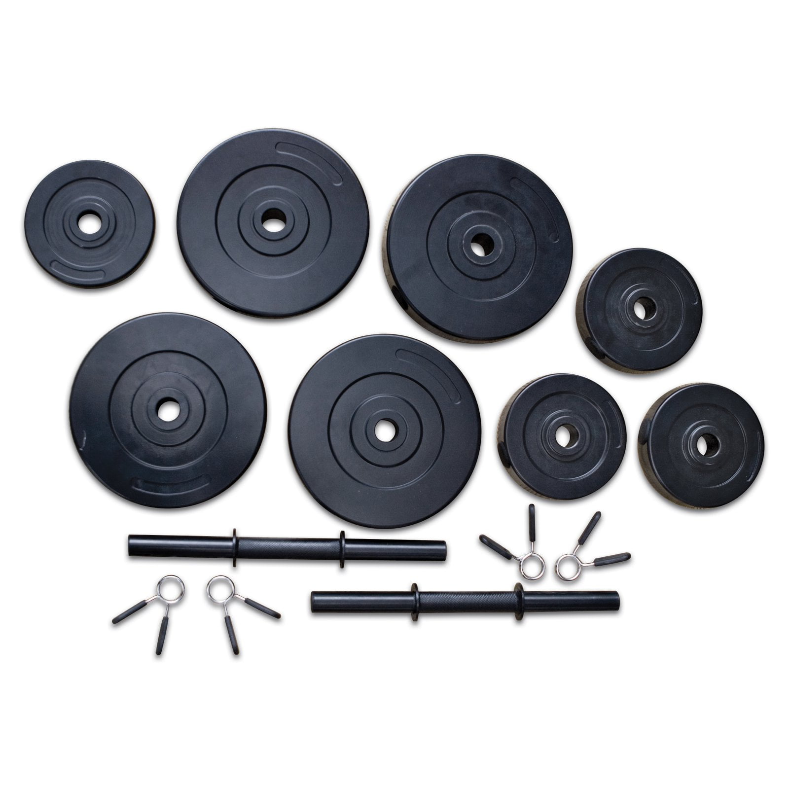 Compact design Adjustable weights with spring clip collars Standard size vinyl coated weight plates Durable non-rust weight plates Includes: (2) 14″ handles, (4) 7.5lb standard plates, (4) 2.5lb standard plates, (4) spring clip collars