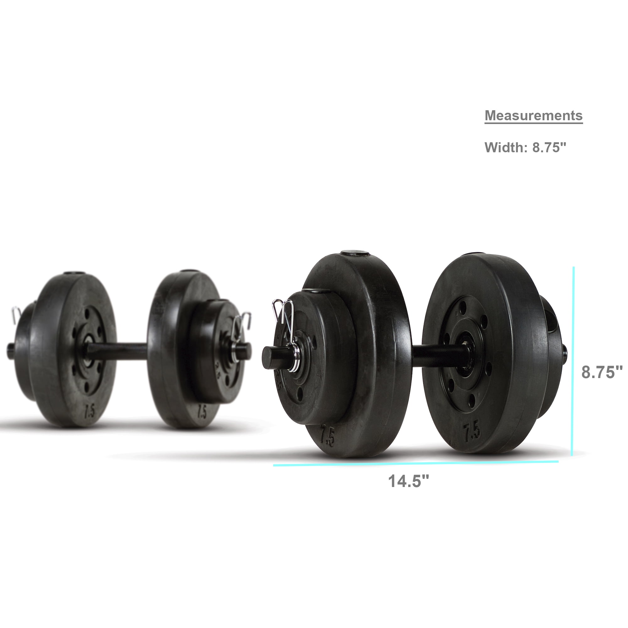 This Marcy Vinyl dumbbell set will make a useful addition to most any home gym. Its robust composition and sturdy construction will ensure durability and long-term use. The set includes two dumbbell handles and a total of eight black plates, four of 7.5 lbs and four of 2.5 lbs. This 40 lb dumbbell set also includes four spring clip collars for quick and easy weight adjustments.