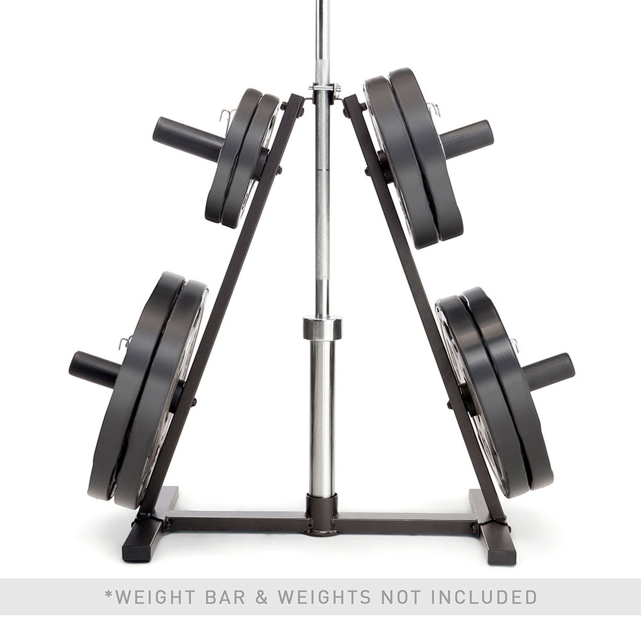 The Marcy A-Frame Olympic Weight Plate Tree and Vertical Bar Holder PT-5740 brings a new level of organization to your home gym. The A-frame style of plate tree minimizes the amount of space you need to store up to 300 pounds of Olympic 2” diameter weight plates. The 4 pegs allow you to organize a wide variety of weight plates. In addition, the unique design of the Marcy A-Frame Olympic Weight Plate Tree and Vertical Bar Holder PT-5740 allows you to store your Olympic Bar at the center of your plate tree. Organize your home gym while saving space and cleaning up your workout area with the PT-5740.